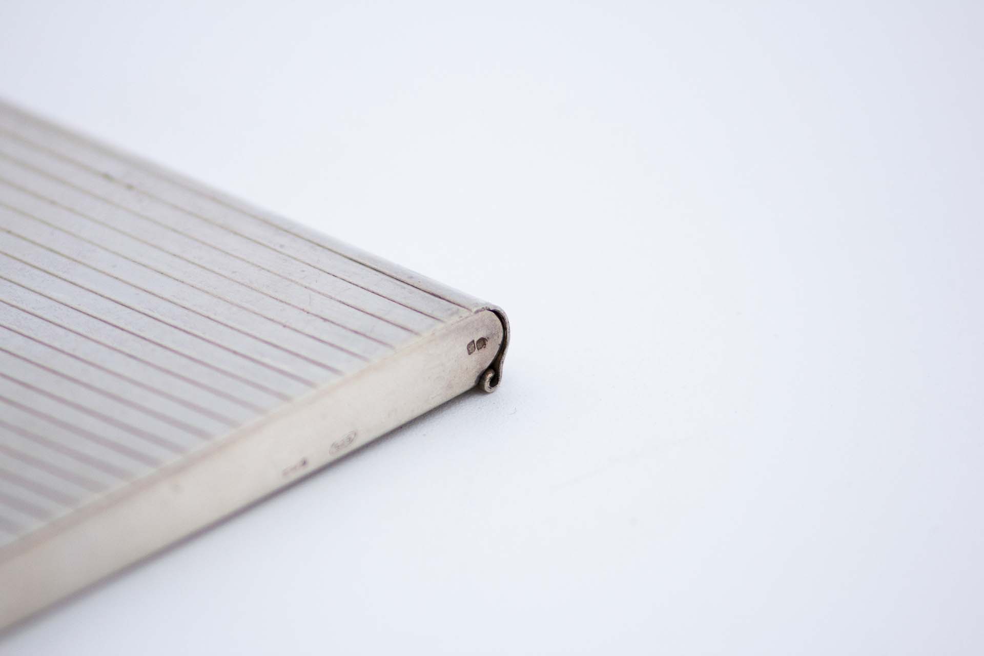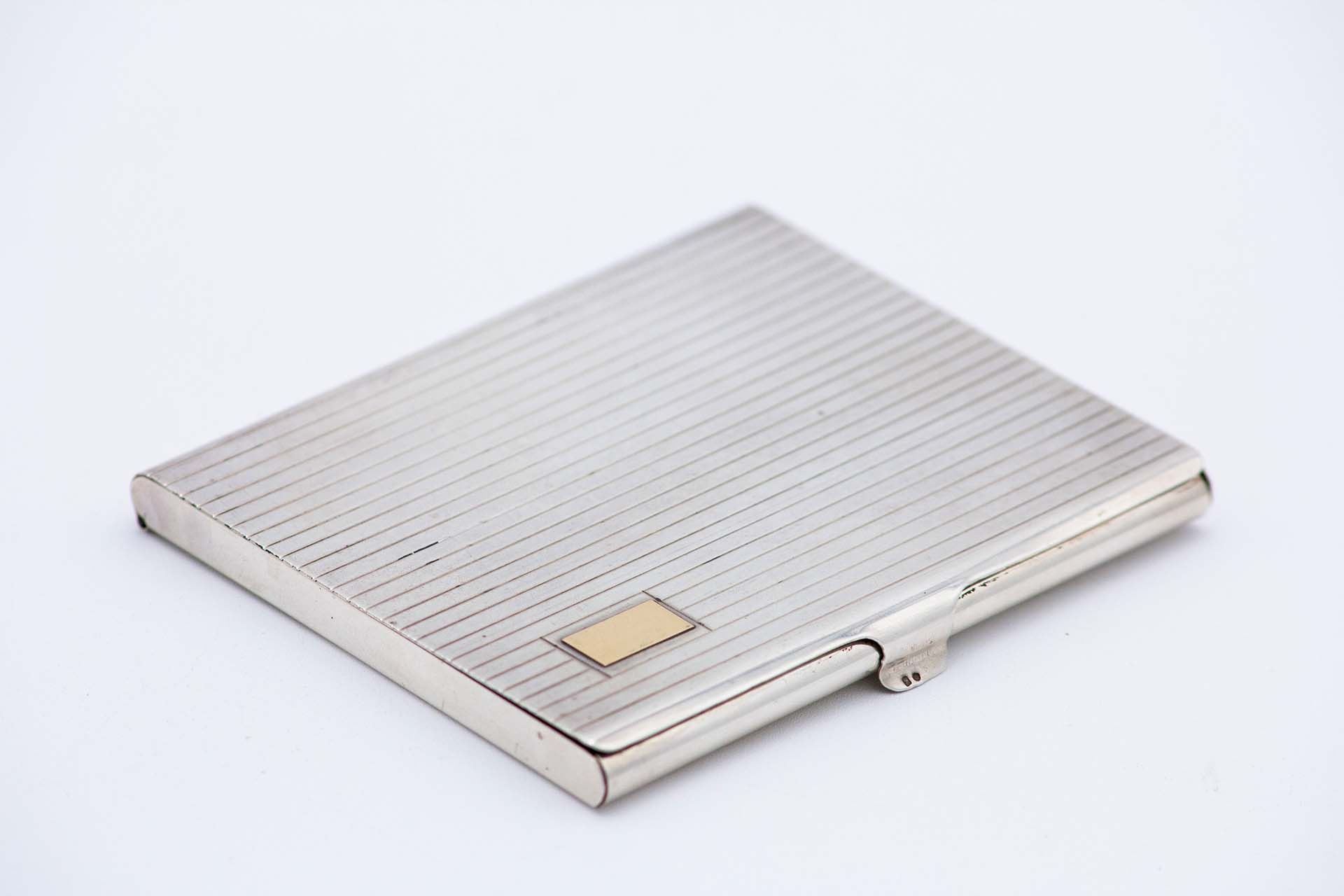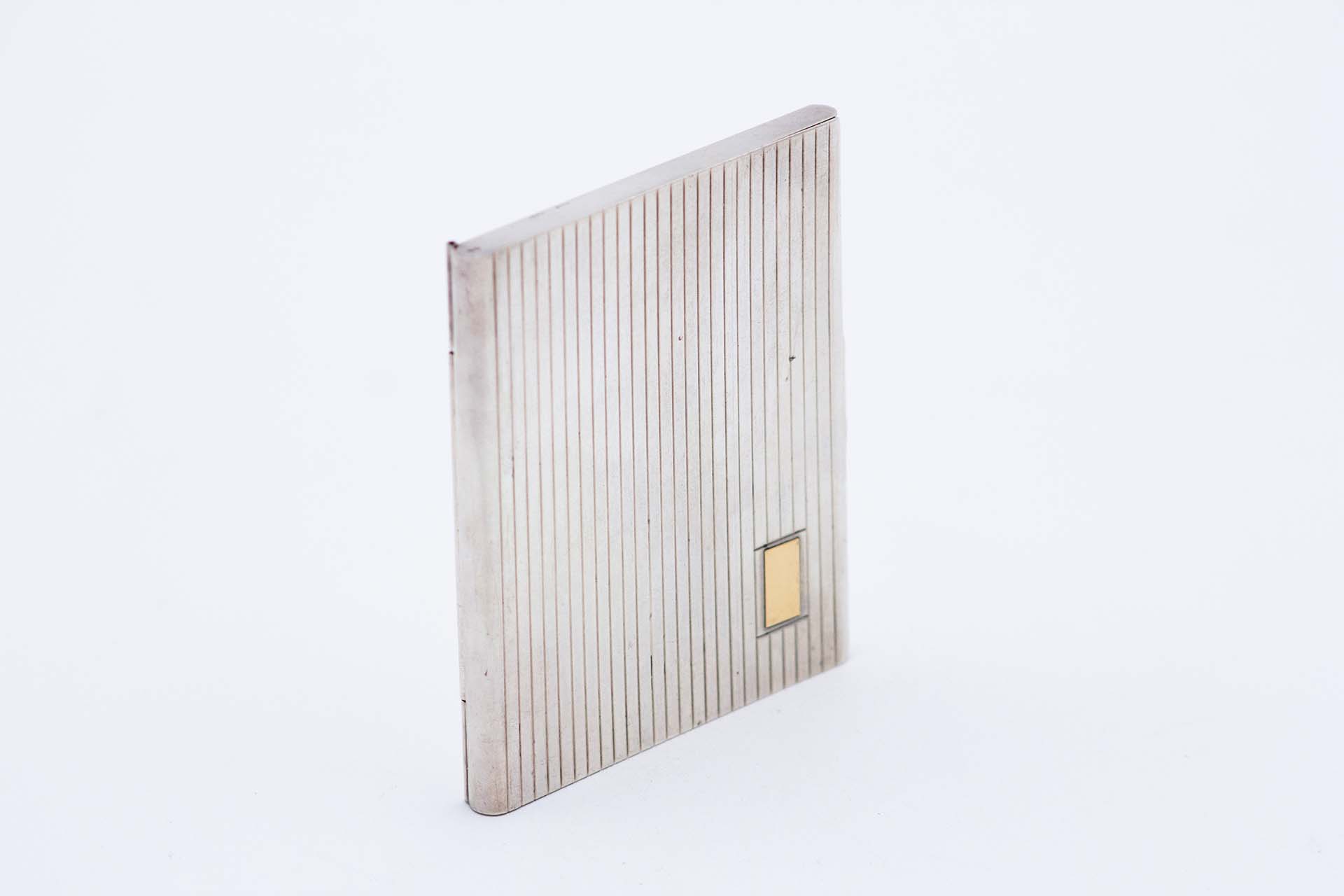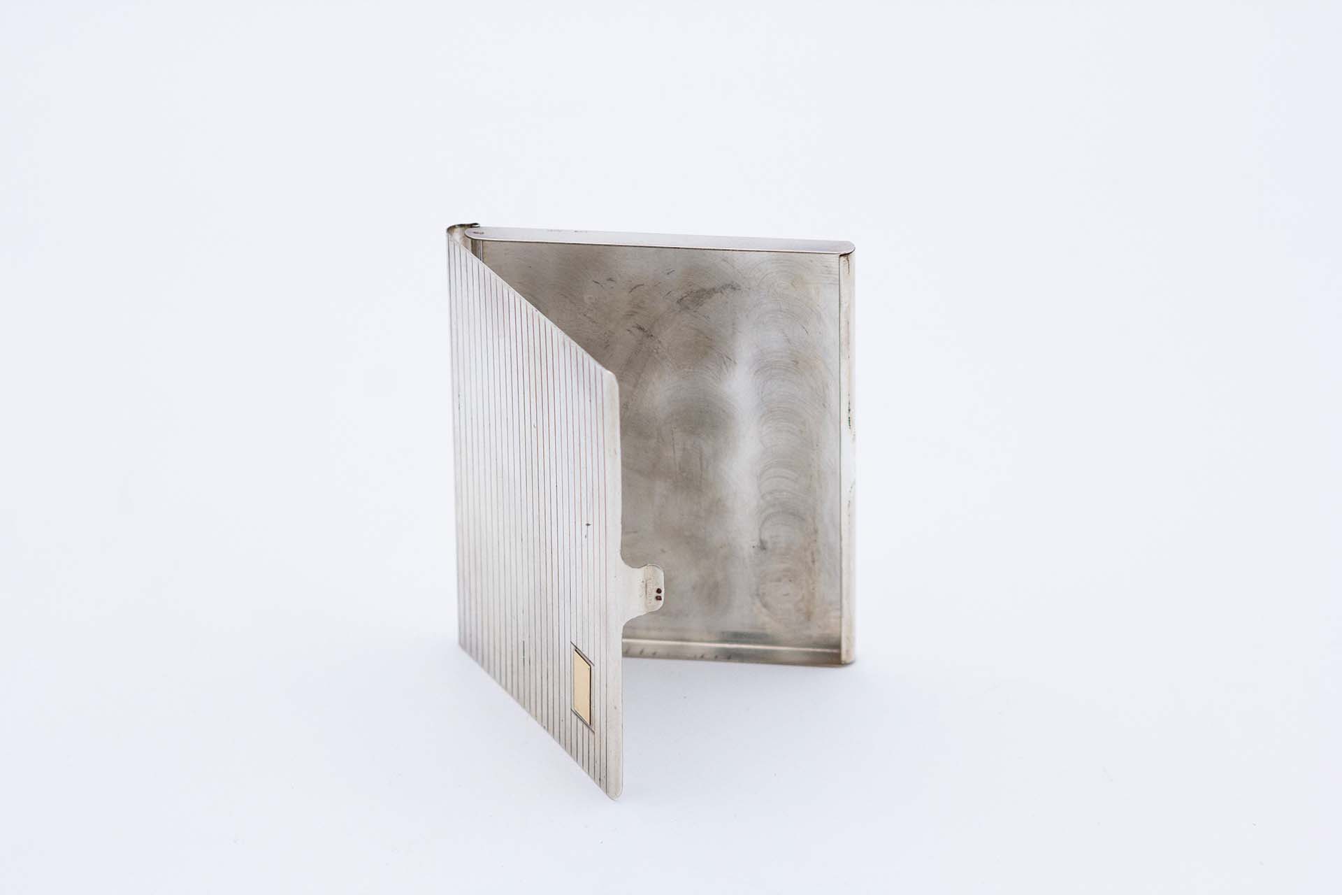 • Descrição: Cartoneira de prata com bandas ao alto na tampa e cartela dourada para monograma.