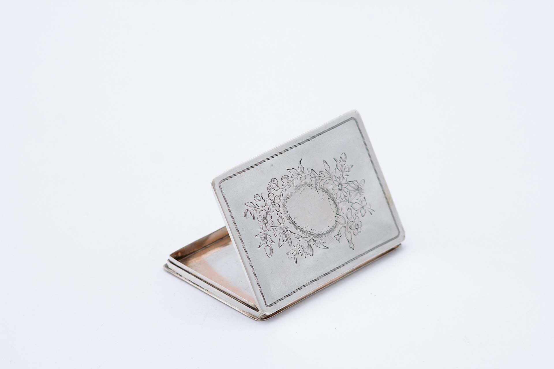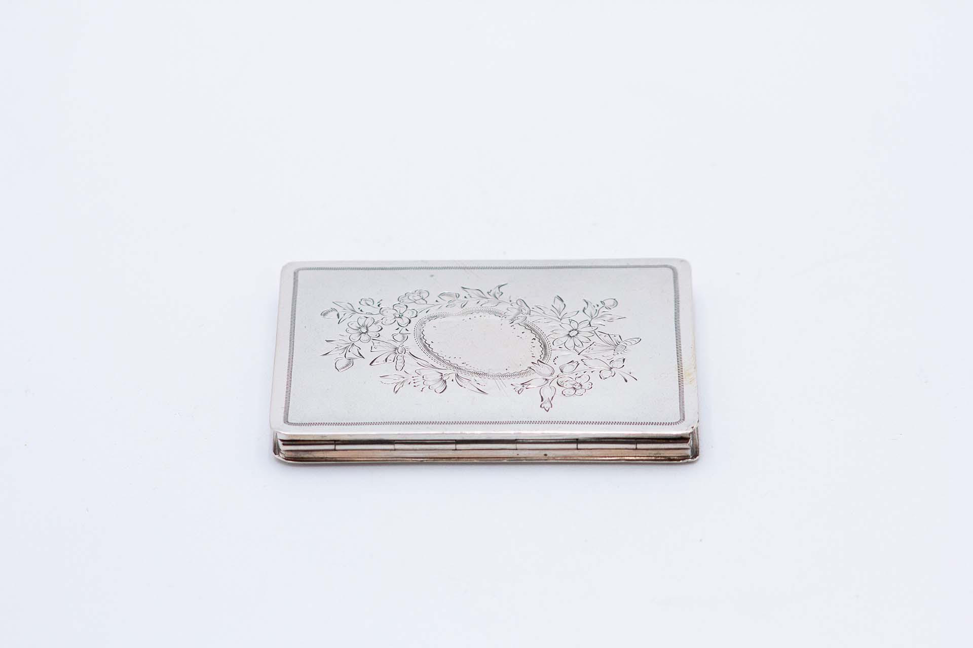 • Descrição: Cartoneira de prata de forma retangular com motivos florais gravados envolvendo cartela para monograma.