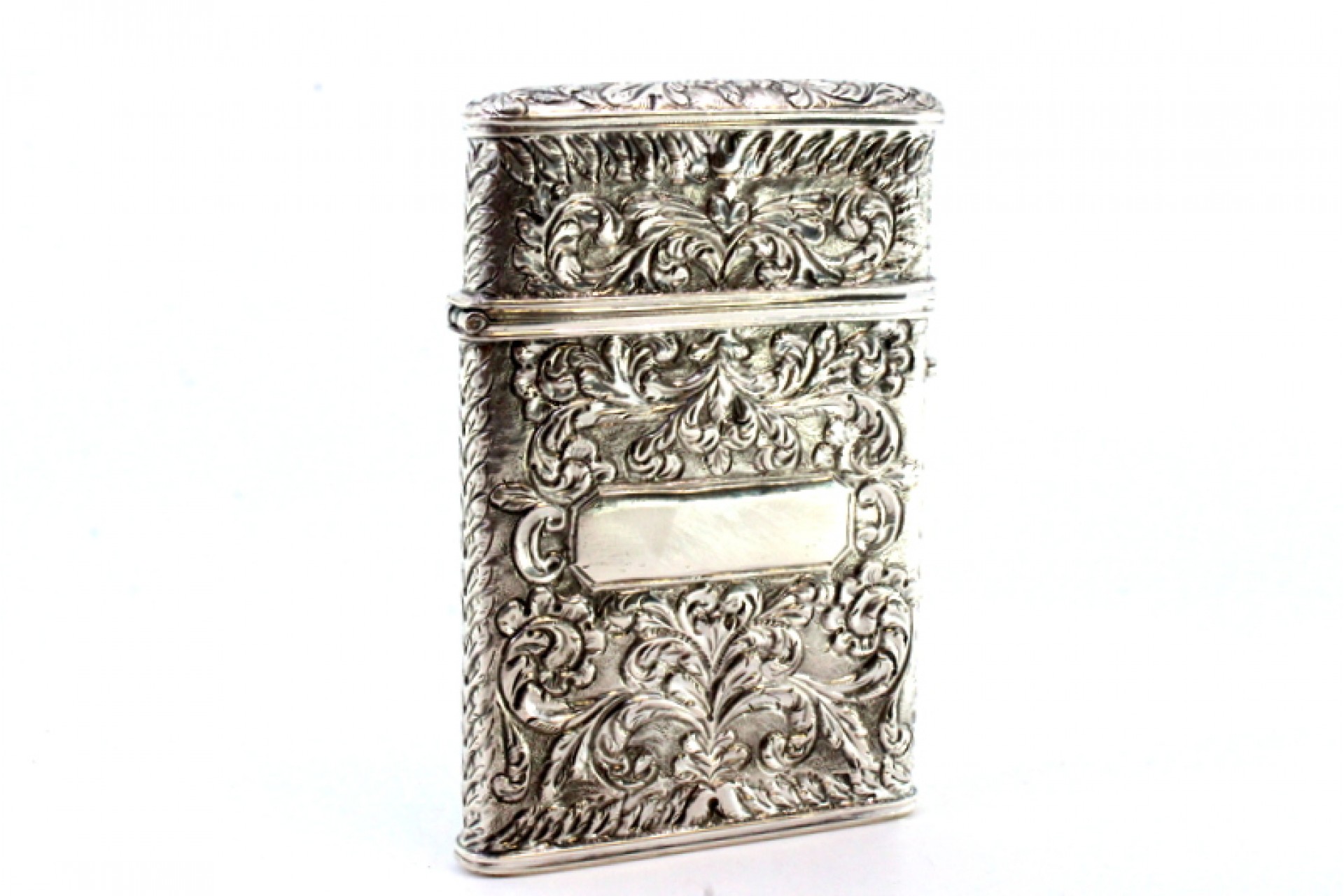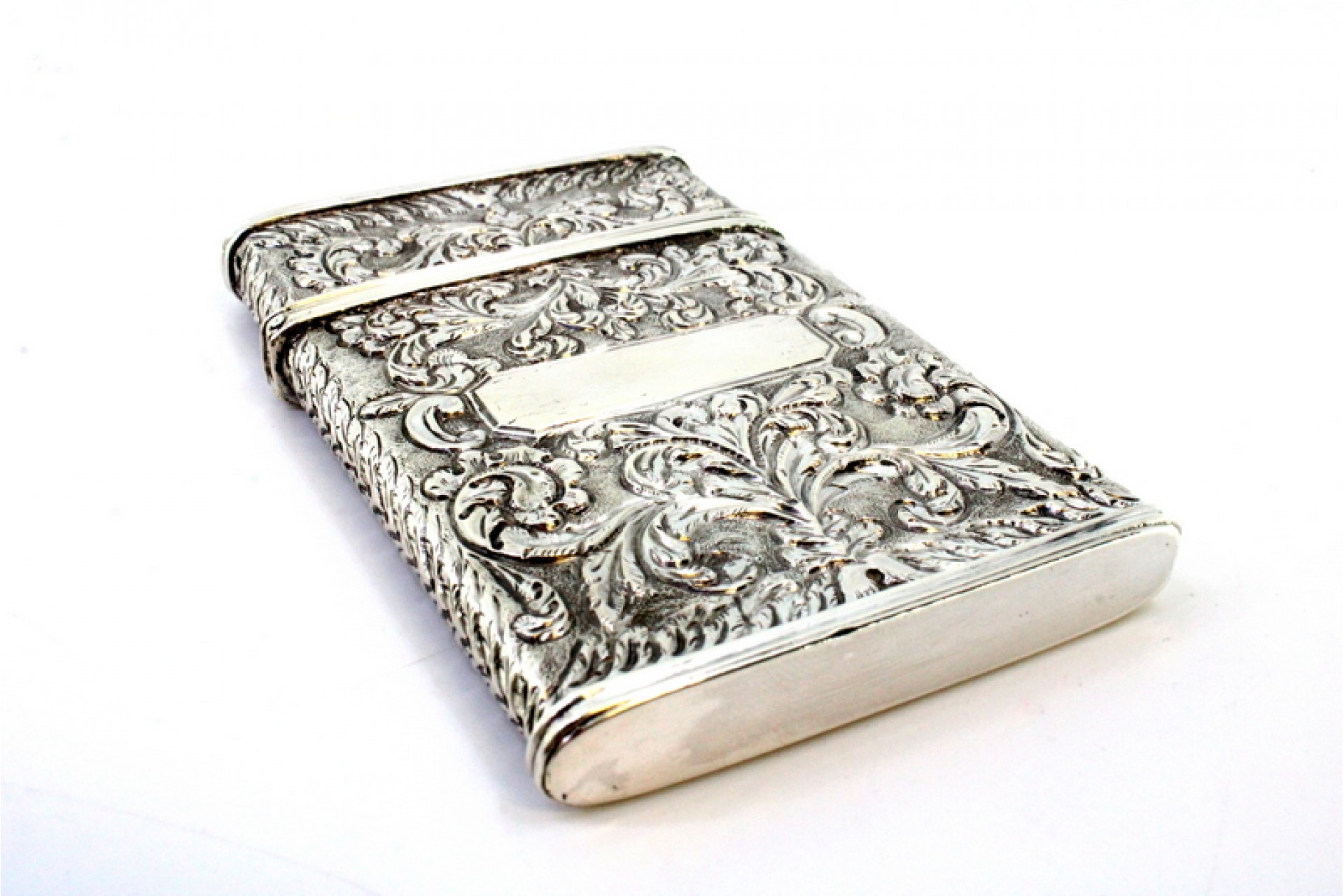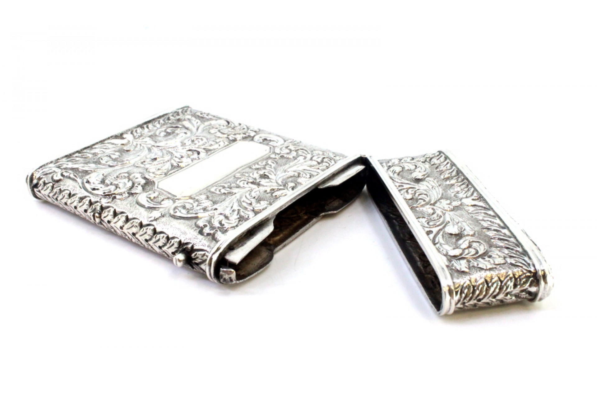 • Descrição: Cartoneira em prata com motivos florais revelados, cartelas para monogramas e tampa basculante.