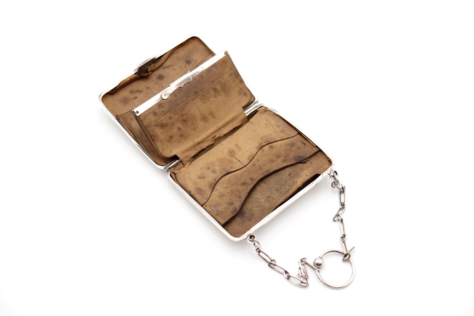 Cartoneira em prata guilhochada com corrente de suspensão e interior em pele