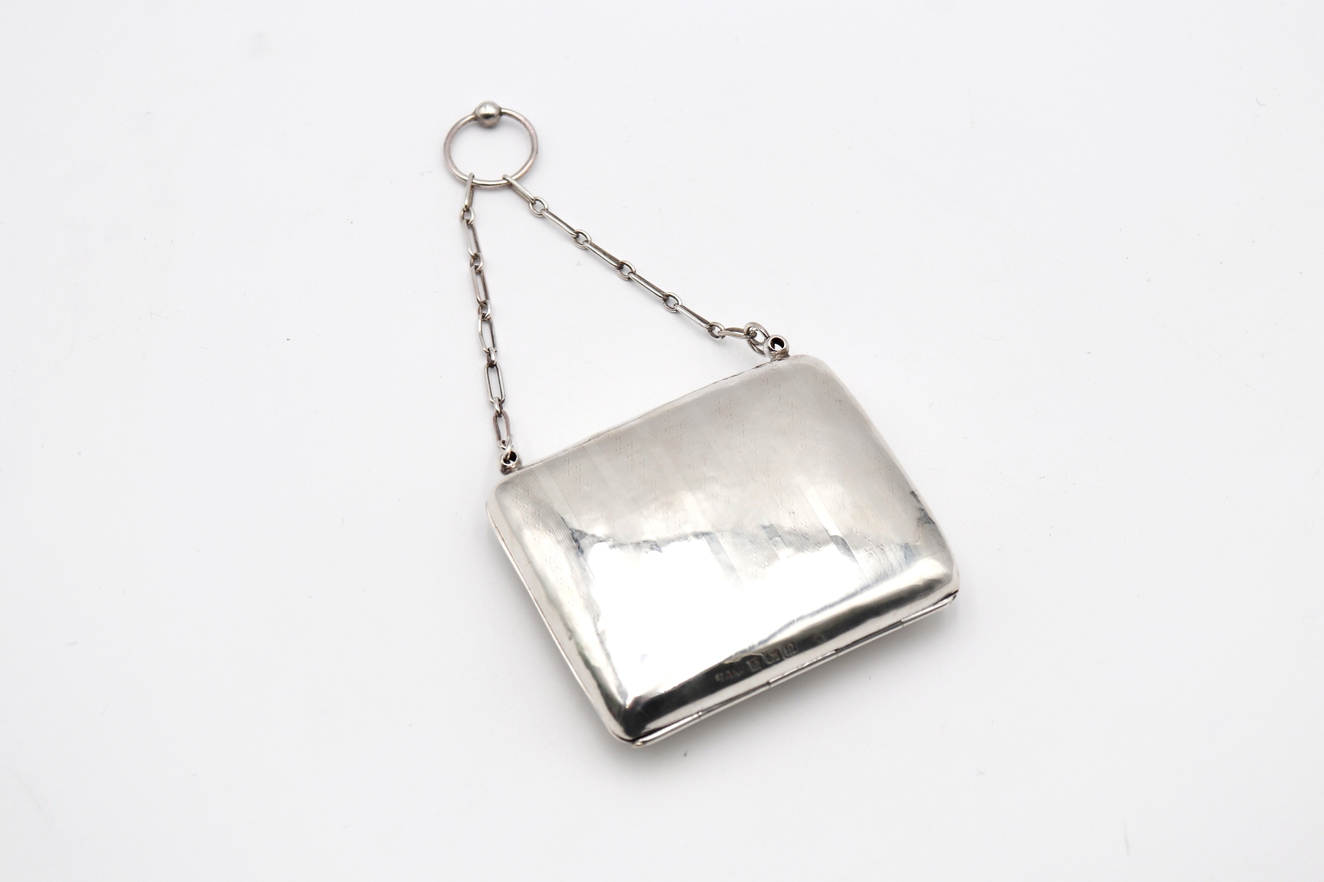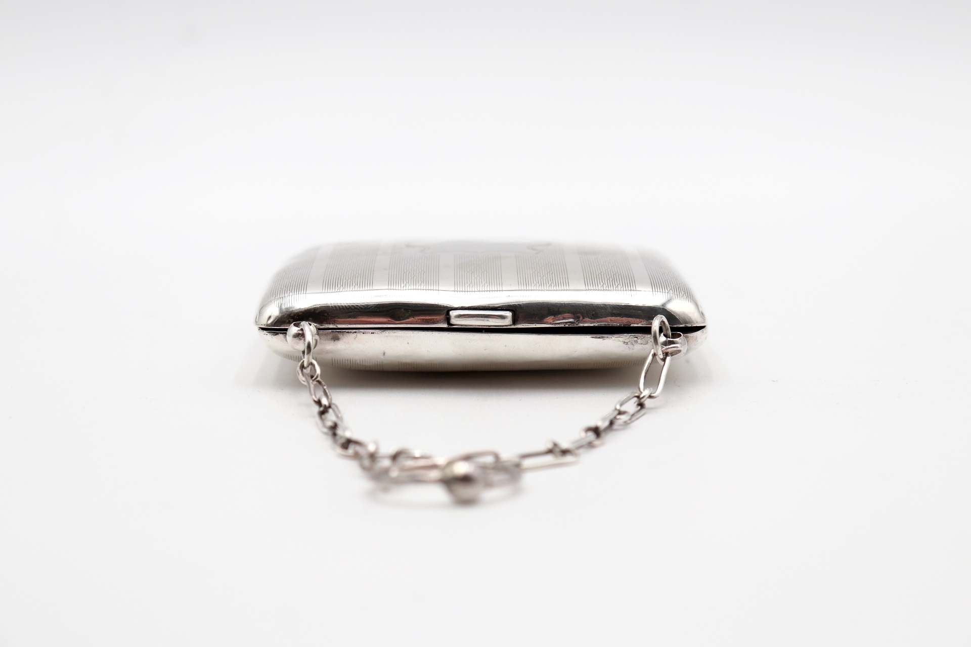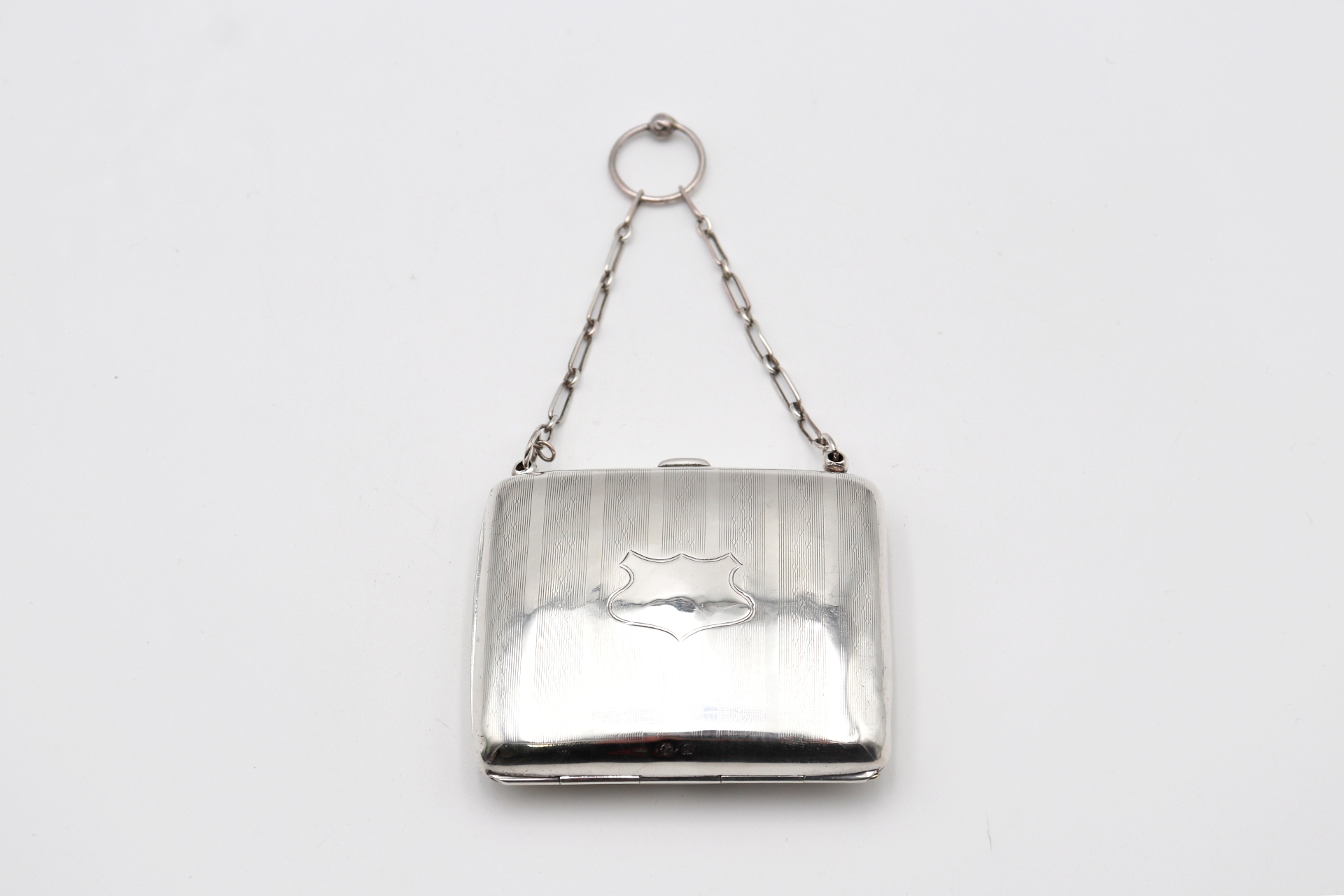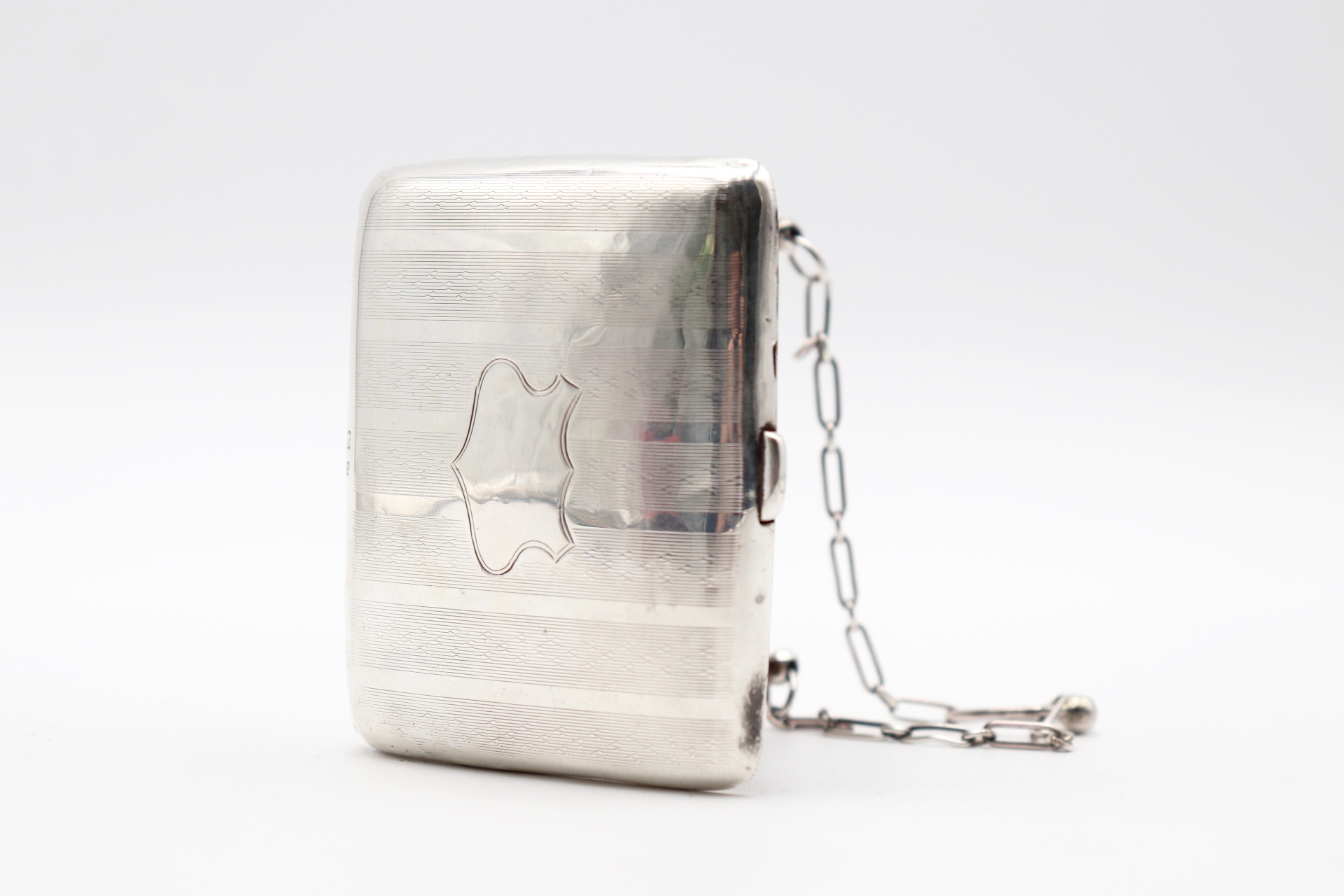 • Descrição: Cartoneira em prata guilhochada com corrente de suspensão e interior em pele.