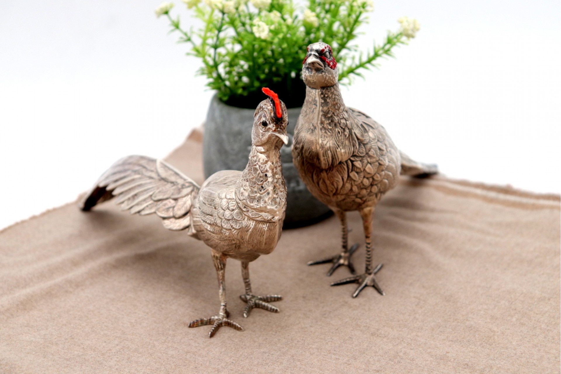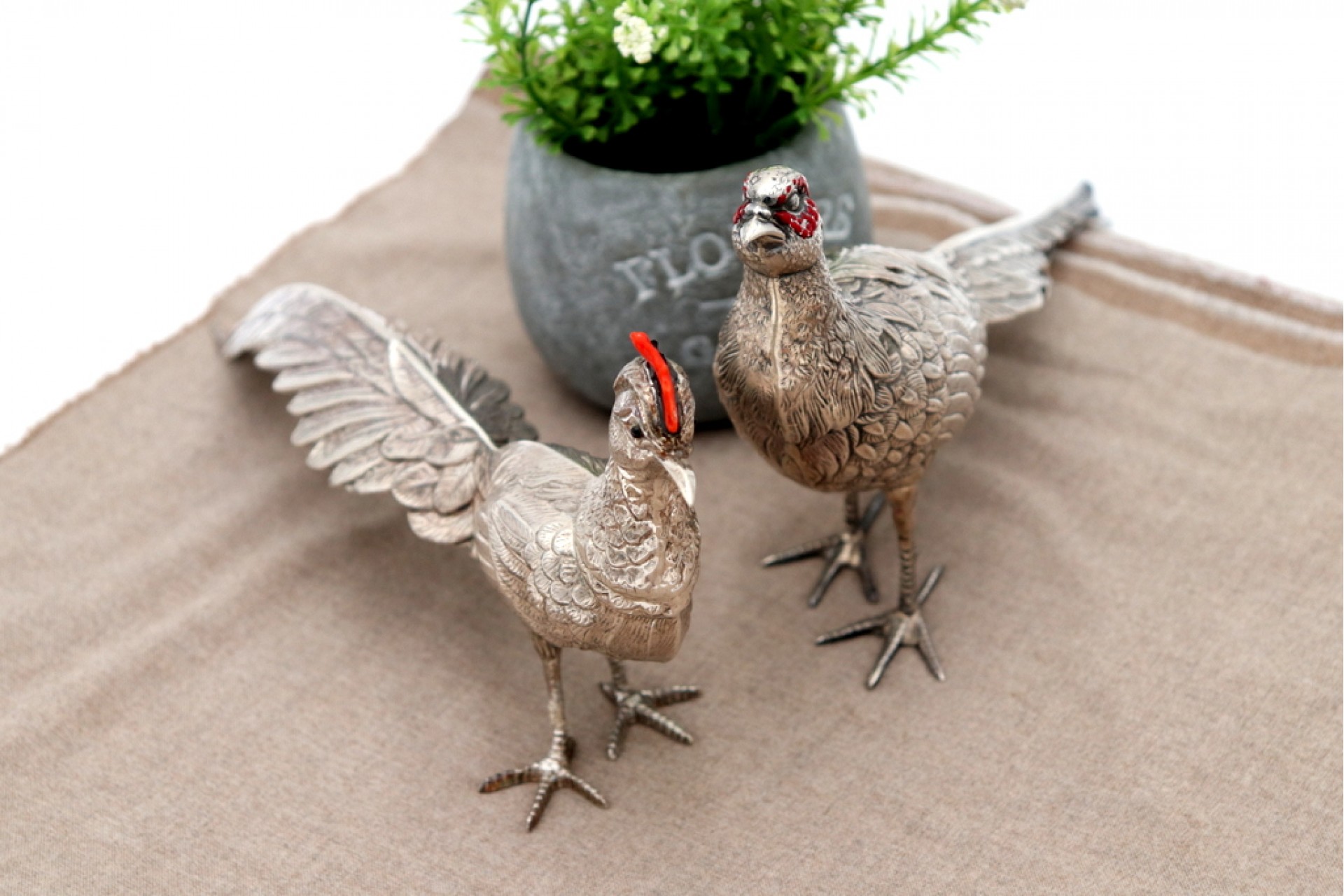 • Descrição: Casal de faisões em prata cinzelada profusamente relevados com crista e olhos destacados.