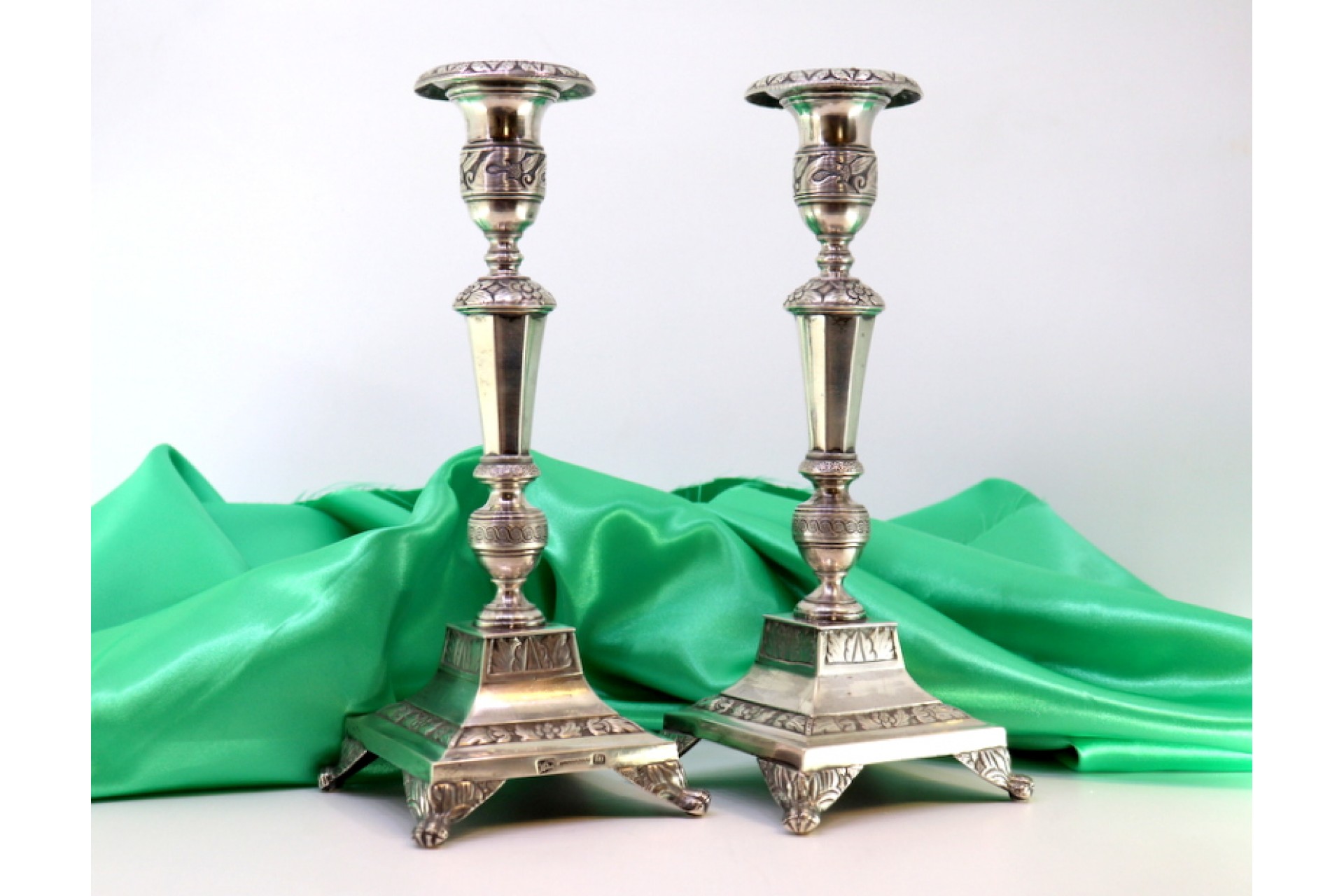 • Descrição: Castiçais de prata com fustes torneados com motivos florais relevados e folhas de acanto,  assentes sobre bases quadradas com quatro pés em forma de garras.