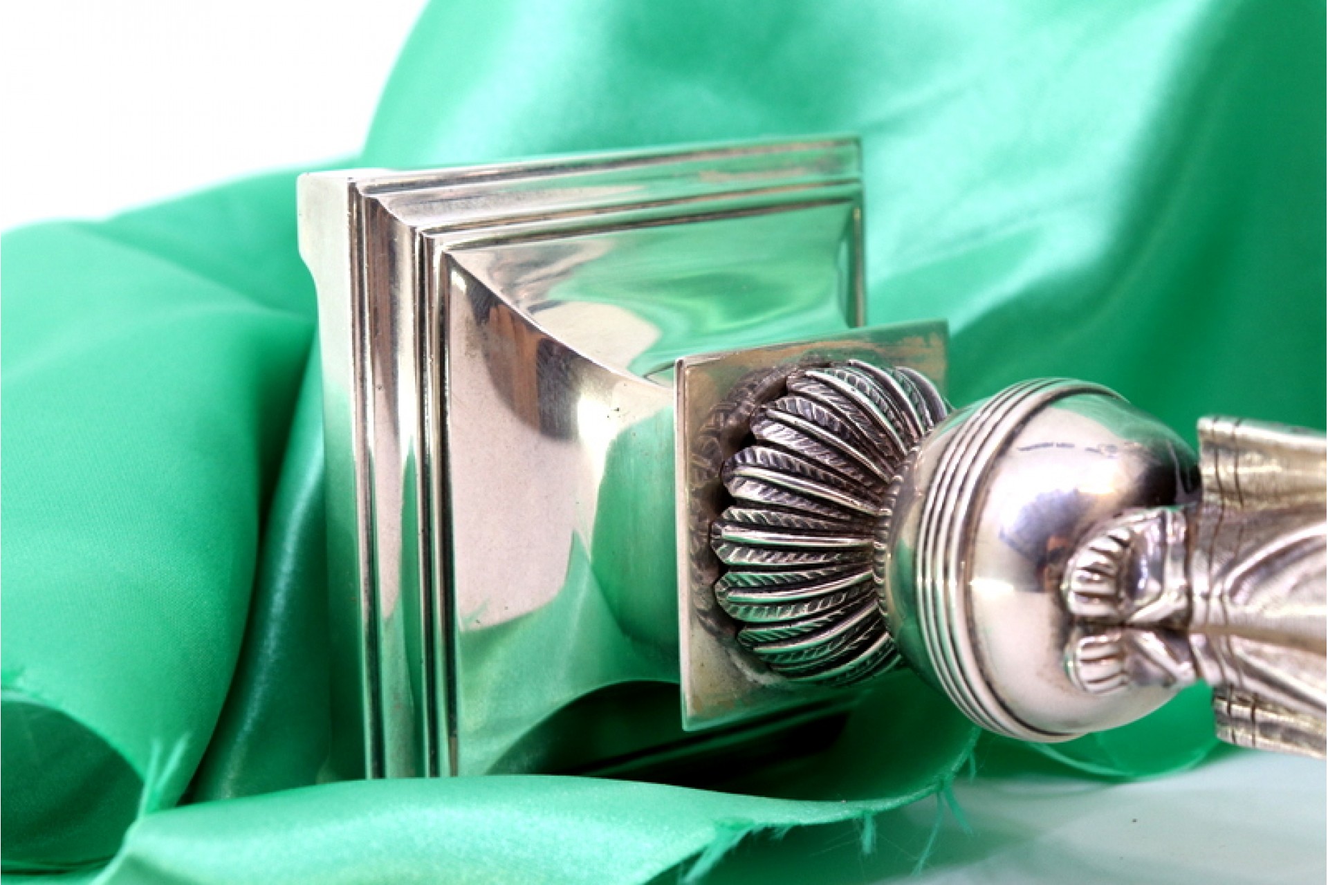 Castiçais em prata com figuras angélicas em vulto perfeito sobre pedestral