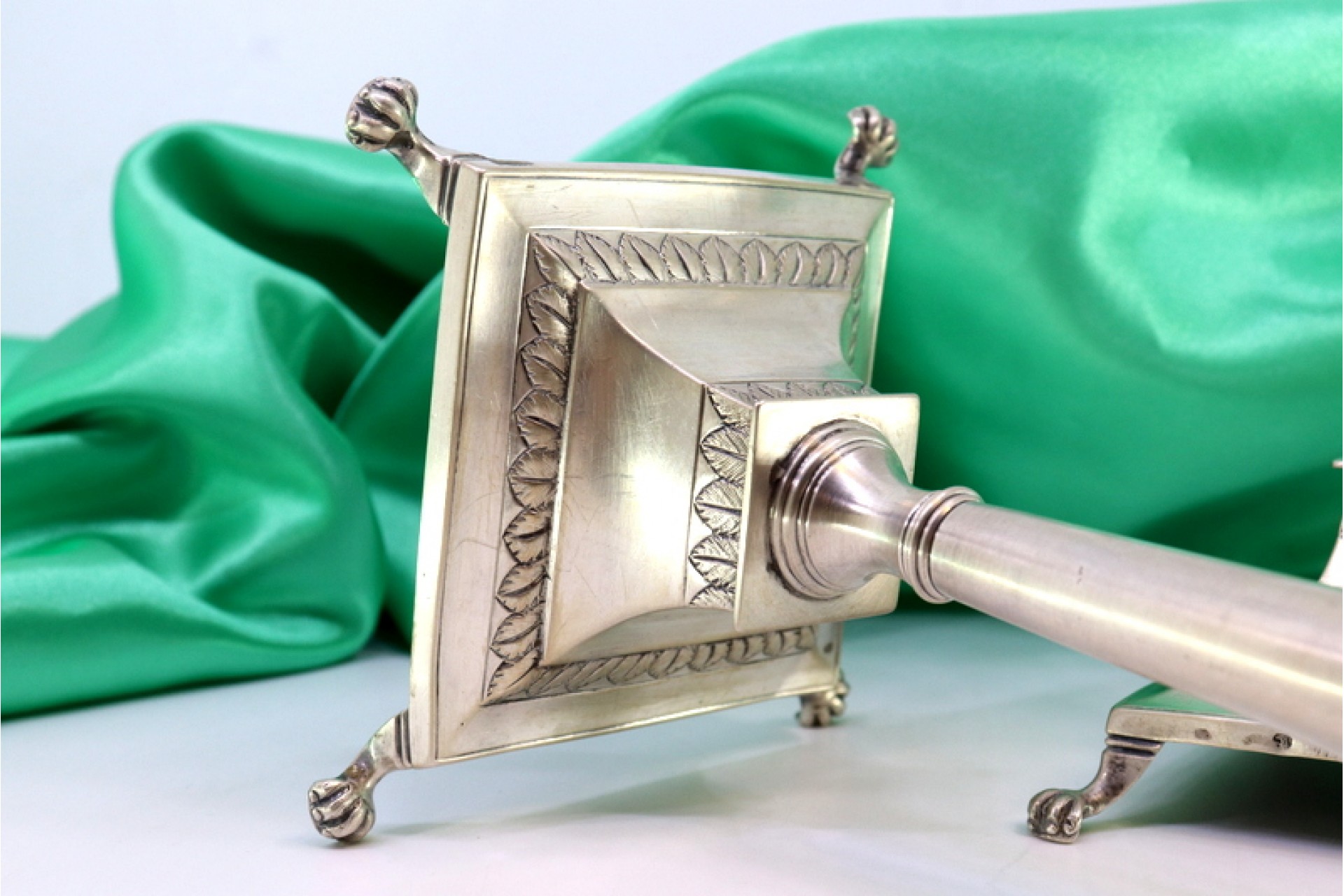 • Descrição: Castiçais em prata com relevos e assentes em bases quadradas com quatro pés em forma de garras.