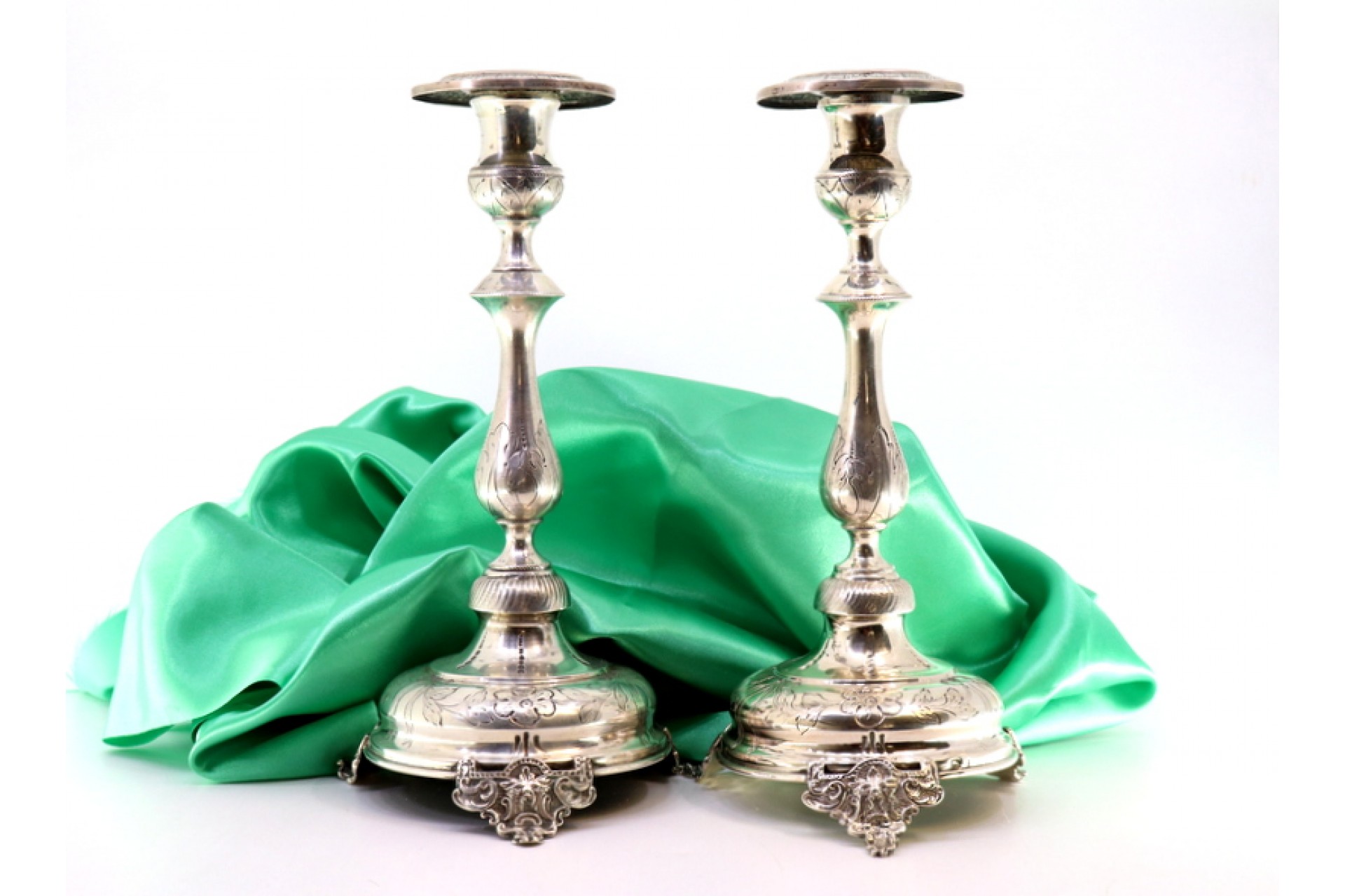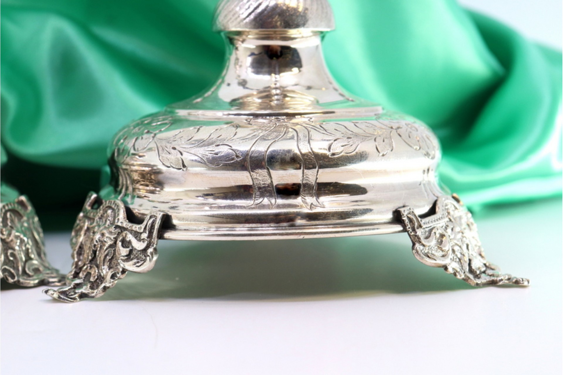 • Descrição: Castiçais em prata com motivos florais gravados, bases circulares e assentes em três pés relevados.