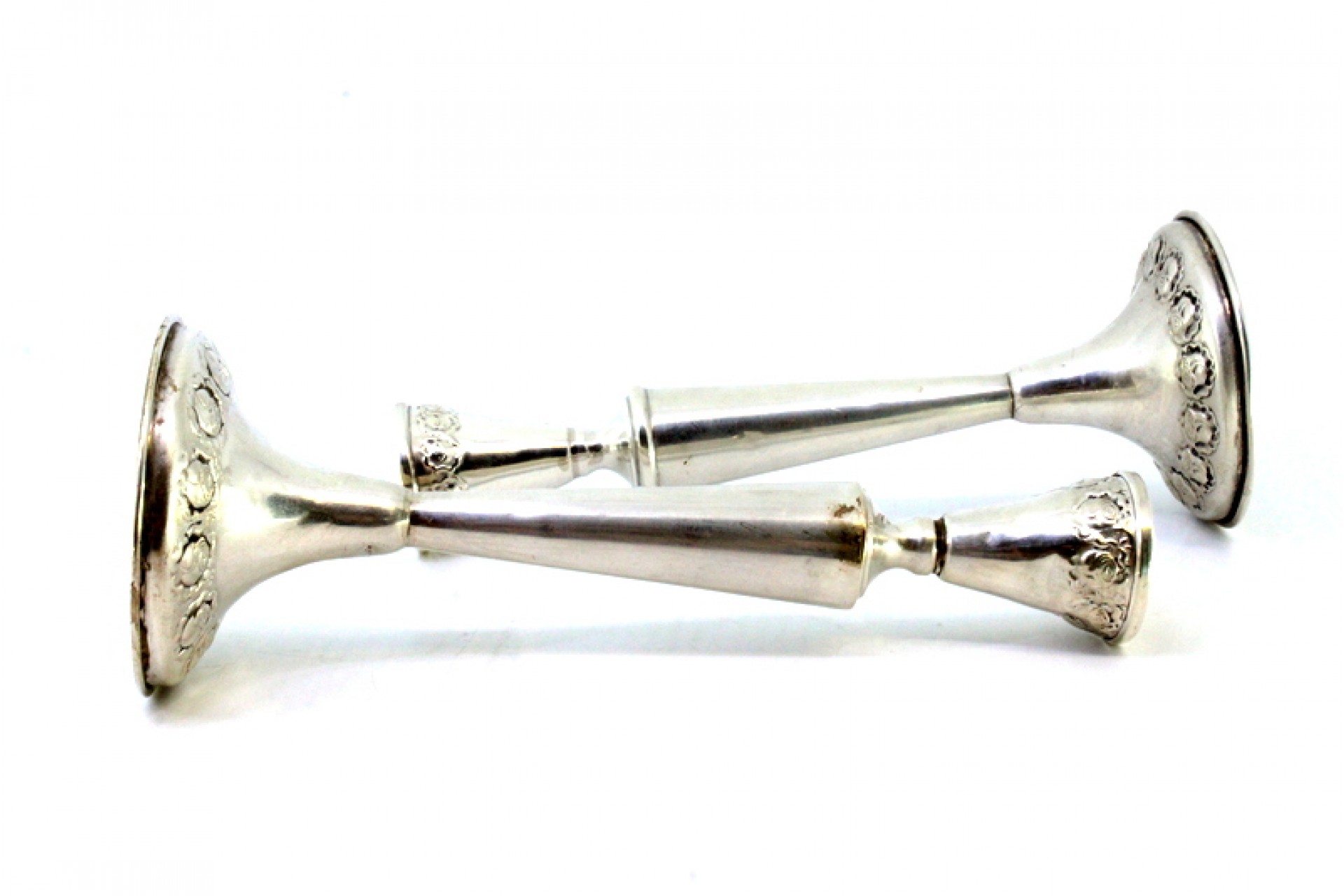 Castiçais em prata com relevos florais na base e friso