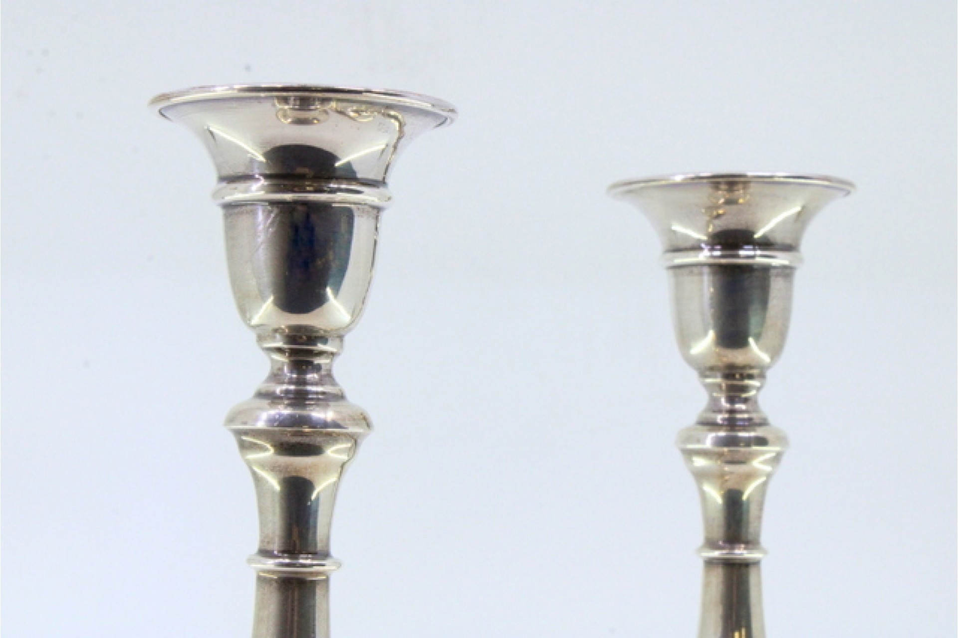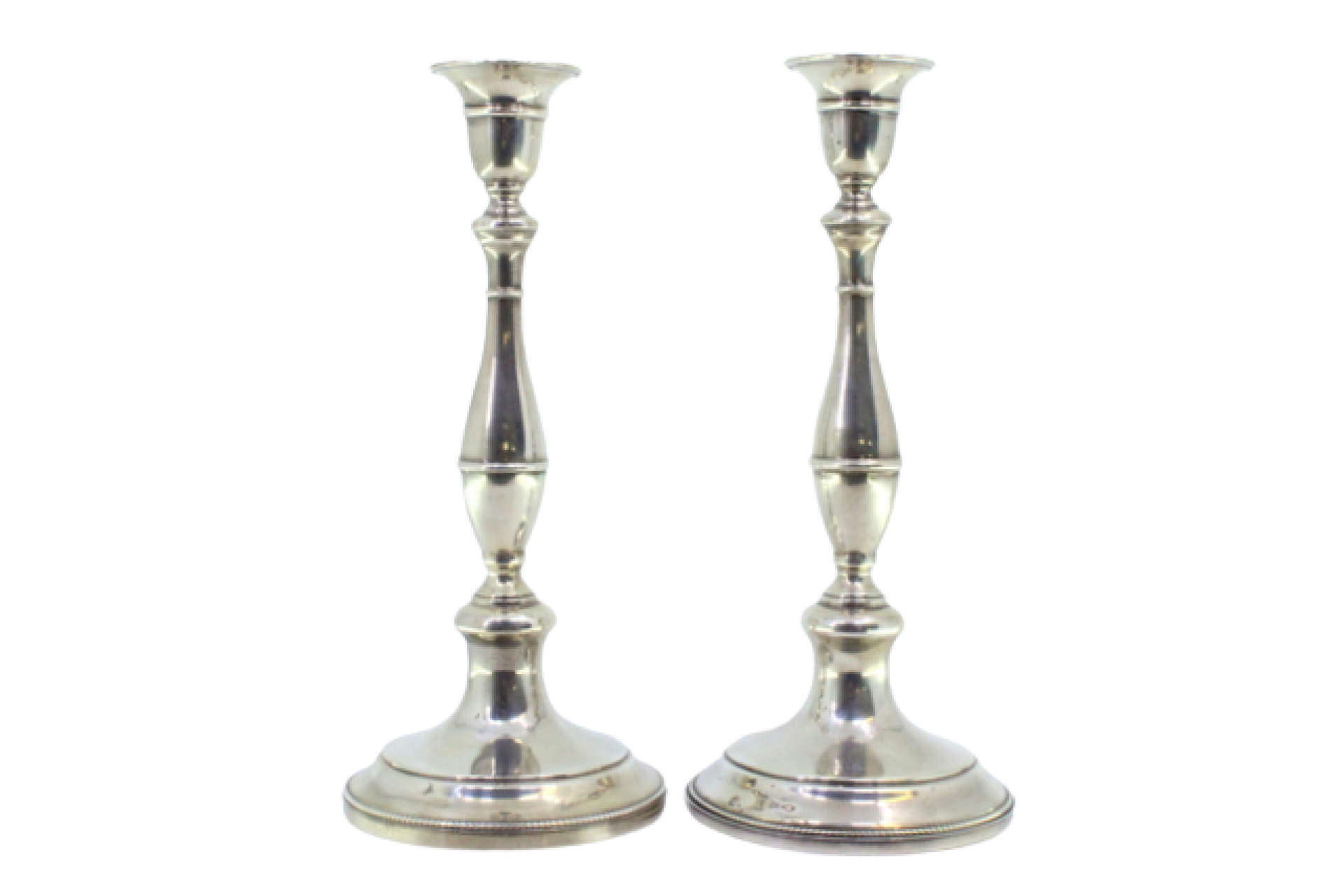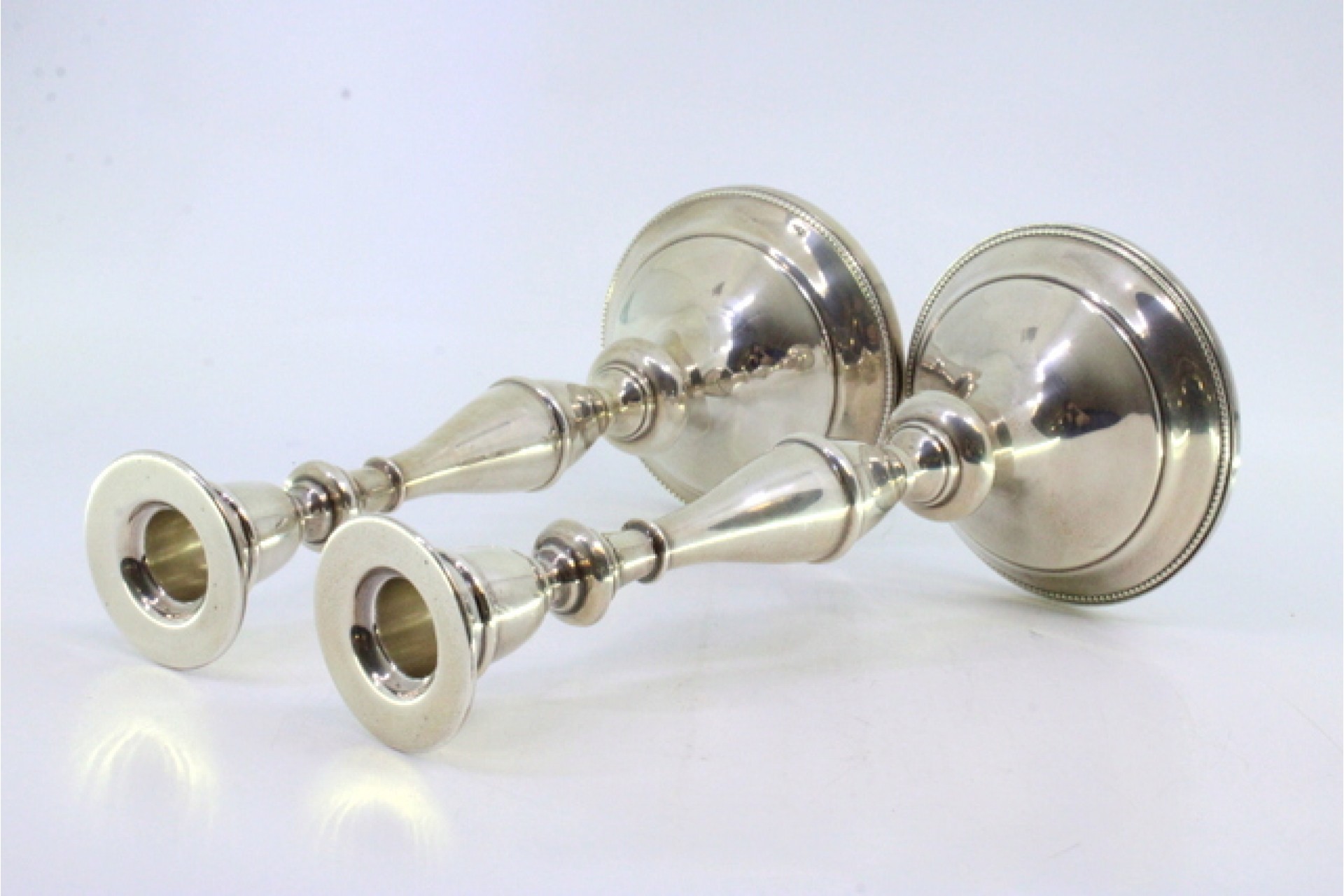 • Descrição: .Castiçais em prata com os fustes lisos assentes em bases circulares com frisos perlados.