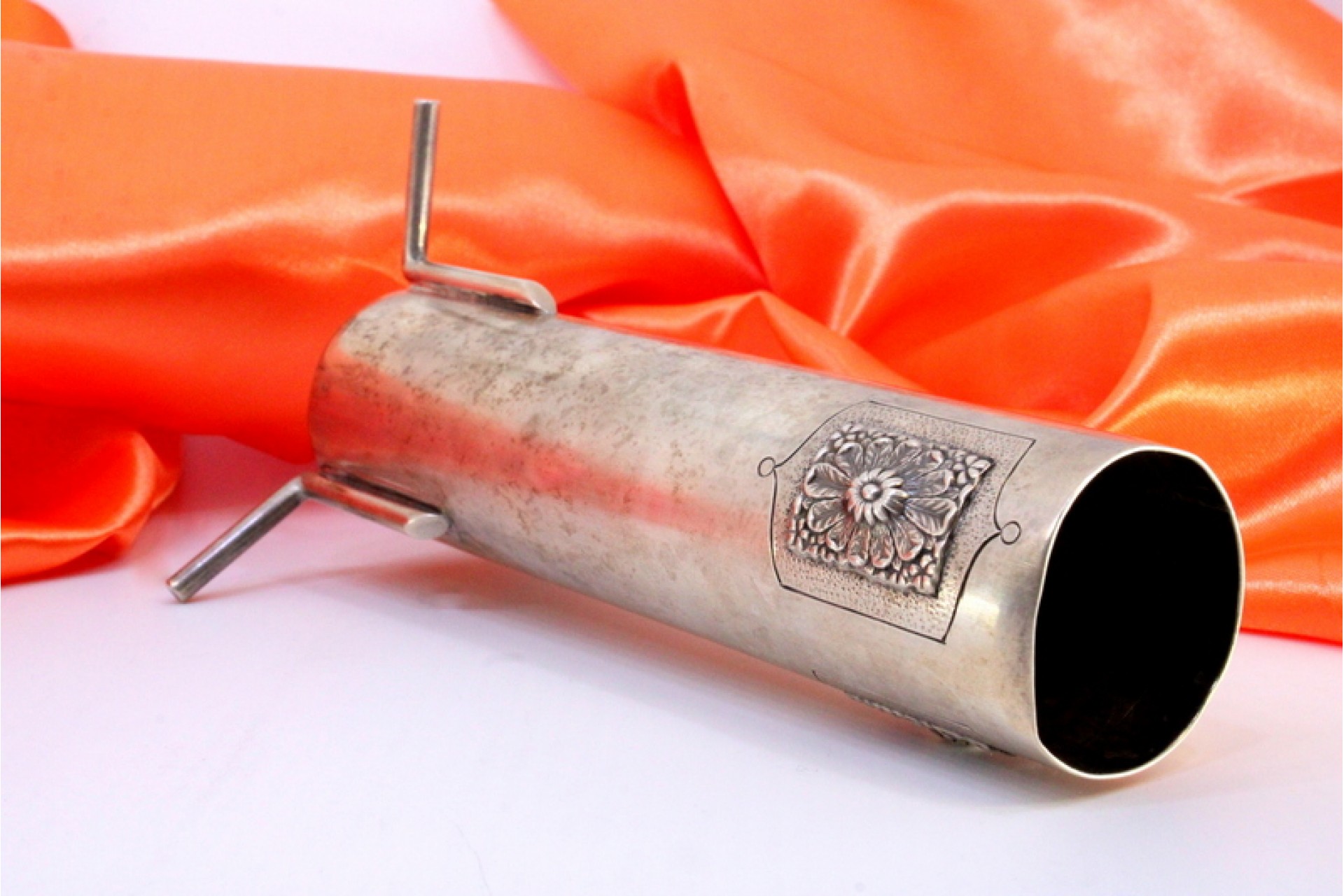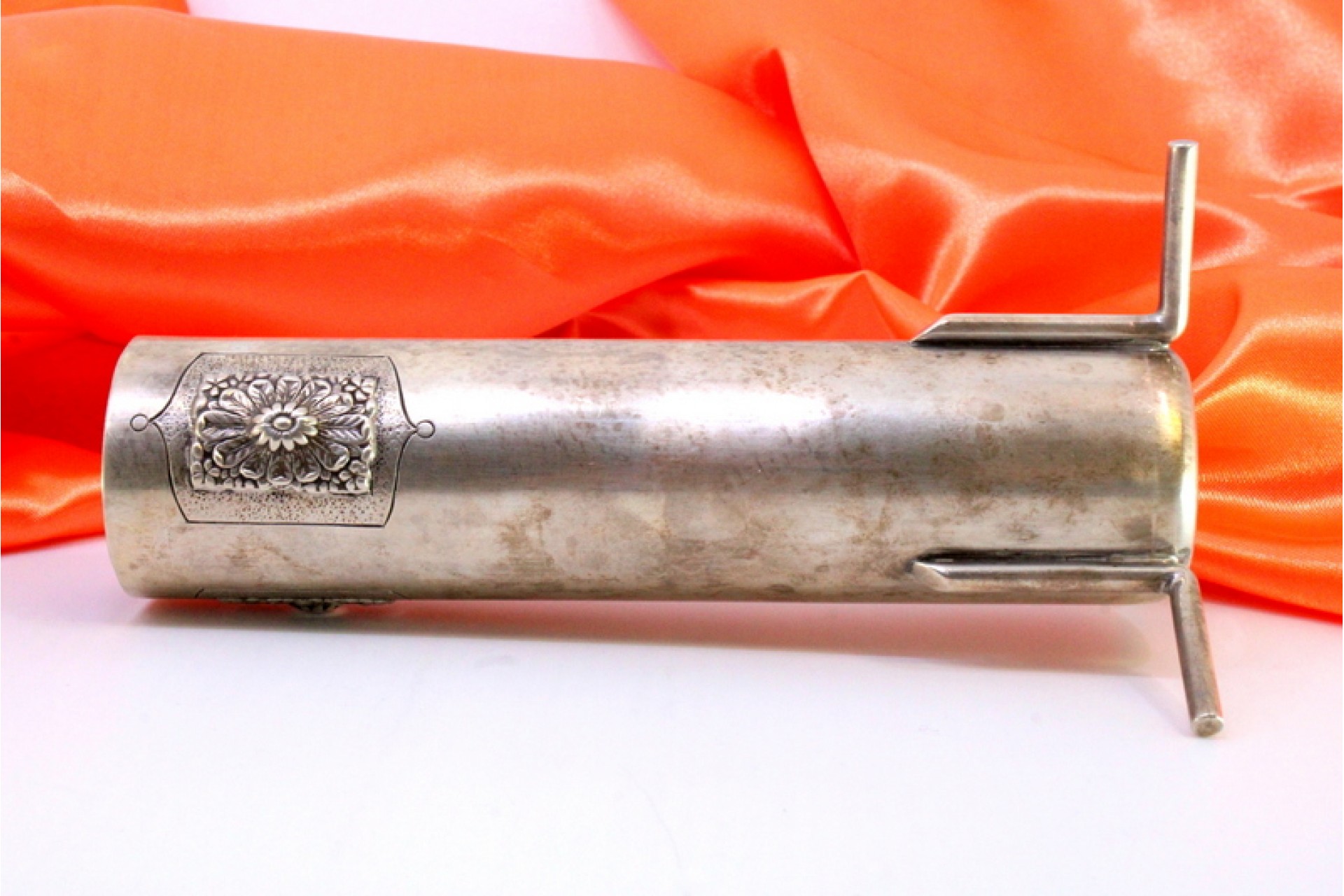 • Descrição: Castiçal em prata com relevos emoldurados e assente em três pés lisos.