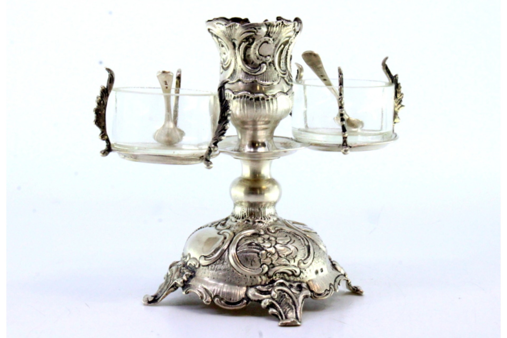 • Descrição: Castiçal em prata relevada com saleiro e pimenteiro em vidro, com colheres e assente em quatro pés com enrolamentos