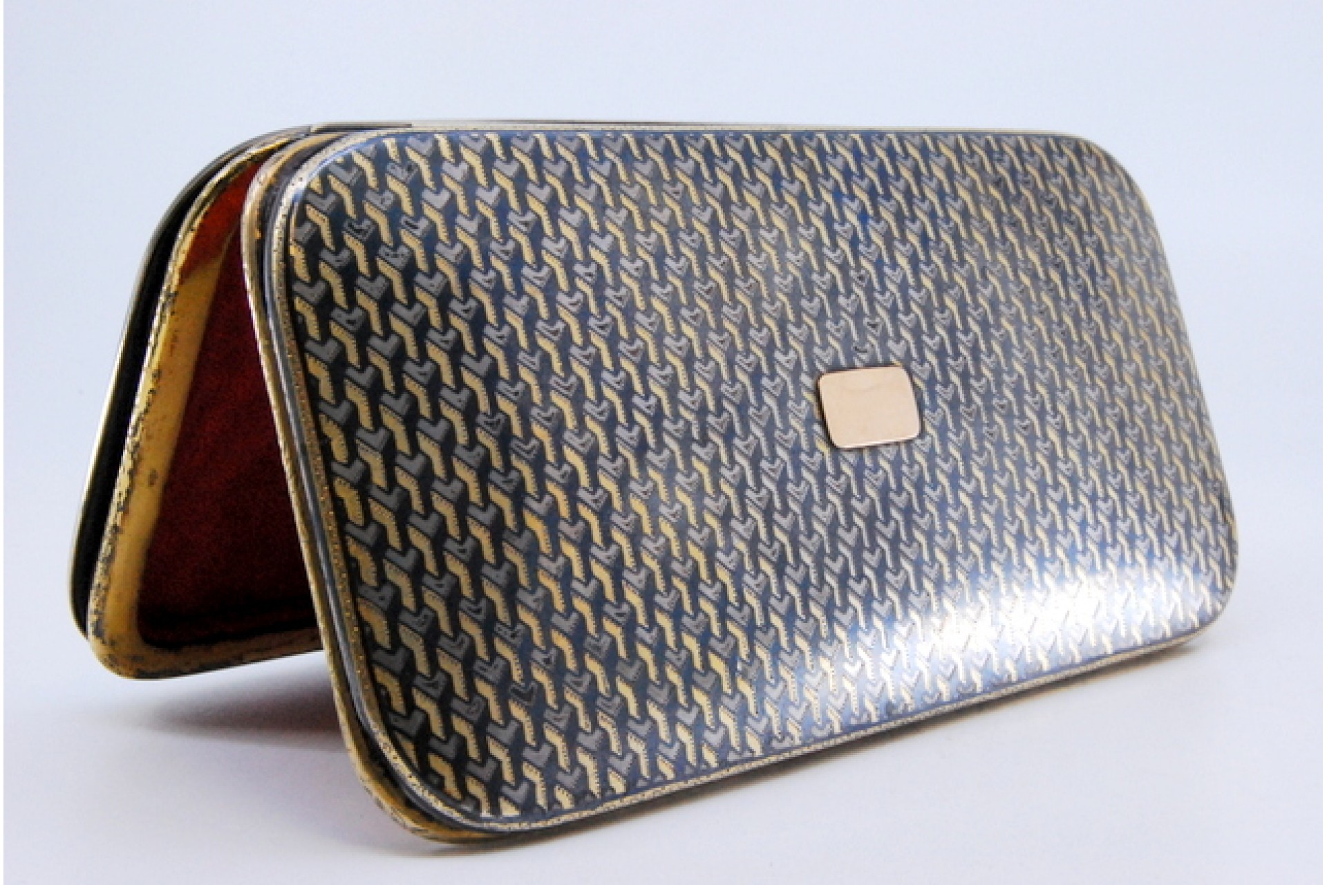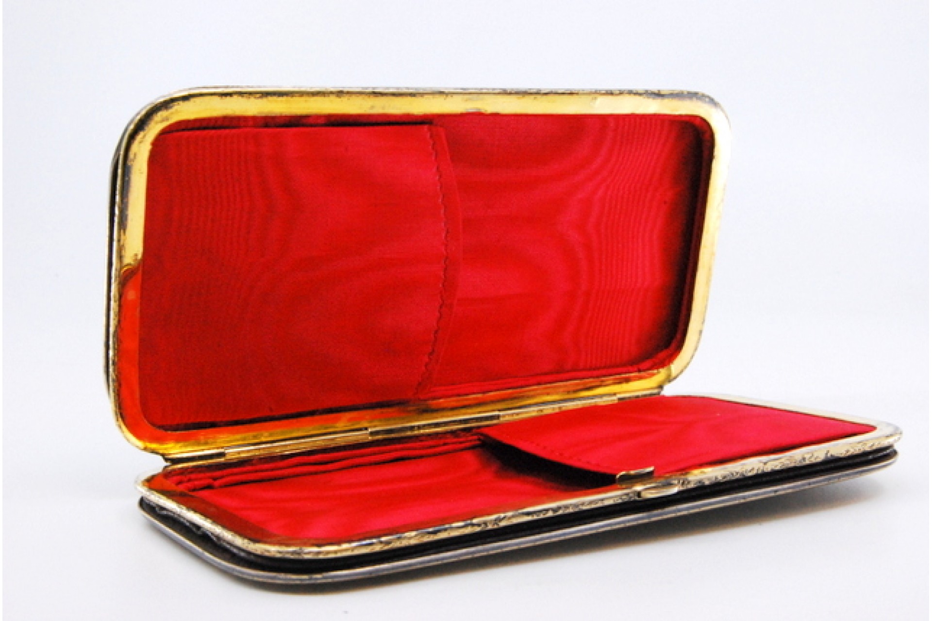 • Descrição: Charuteira em ouro e prata anielada com duas divisões em tecido vermelho e estojo original.