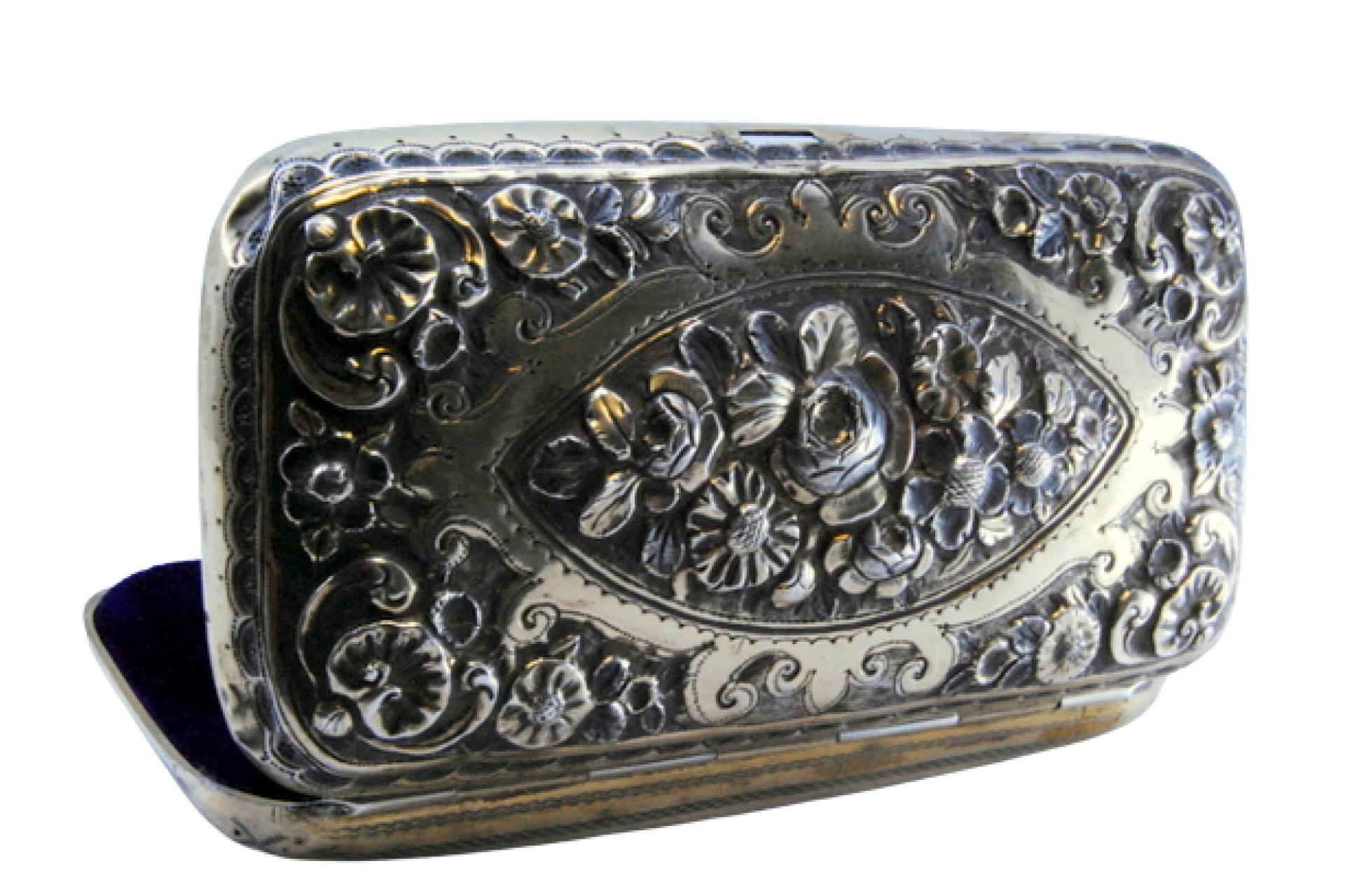 • Descrição: Charuteira em prata com relevos florais, verso guilhochado com desenhos assimétricos e interior aveludado.