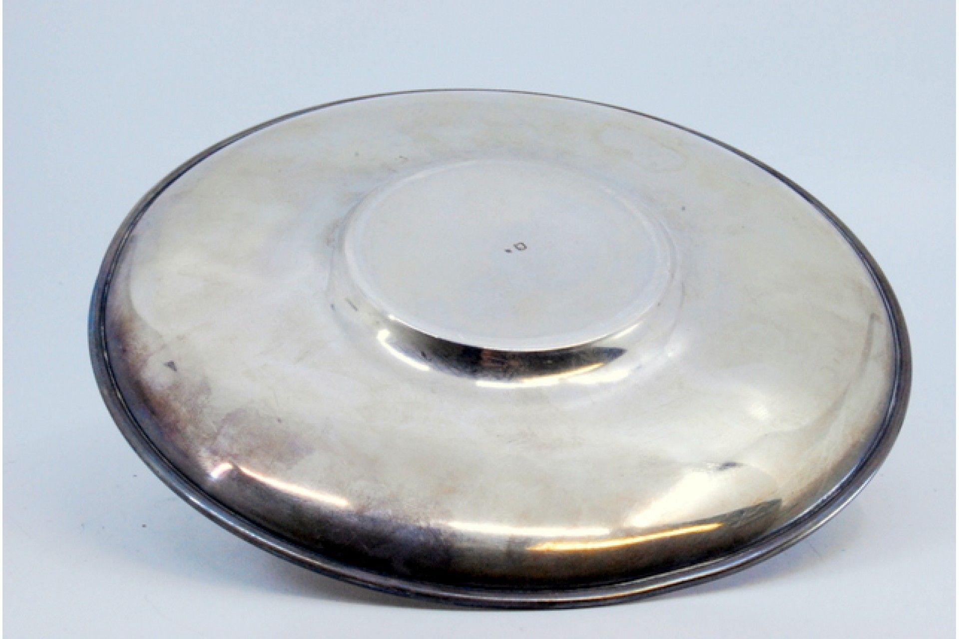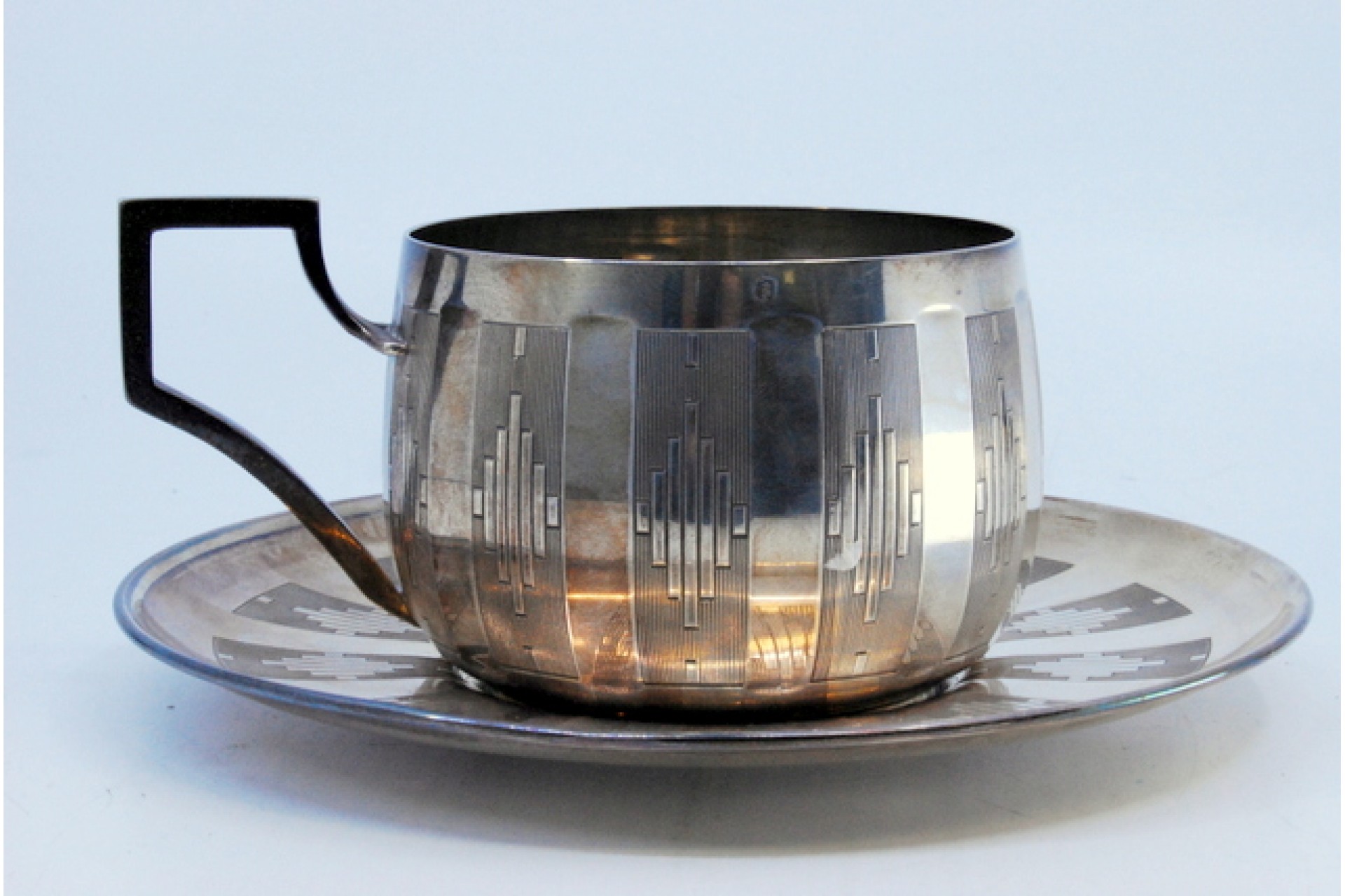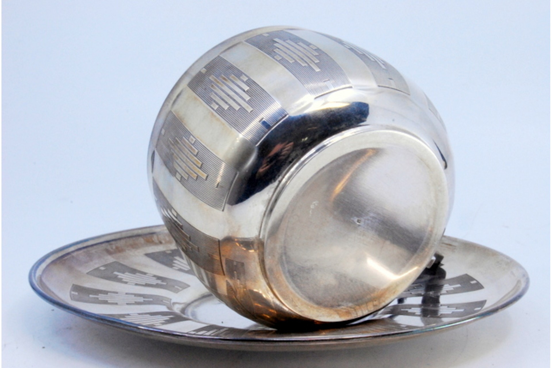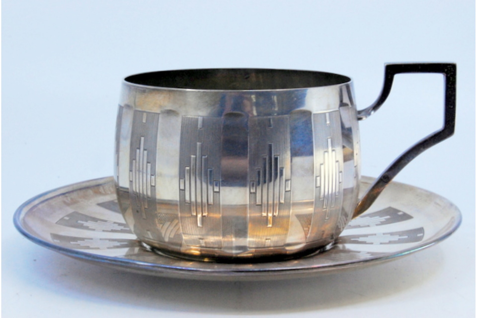 • Descrição: Chávena com pires em prata lisa com bandas ao alto e  gravados assimétricos.