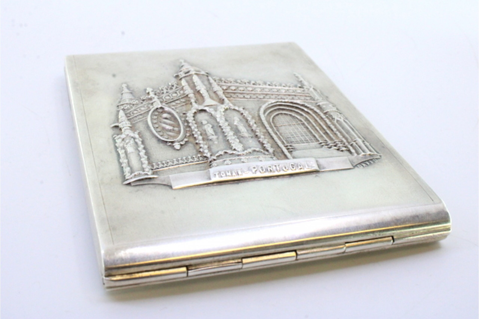 • Descrição: Cigarreira em prata com relevs alusivos ao Convento de Tomar na tampa basculante e interior dourado.