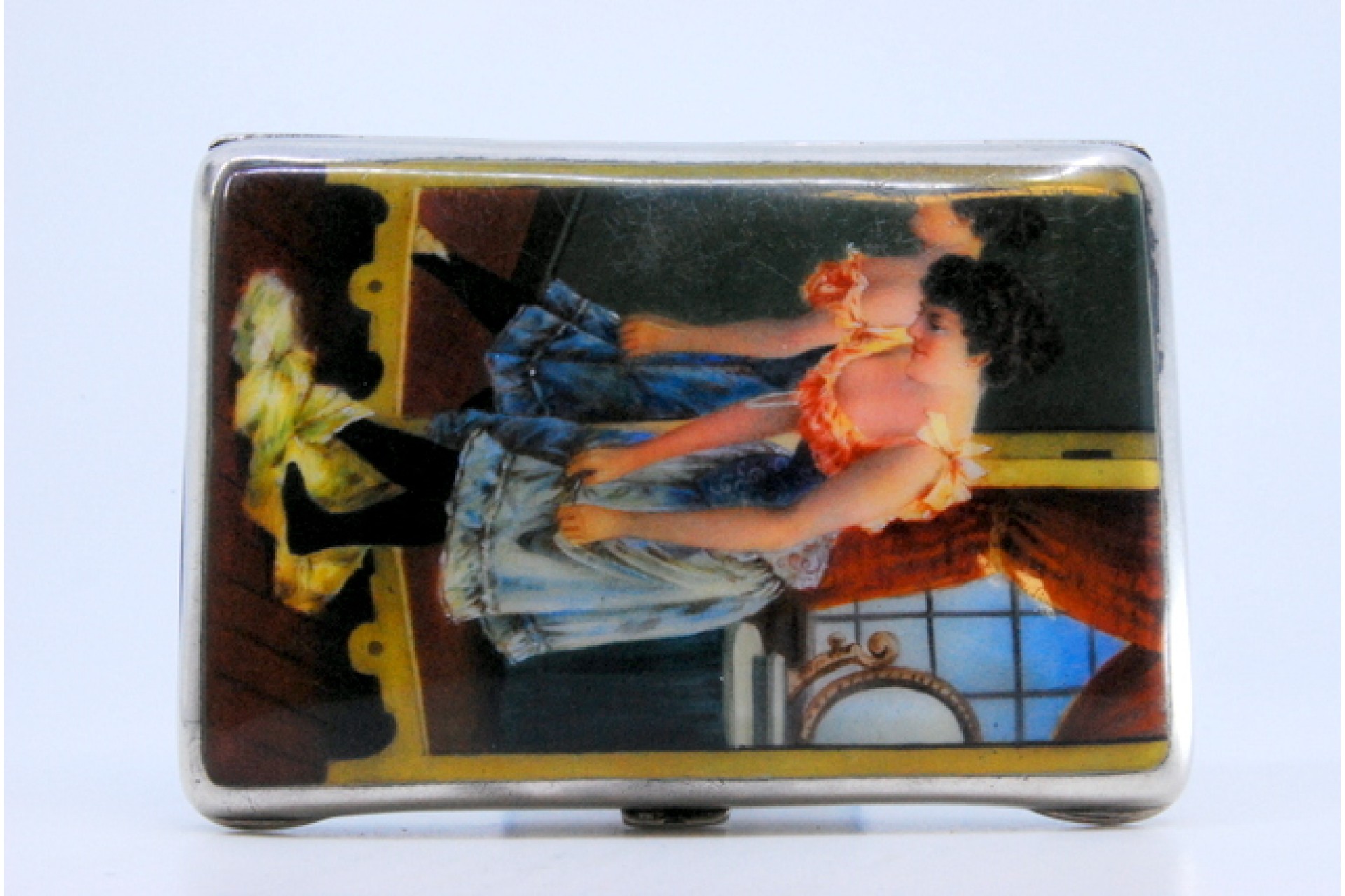 • Descrição: Cigarreira em prata esmaltada com jovem dama em cena do quotidiano, interior dourado e tampa basculante.
