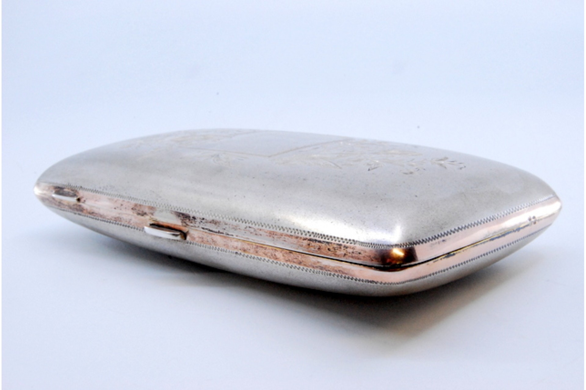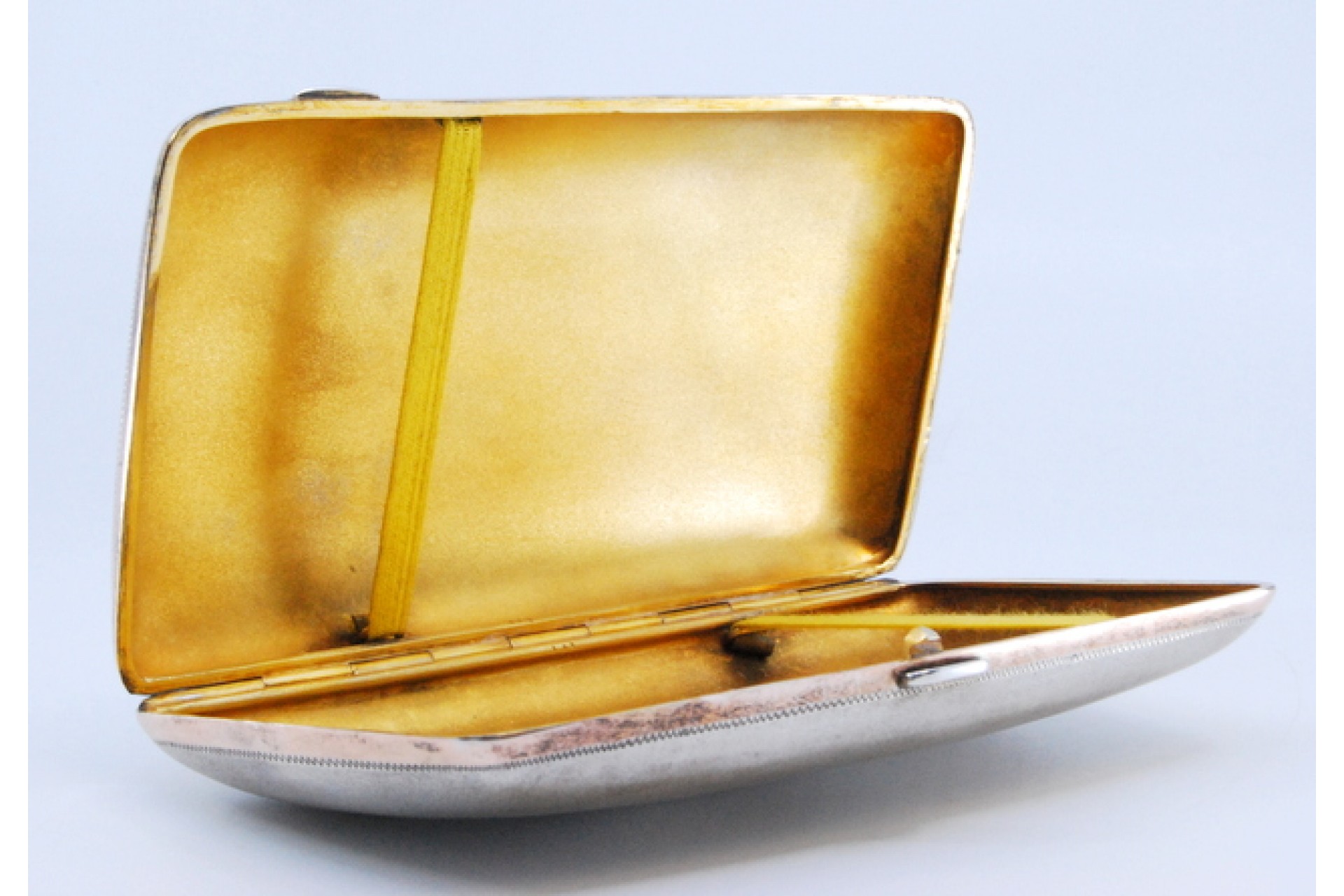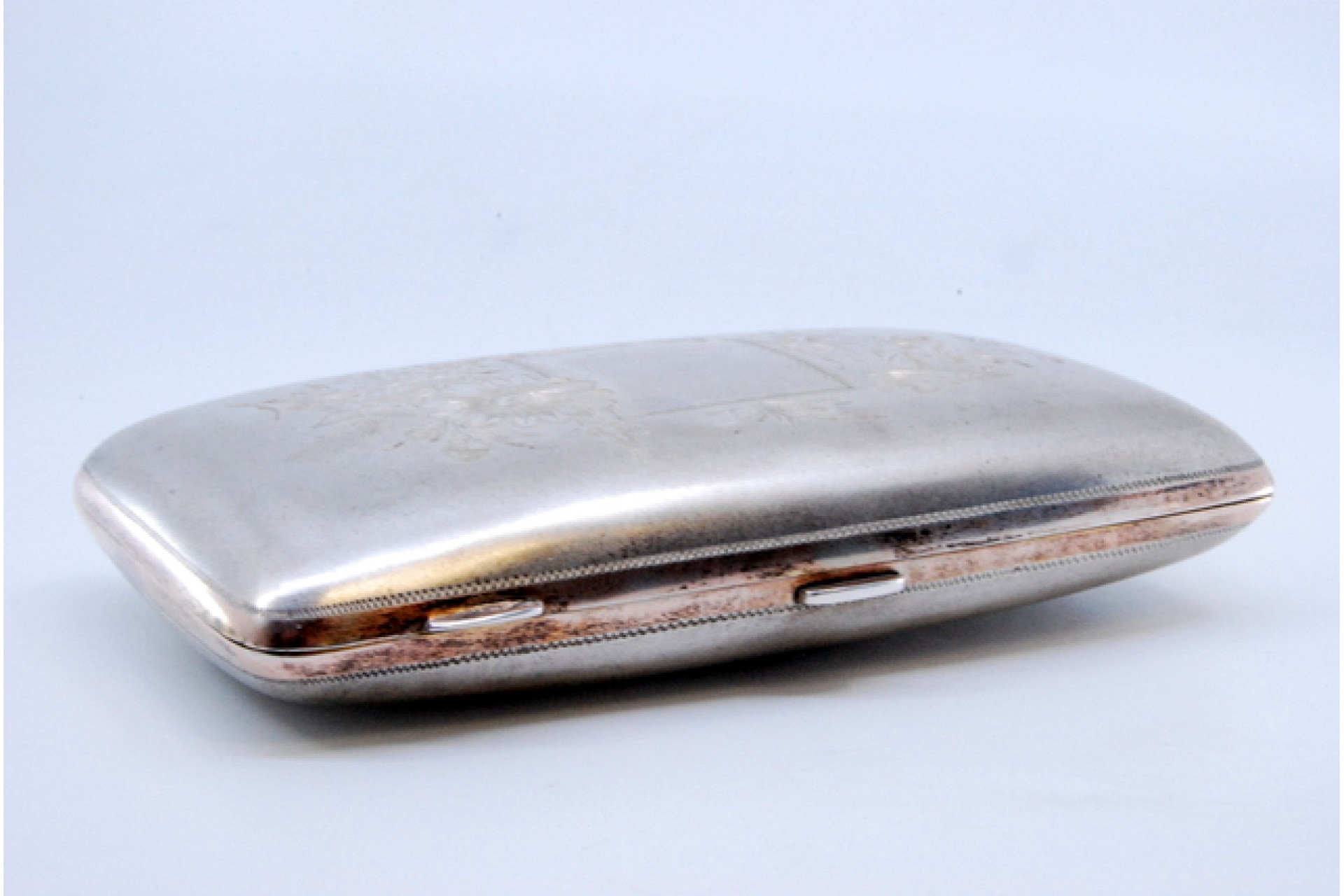 • Descrição: Cigarreira em prata com relevos na tampa e duas pegas de abertura.