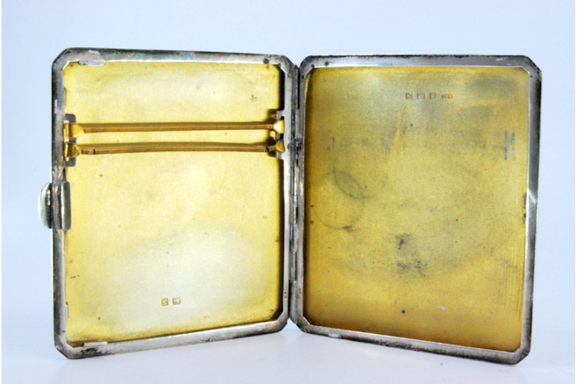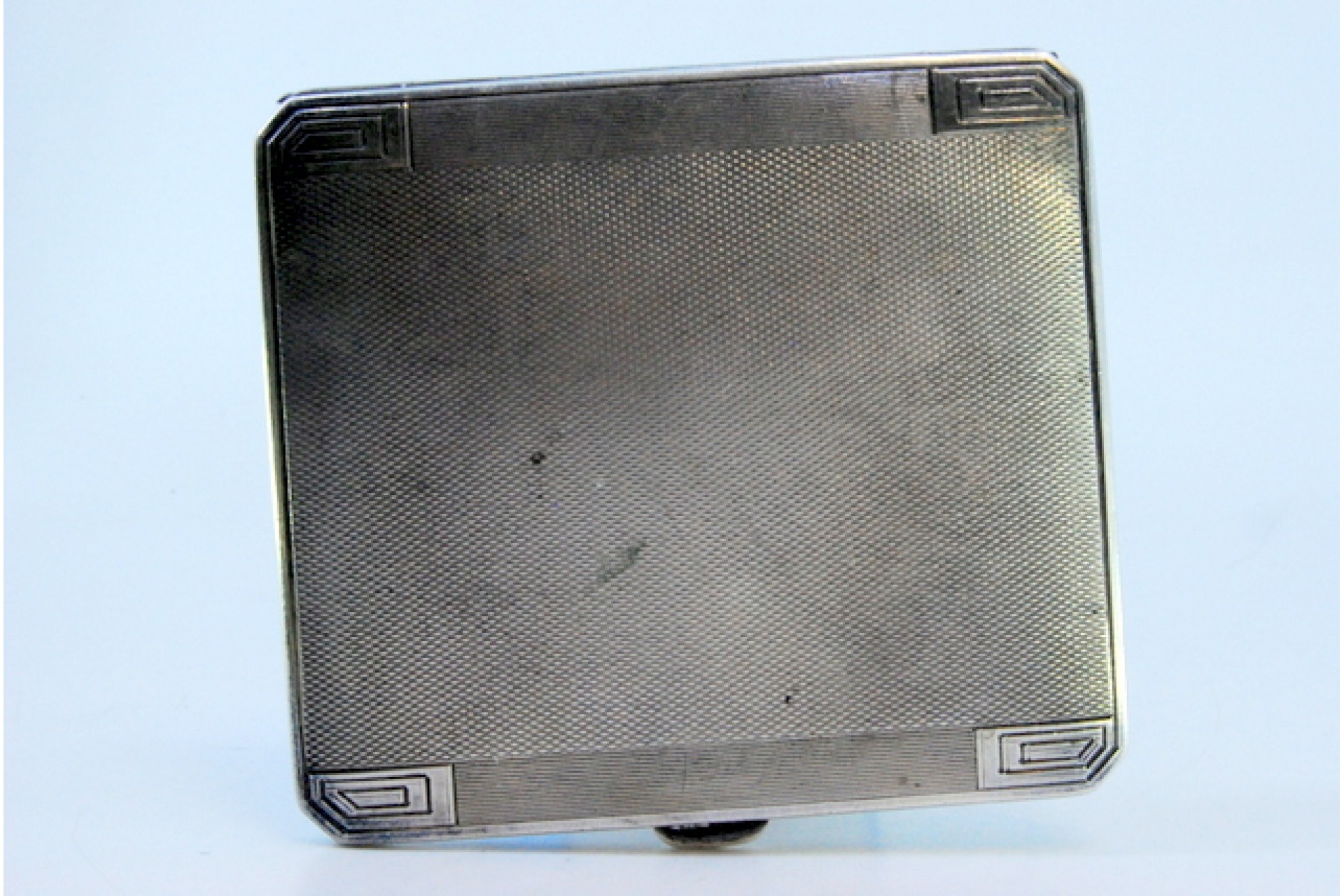 • Descrição: Cigarreira de prata guilhochada com gravados,cantos chanfrados, interior dourado e tampa basculante.