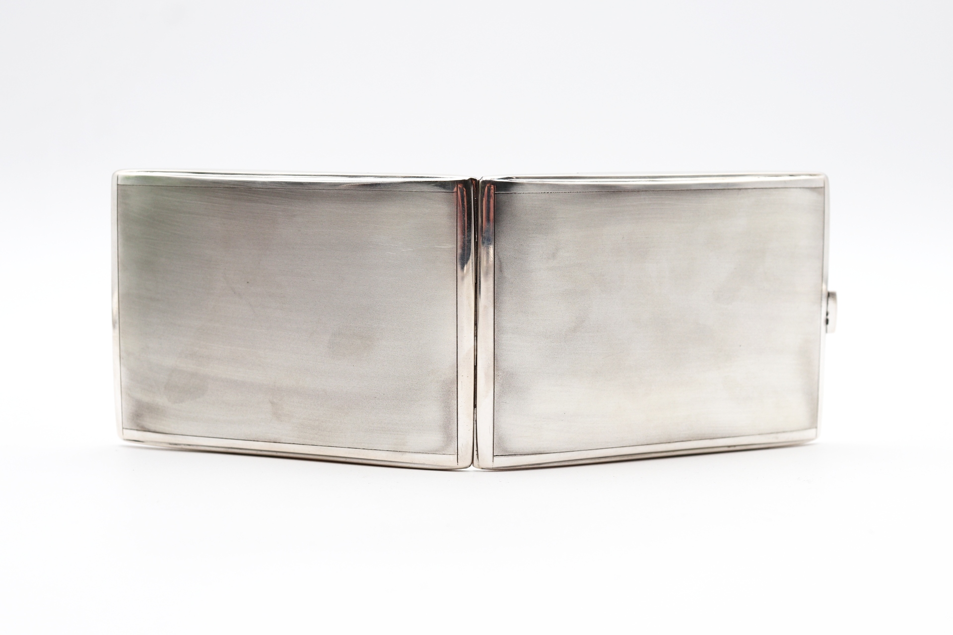 • Descrição: Cigarreira em prata esovada com tampa basculante com mola e interior dourado.