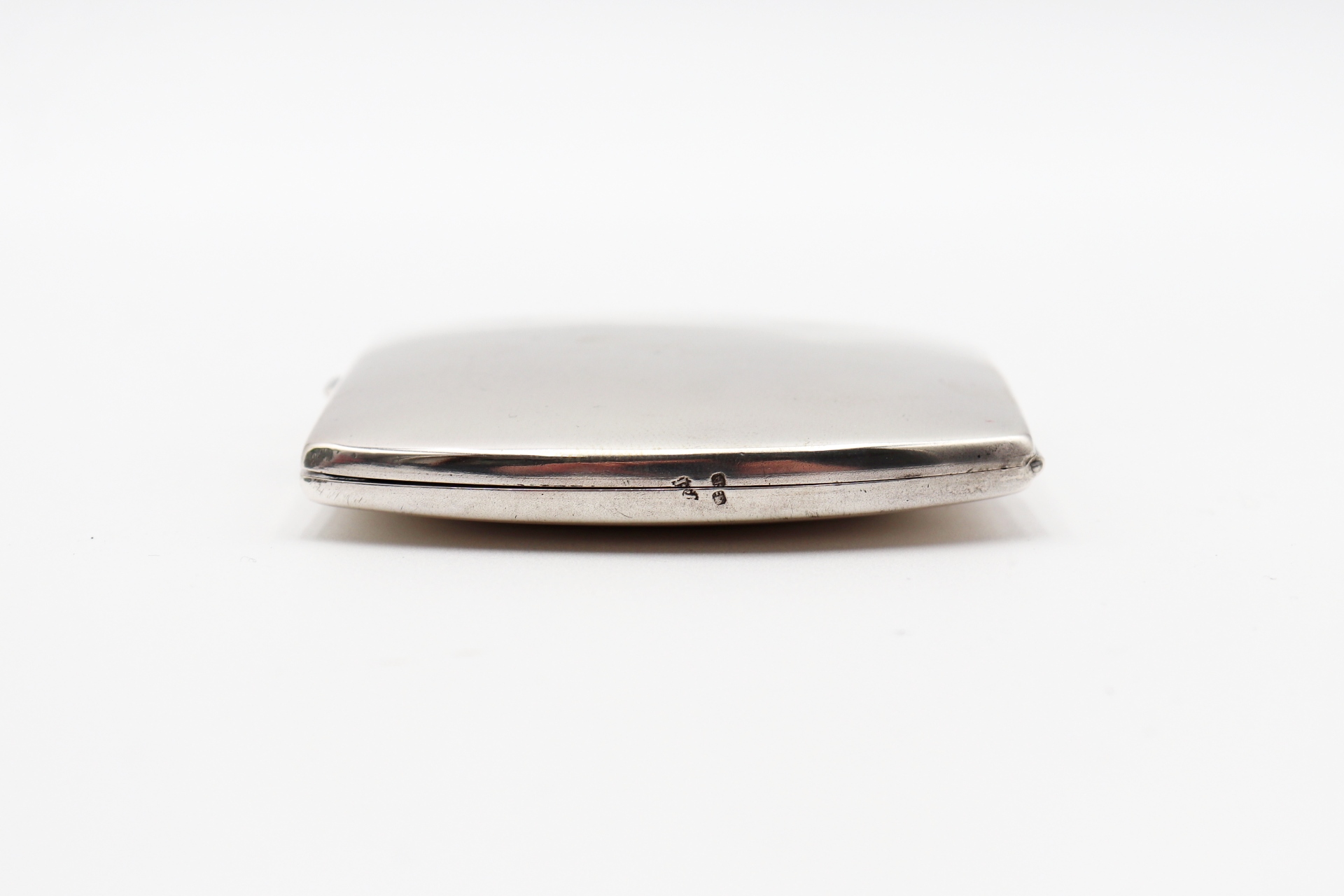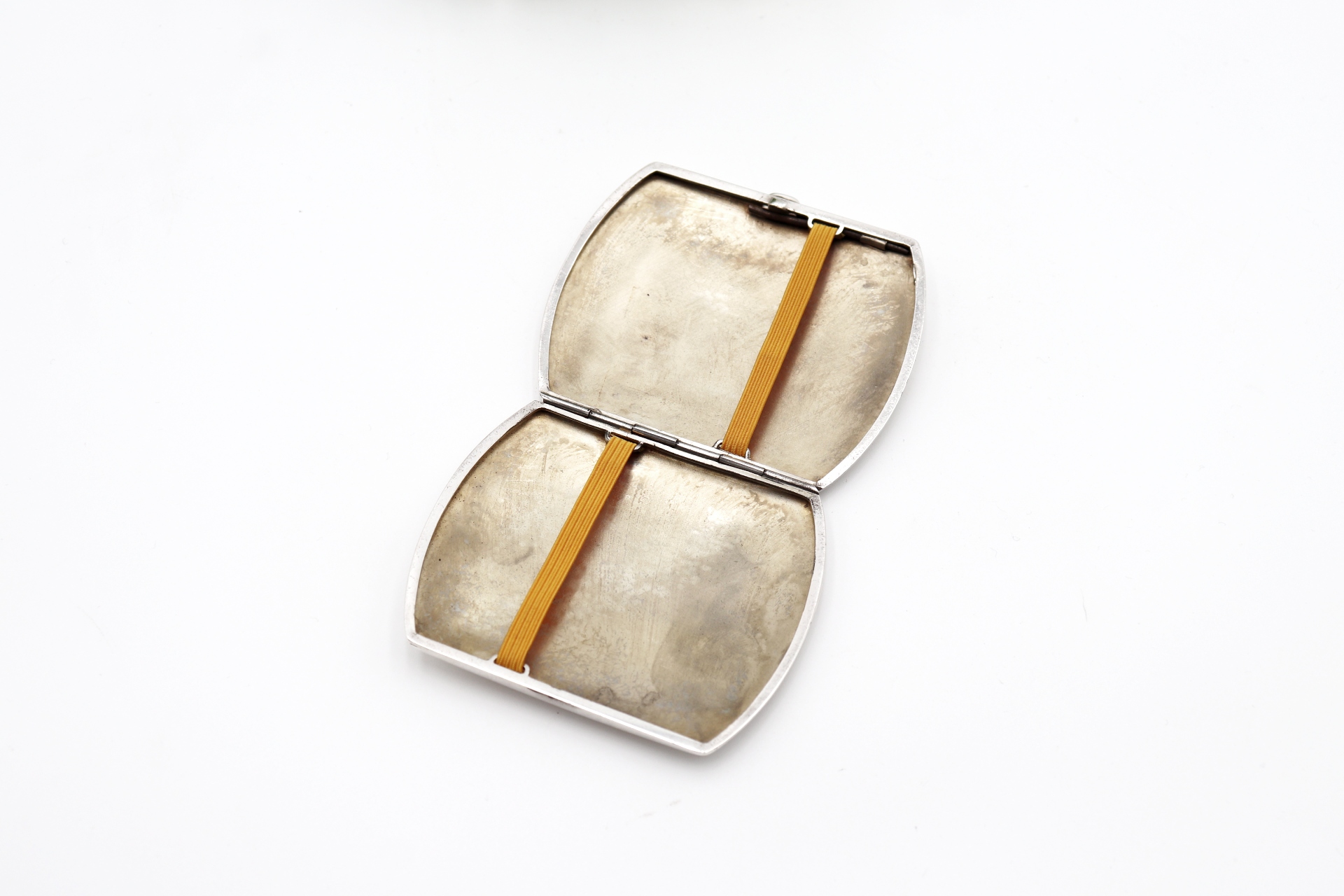Cigarreira em prata escovada de cantos cortados e dupla fita no interior.