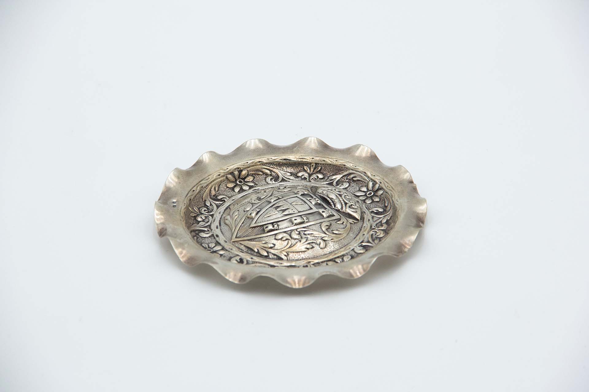 • Descrição: Cinzeiro em prata com brasão de armas de Portugal e relevos para cigarros.