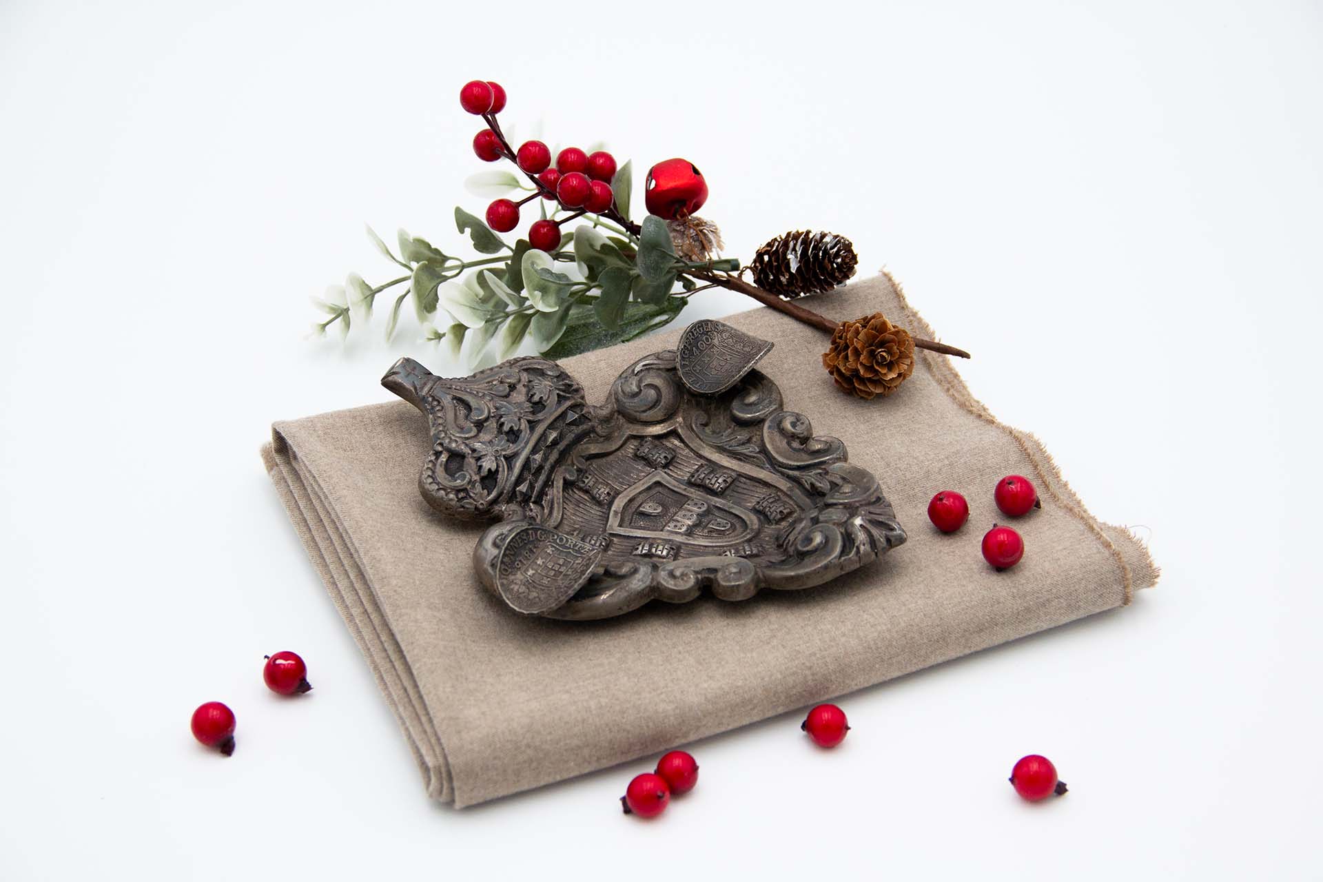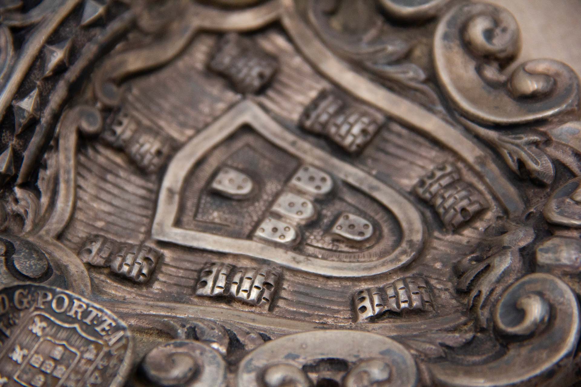 • Descrição: Cinzeiro em prata com brazão de Portugal e moedas de 400 reis.