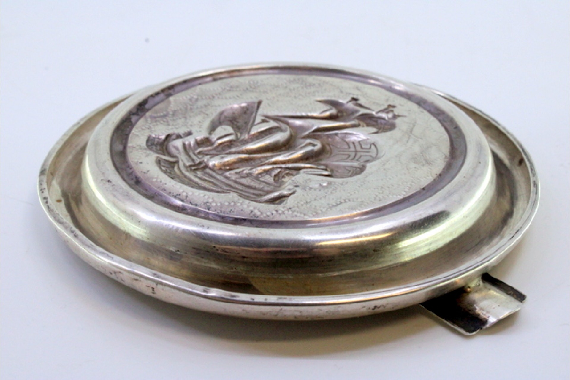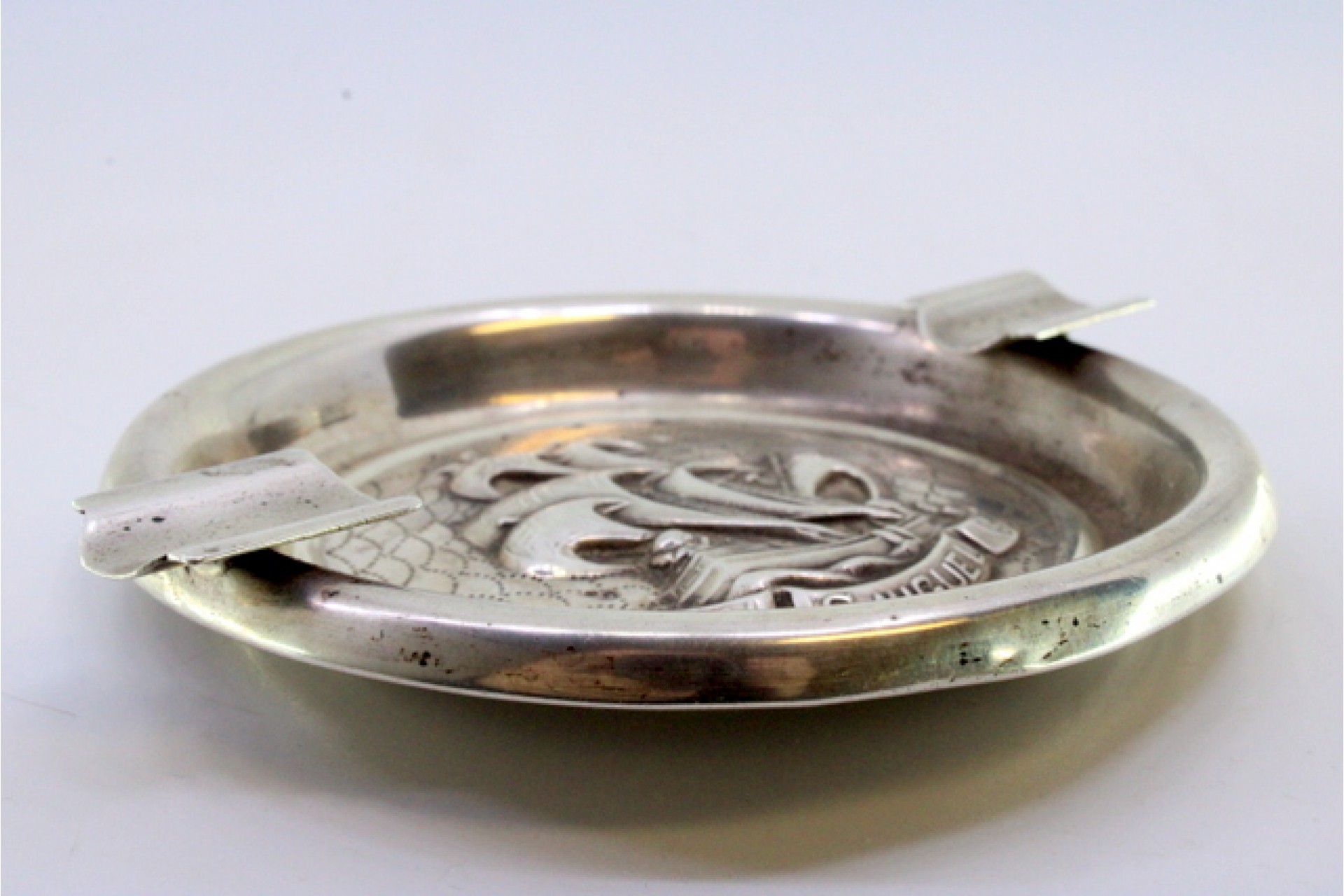 • Descrição: Cinzeiro em prata com relevos alusivos à caravela São Miguel com gravados e dois suportes para cigarros.