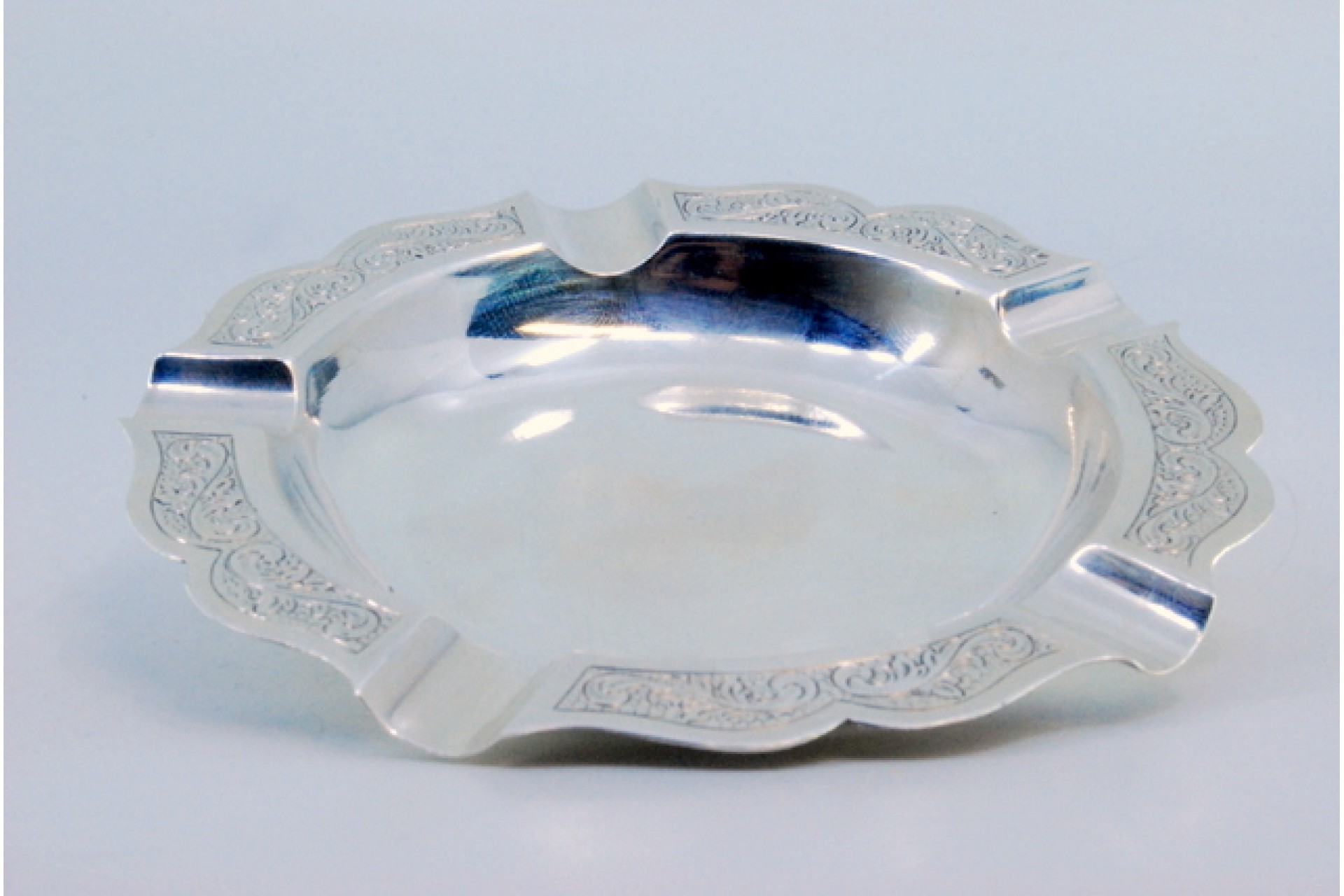 • Descrição: Cinzeiro em prata com motivos vegetalistas gravados e cinco suportes para cigarros.