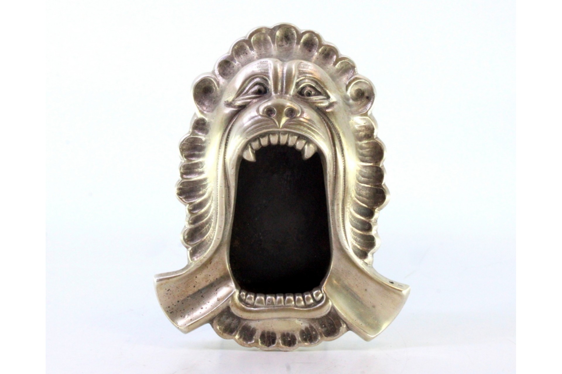 Cinzeiro em prata em forma de boca de leão com relevos e dois suportes para cigarros.
