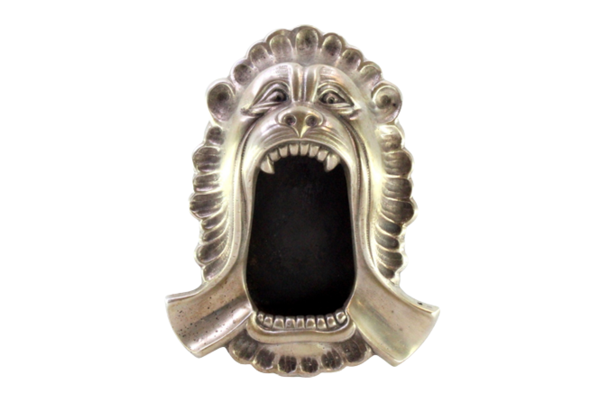 • Descrição: Cinzeiro em prata em forma de boca de leão com relevos e dois suportes para cigarros.