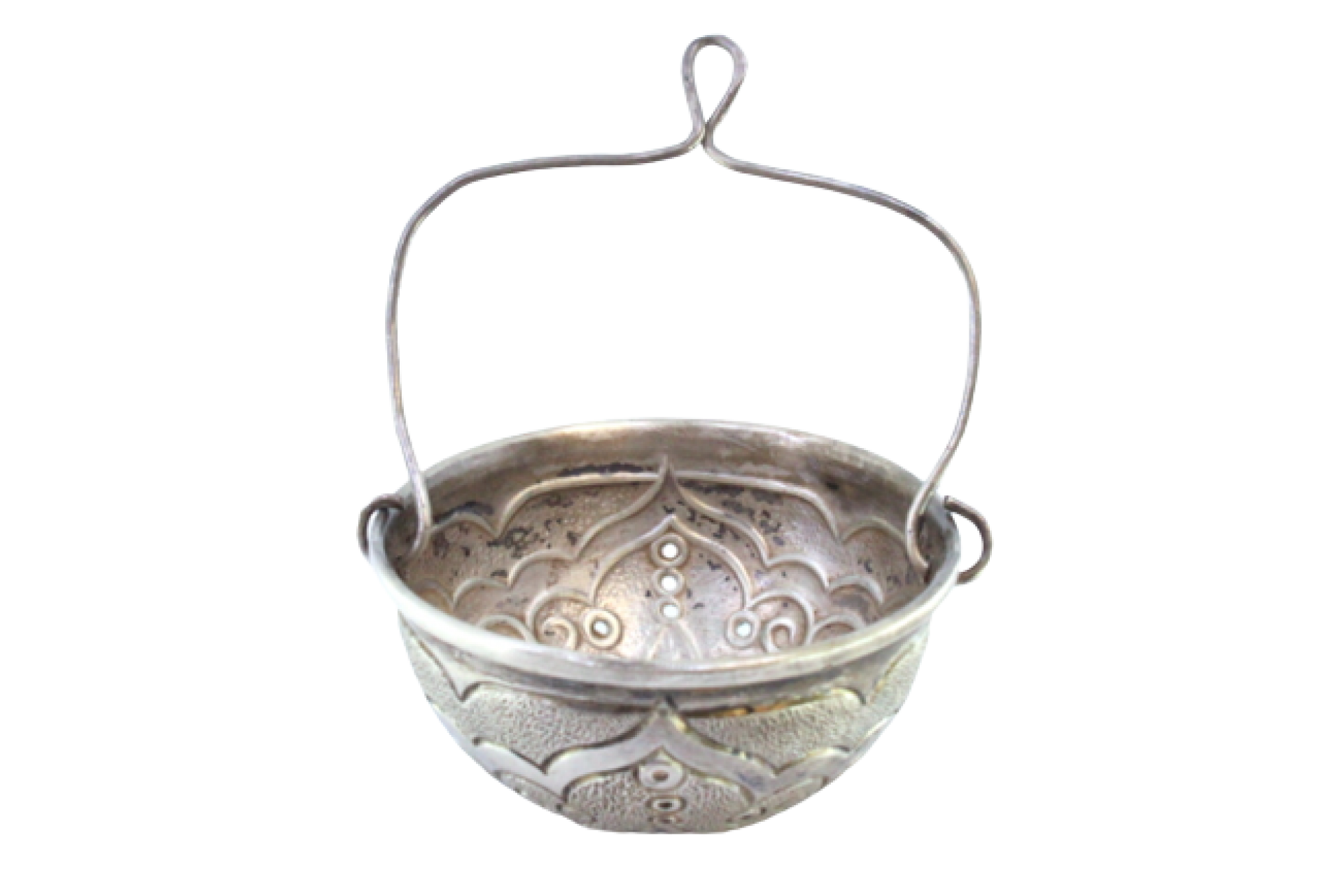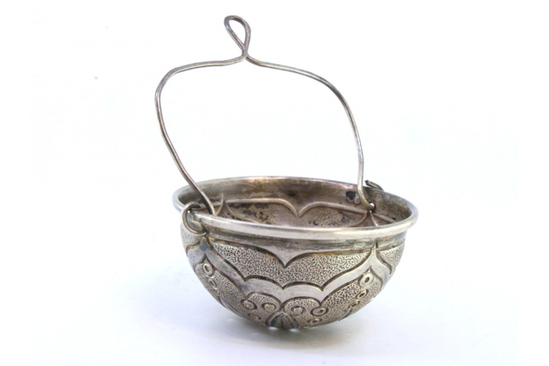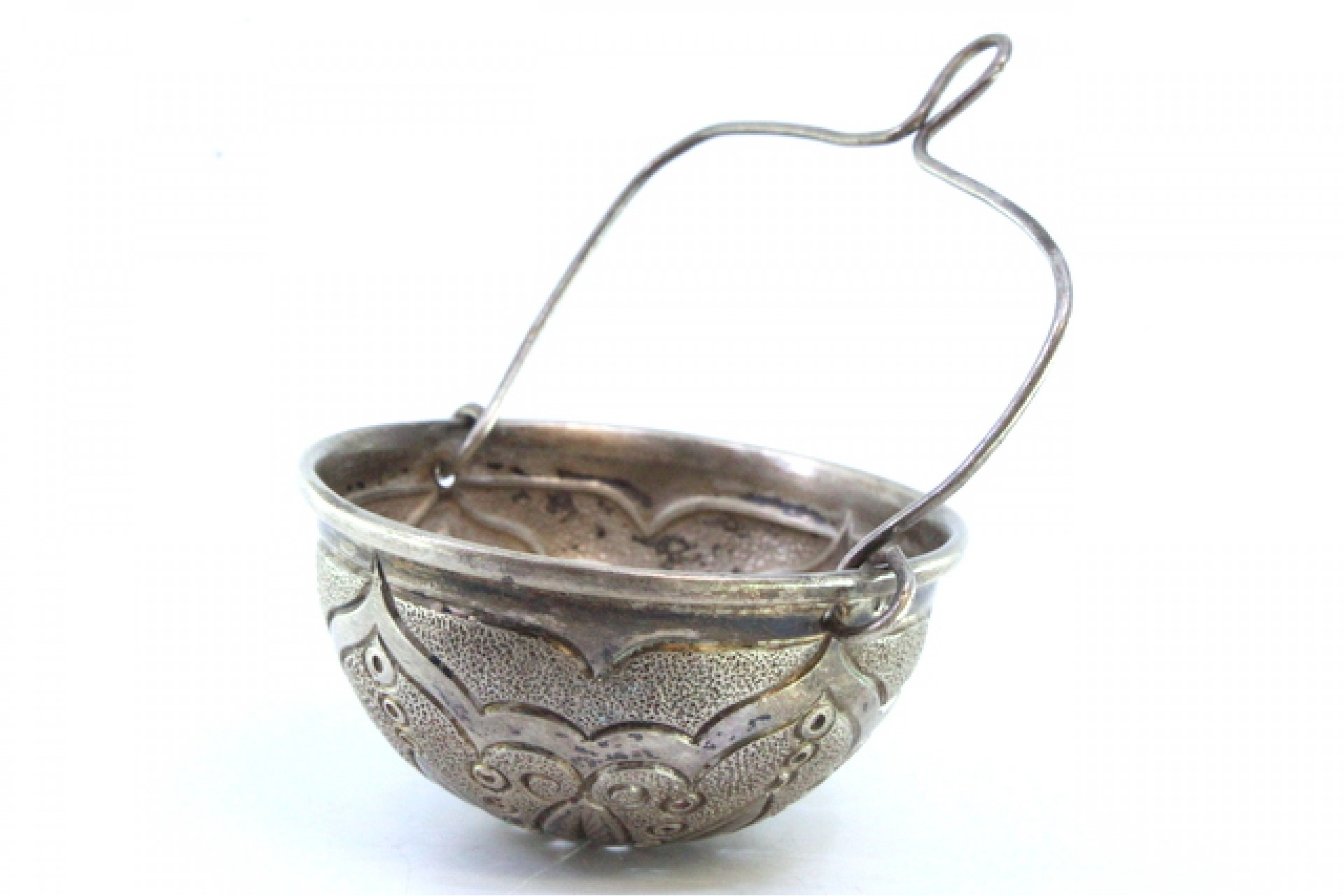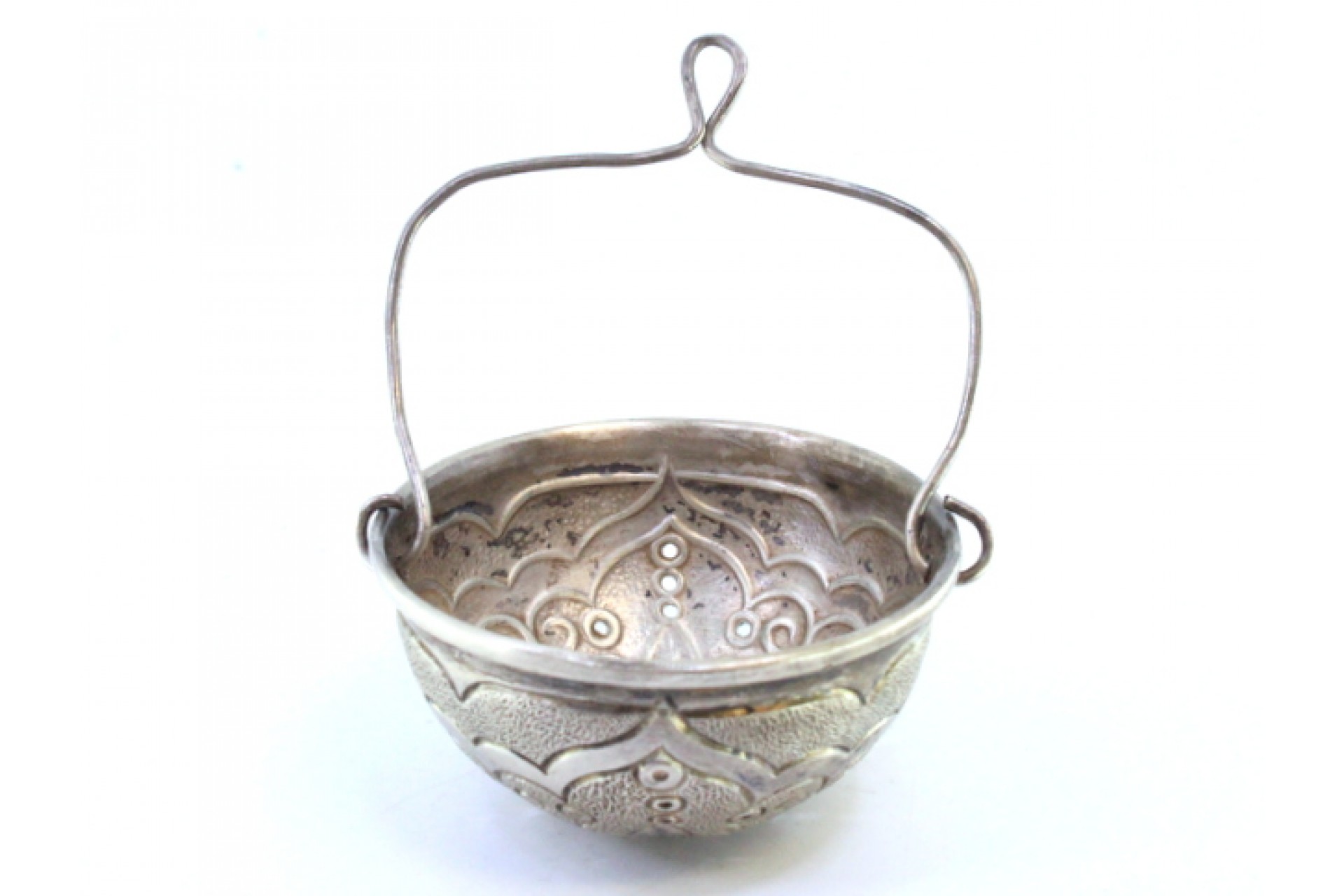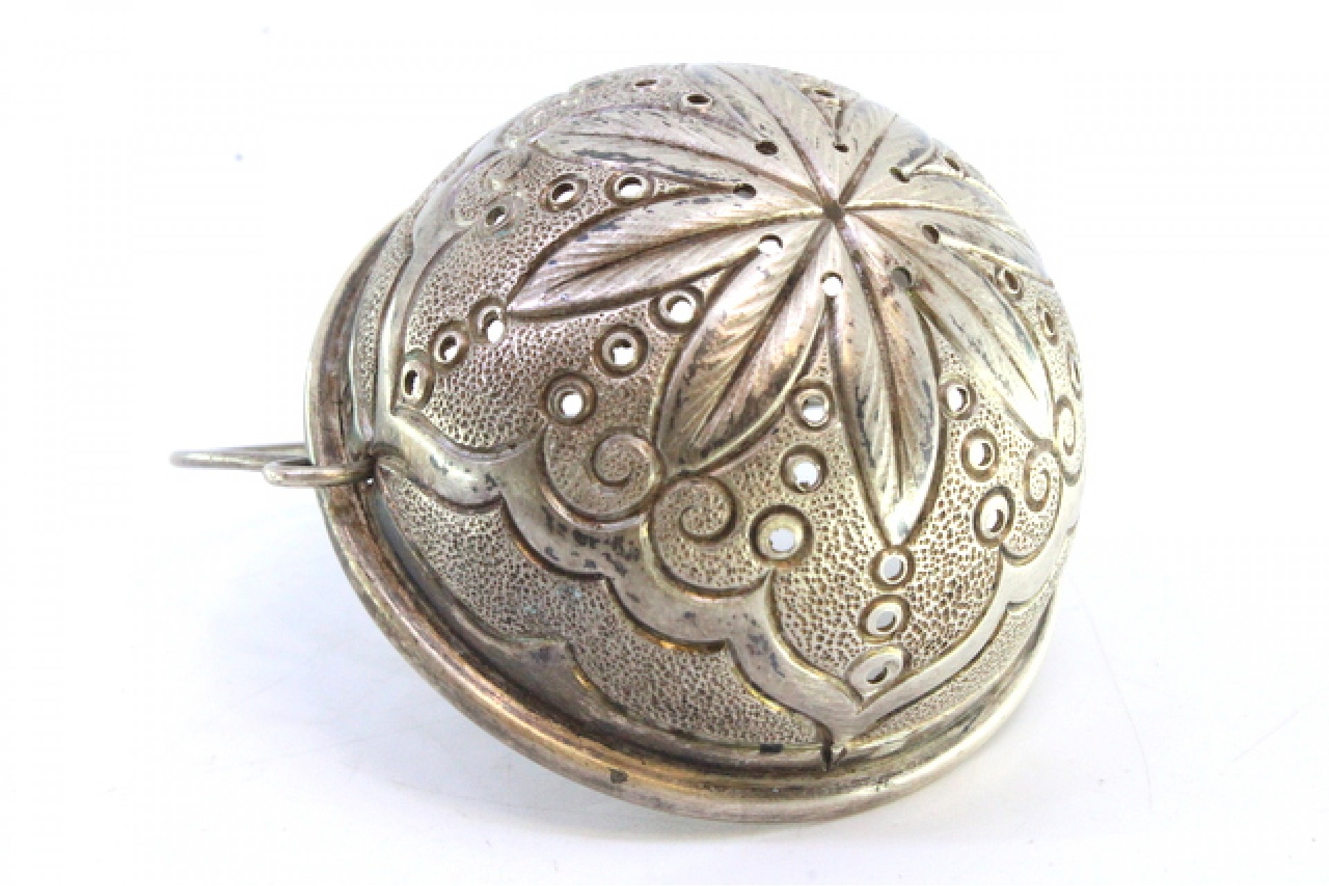Coador de chá em prata com frisos, motivos florais gravados e asa articulada.