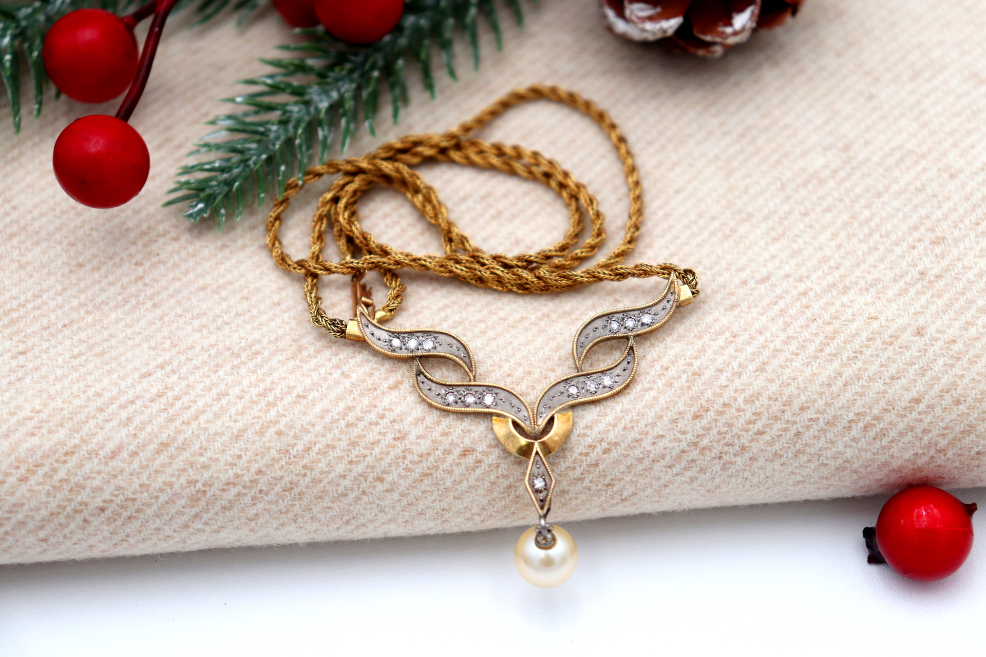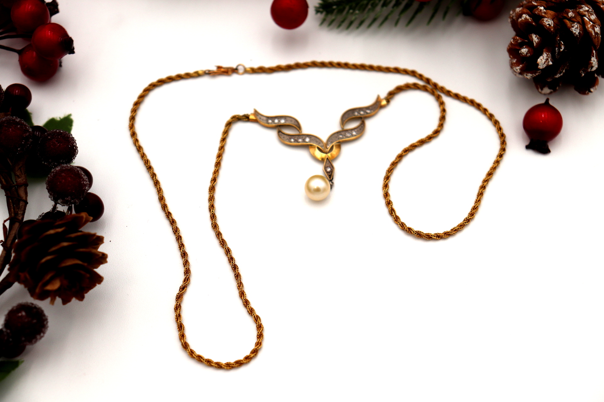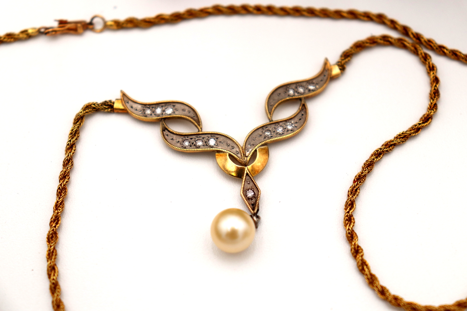 Etiquetas: Colar, Ouro, Lascas de diamante, Pérola