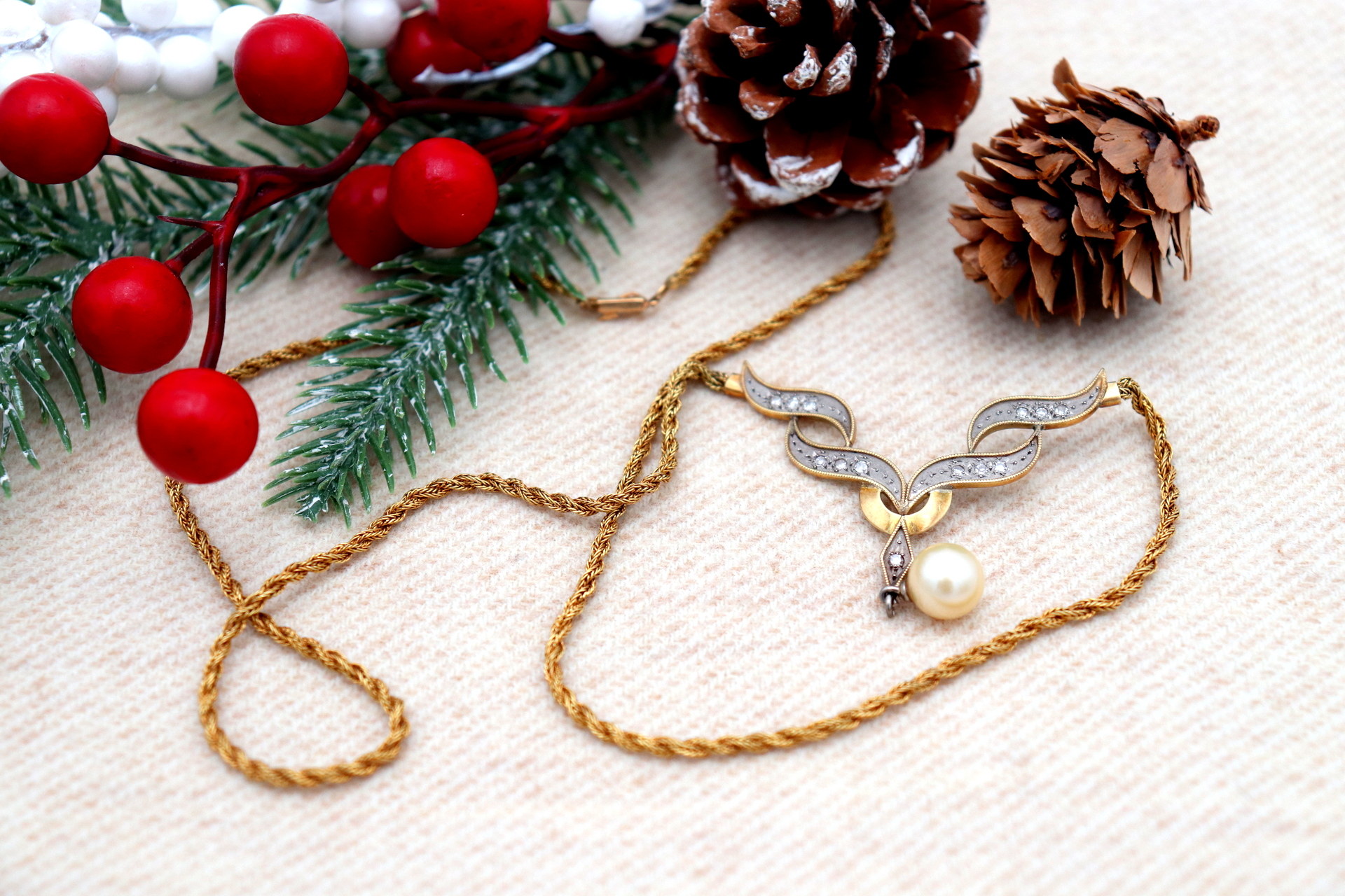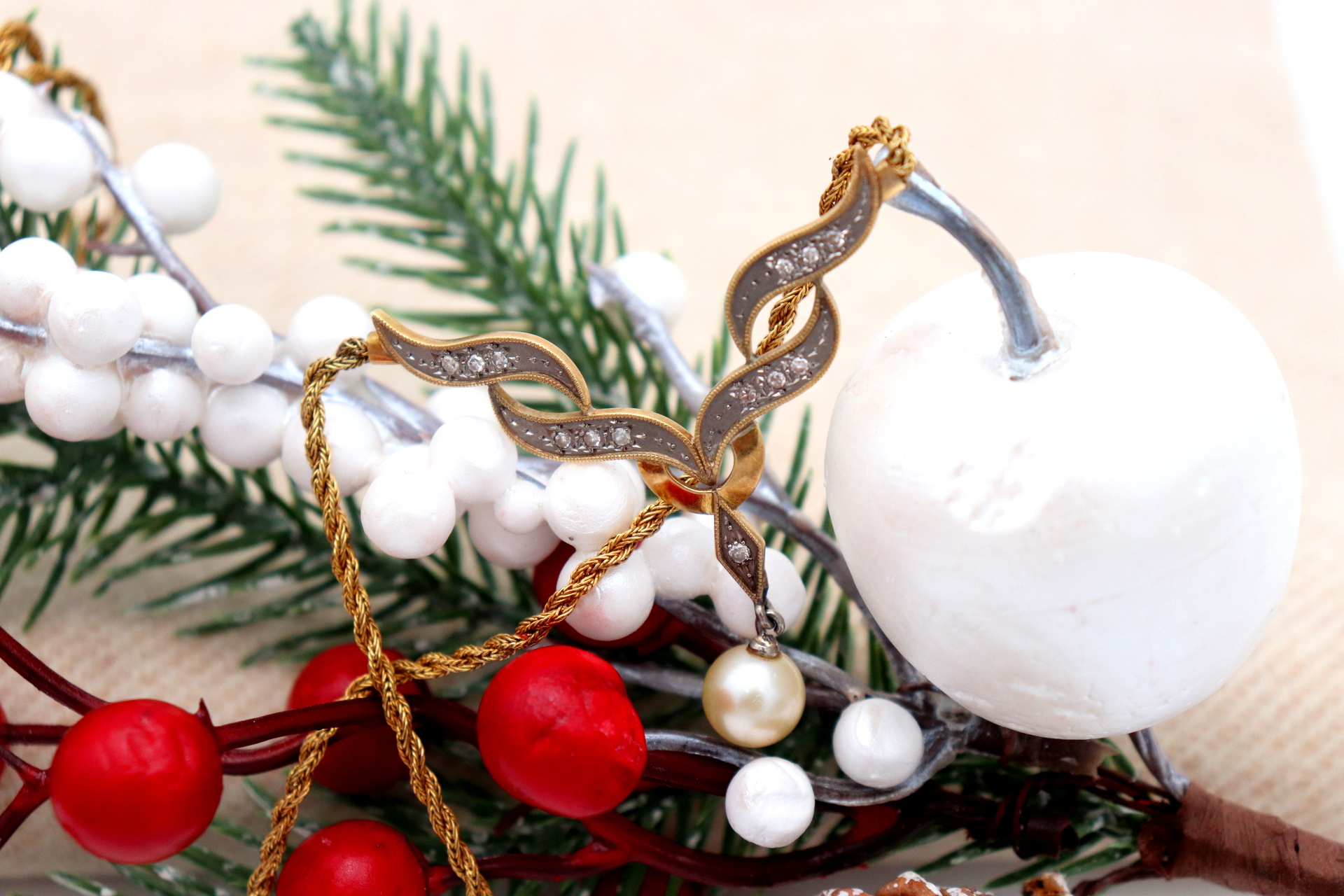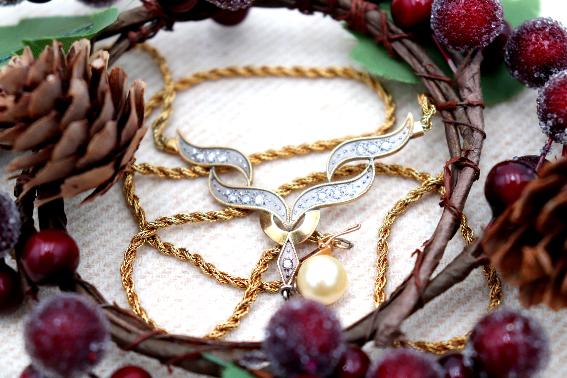 Etiquetas: Colar, Ouro, Lascas de diamante, Pérola