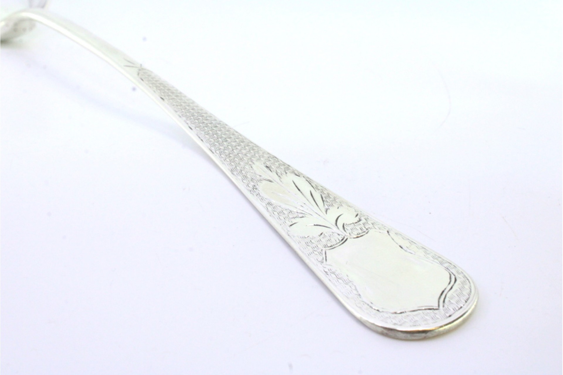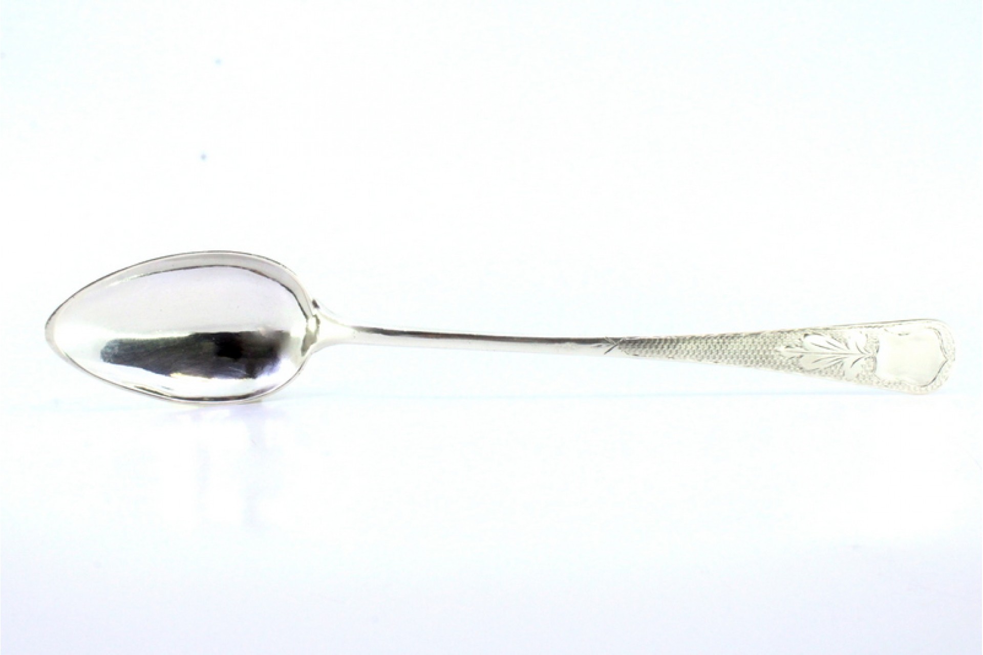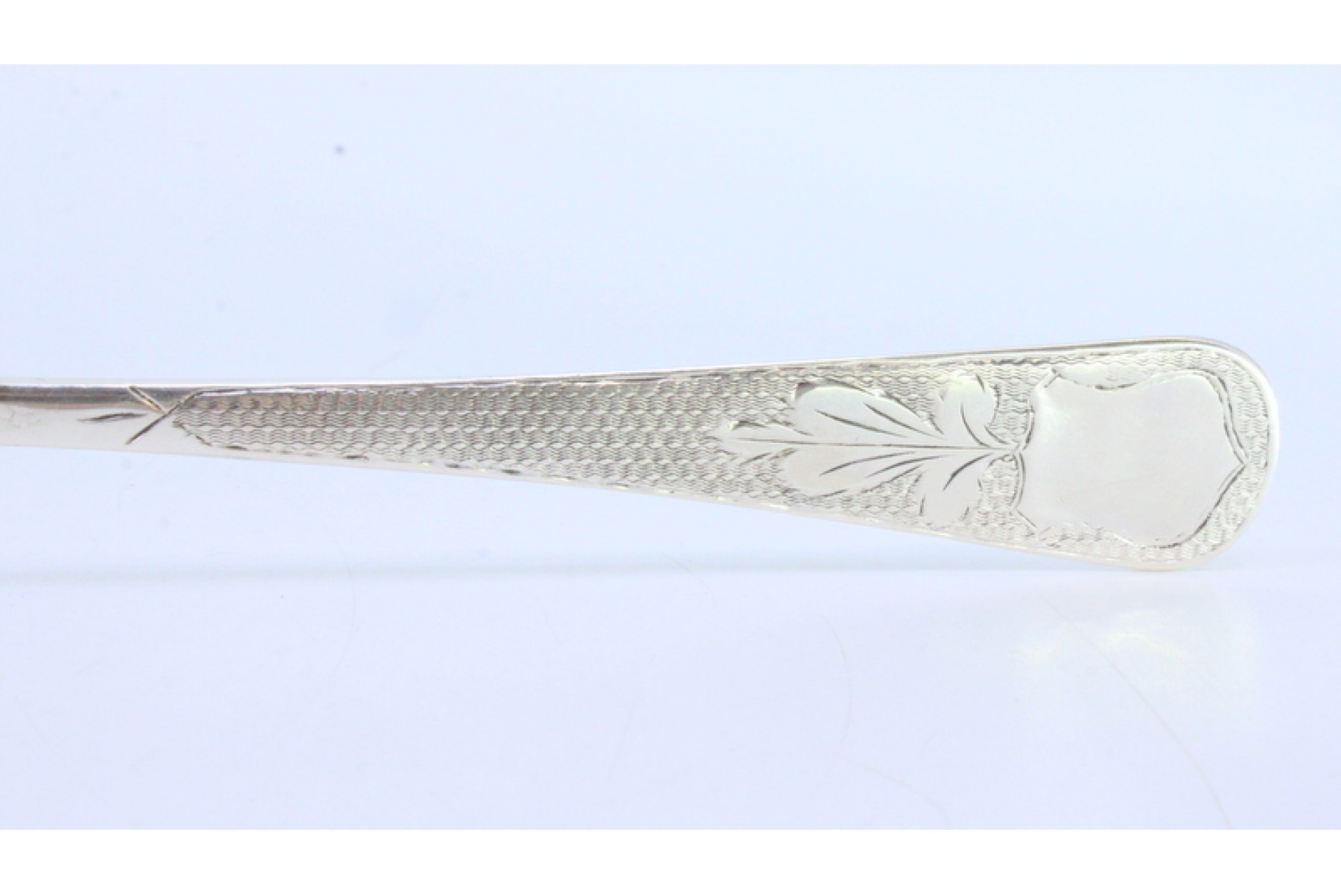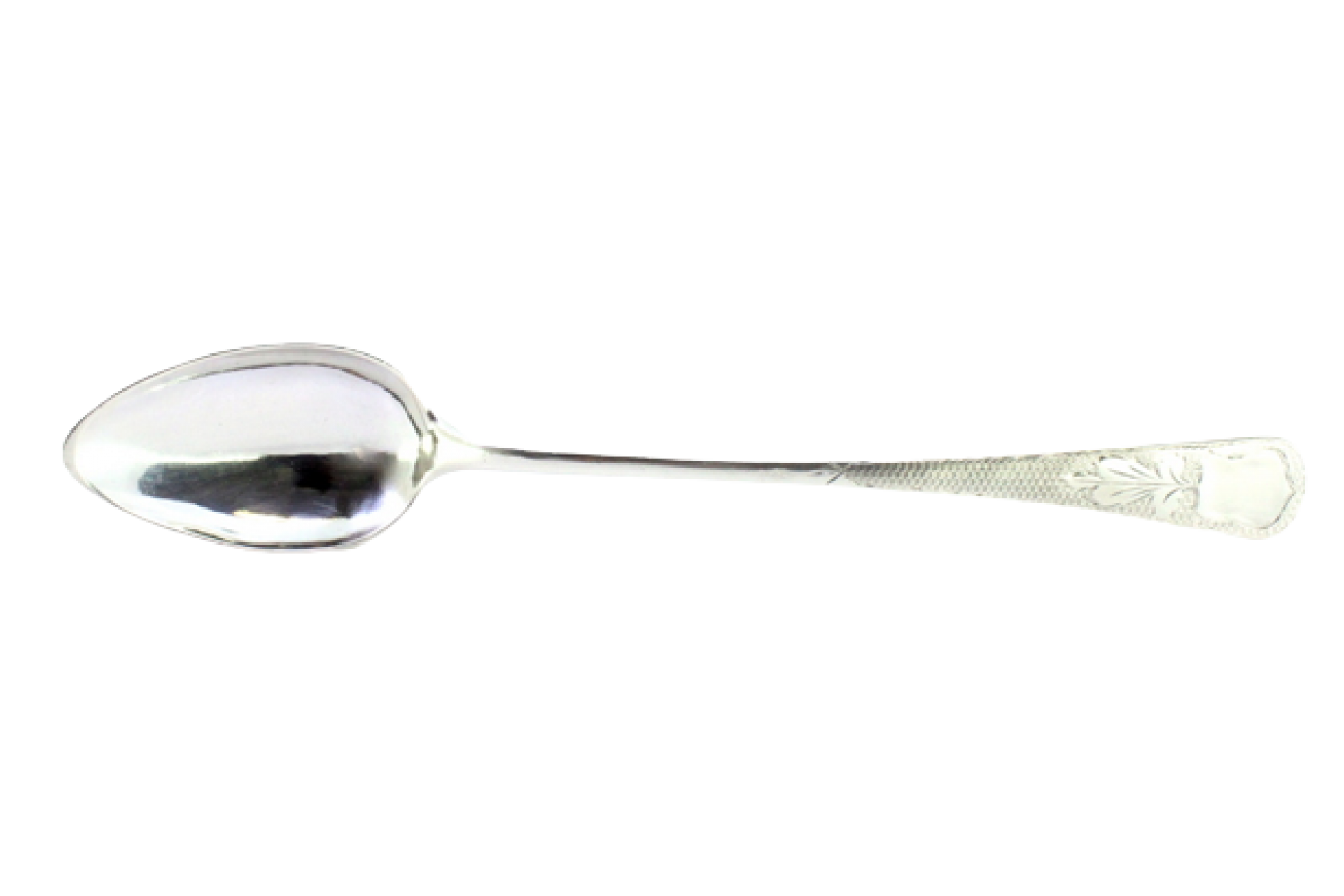 Colher de arroz e de servir em prata com cabo guilhochado e cartela para monograma.