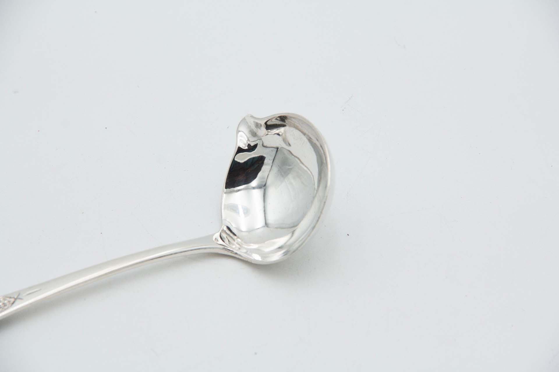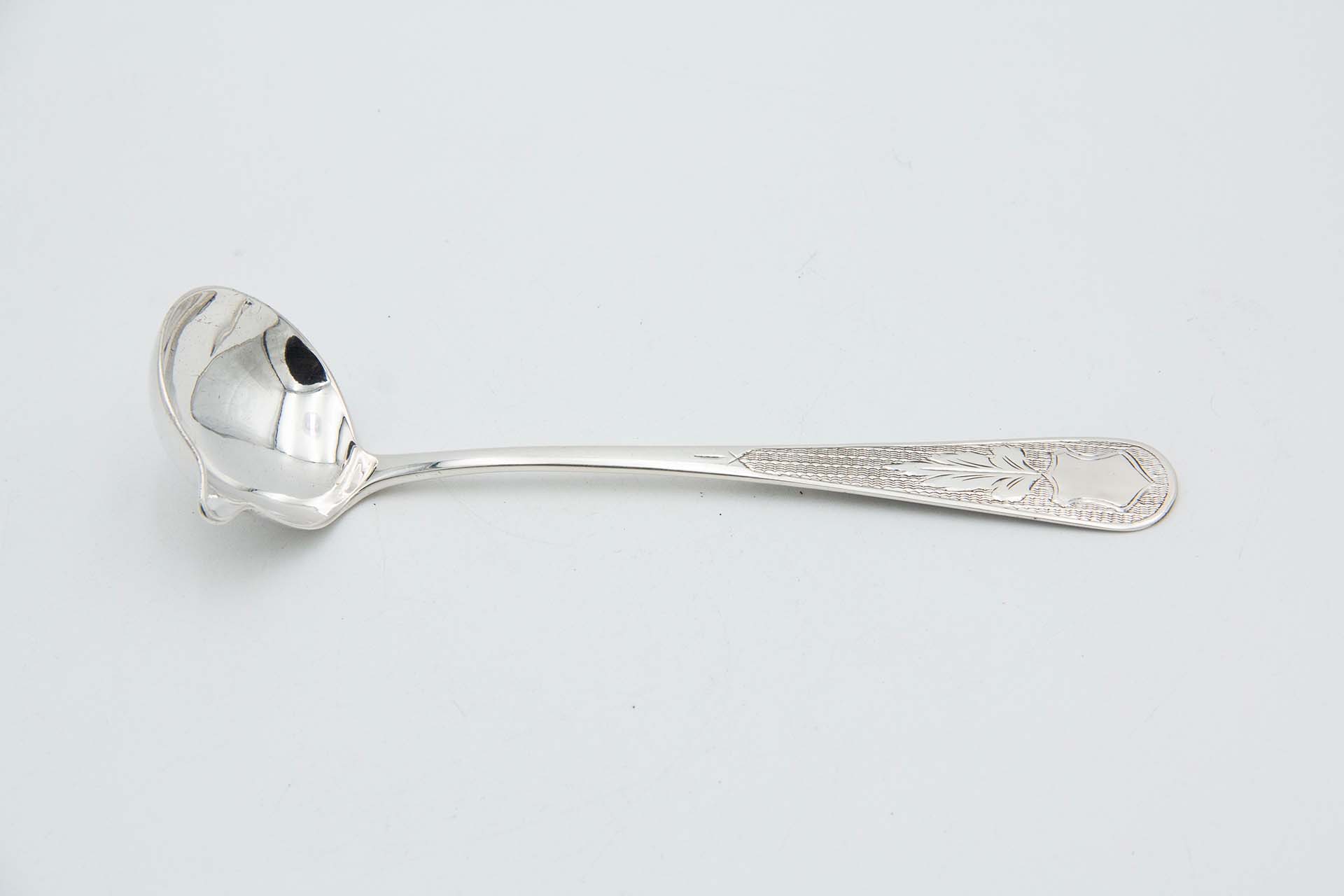• Descrição: Colher de molhos em prata lisa para destros com cabo guilhochado envolvendo cartela para monograma.