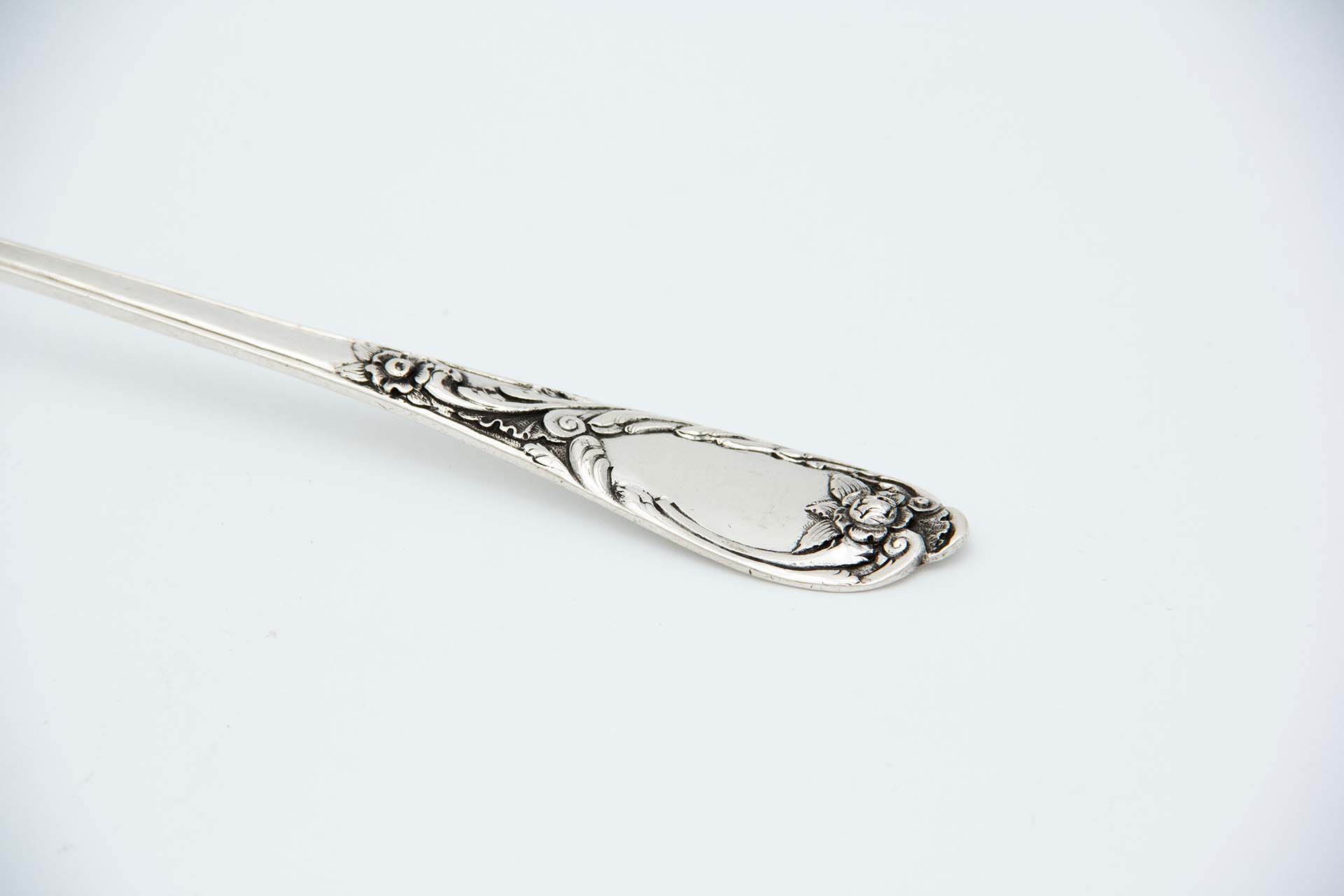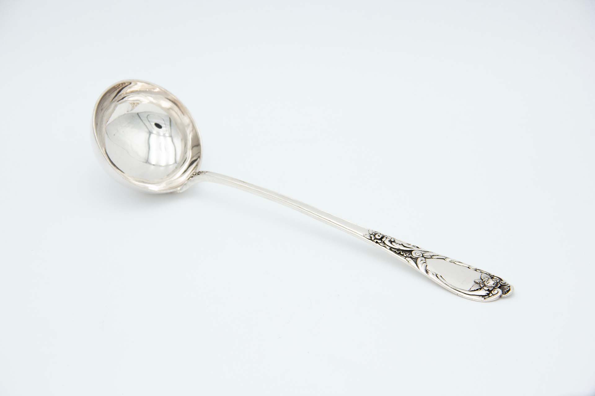 • Descrição: Concha de sopa em prata relevada no cabo com cartela para monograma.