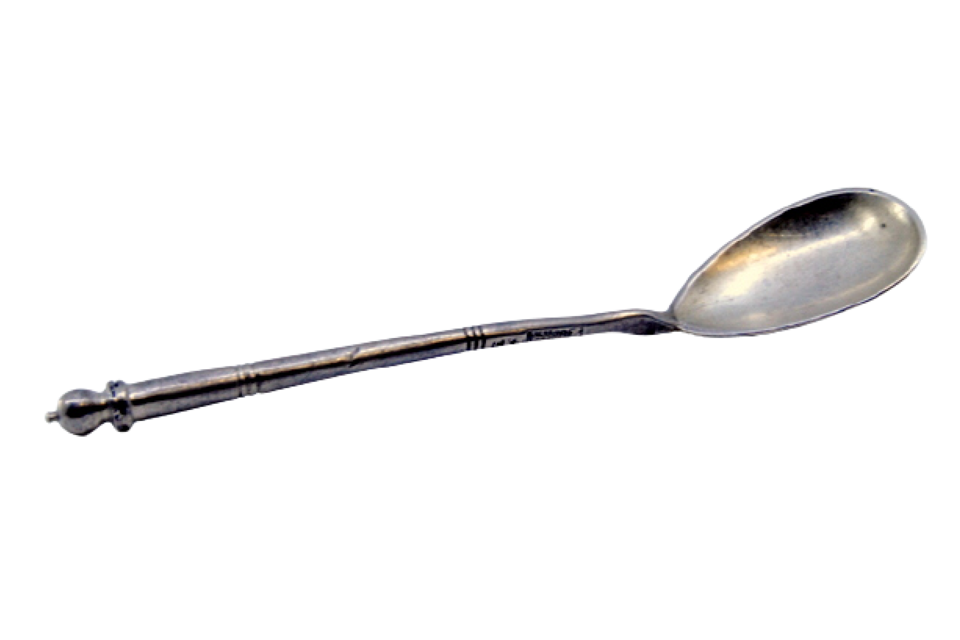 Colher de sobremesa em prata com relevos no cabo e aplicação.