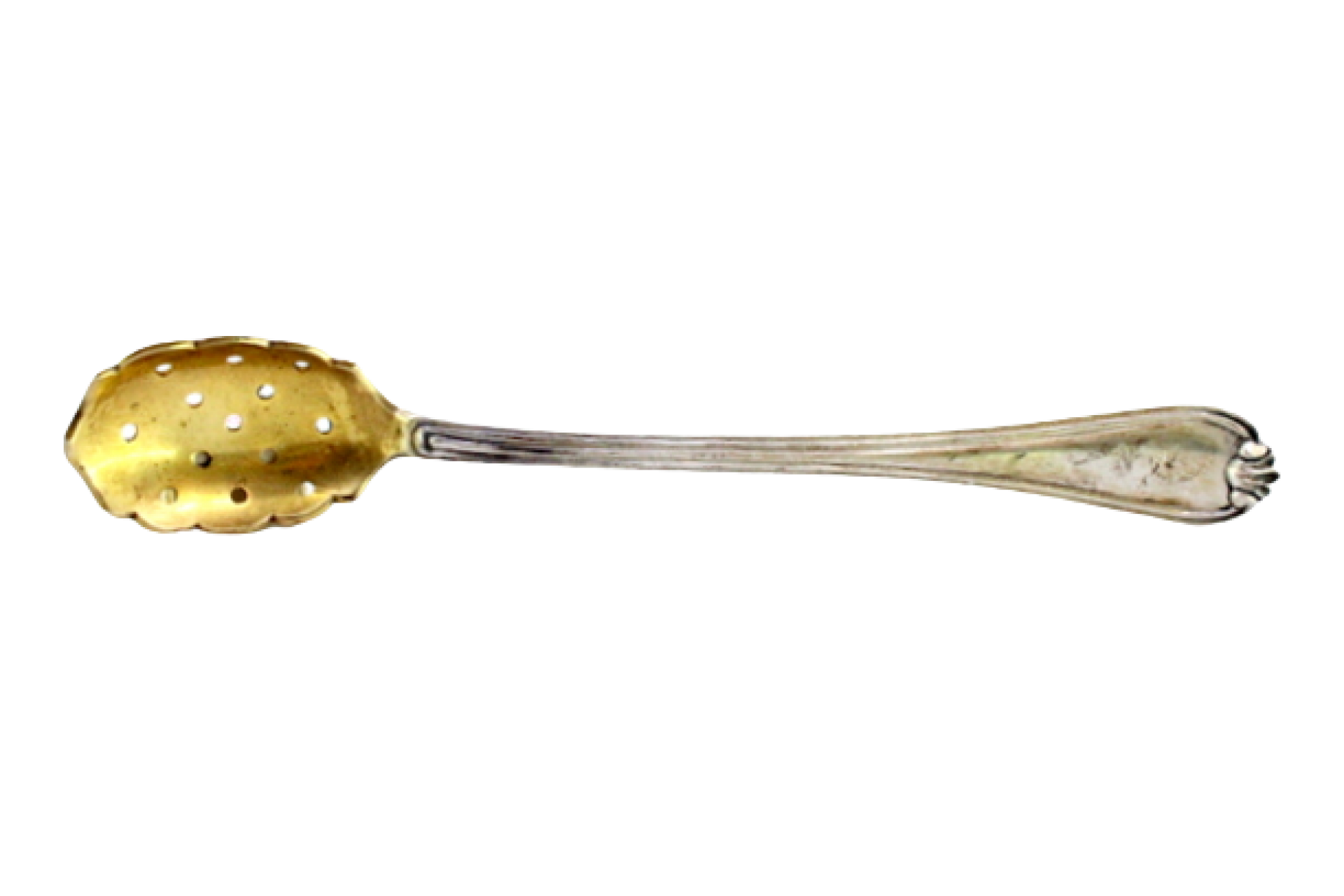 Colher para azeitonas em prata com frisos no cabo e perfurada na concha dourada.