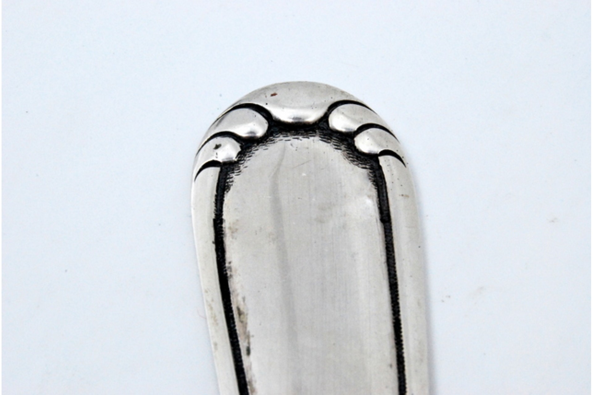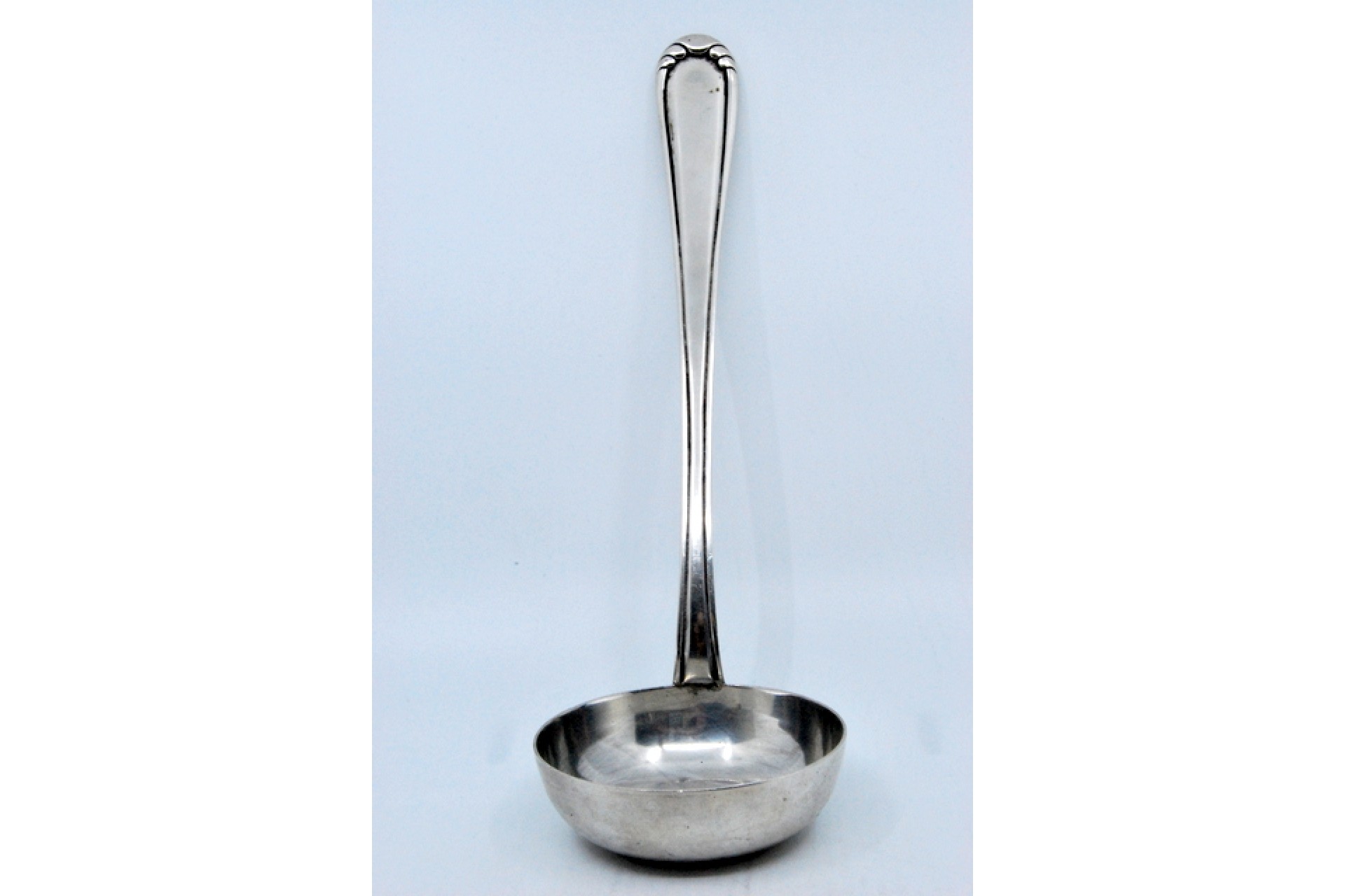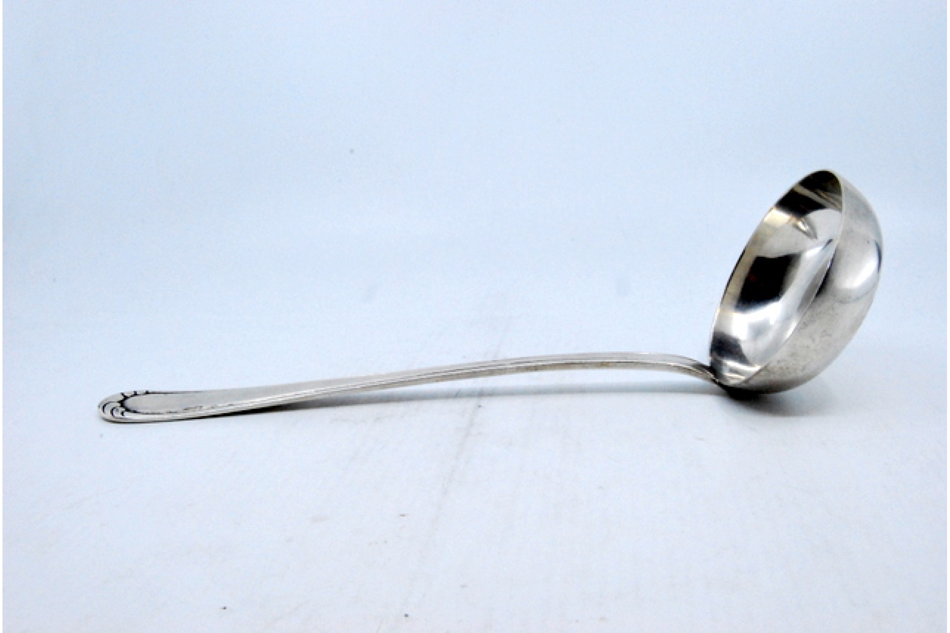 Concha de sopa em prata com frisos ao longo do cabo.