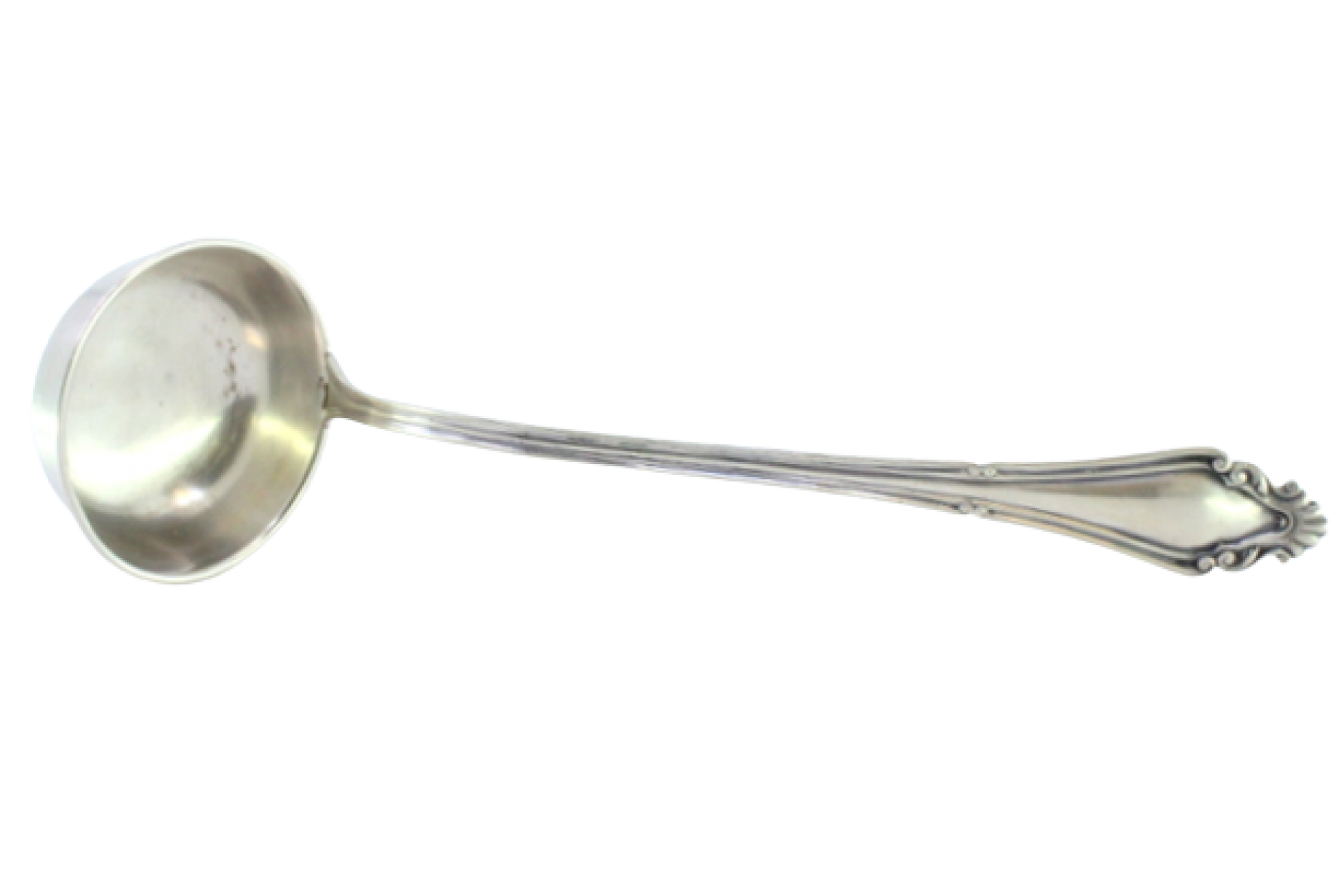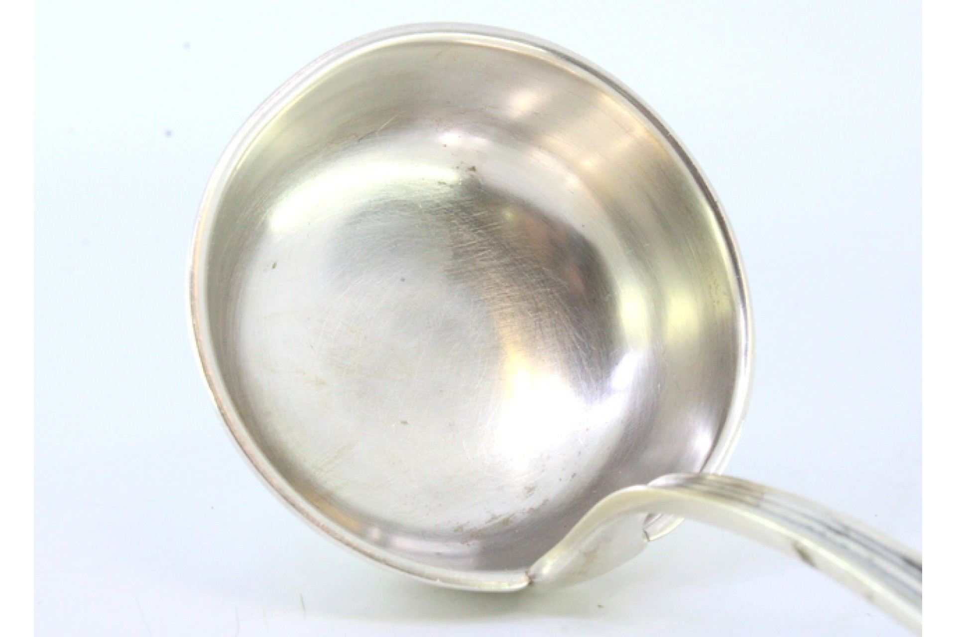 • Descrição: Concha de sopa em prata com frisos e relevos no cabo envolvendo cartela para monograma.