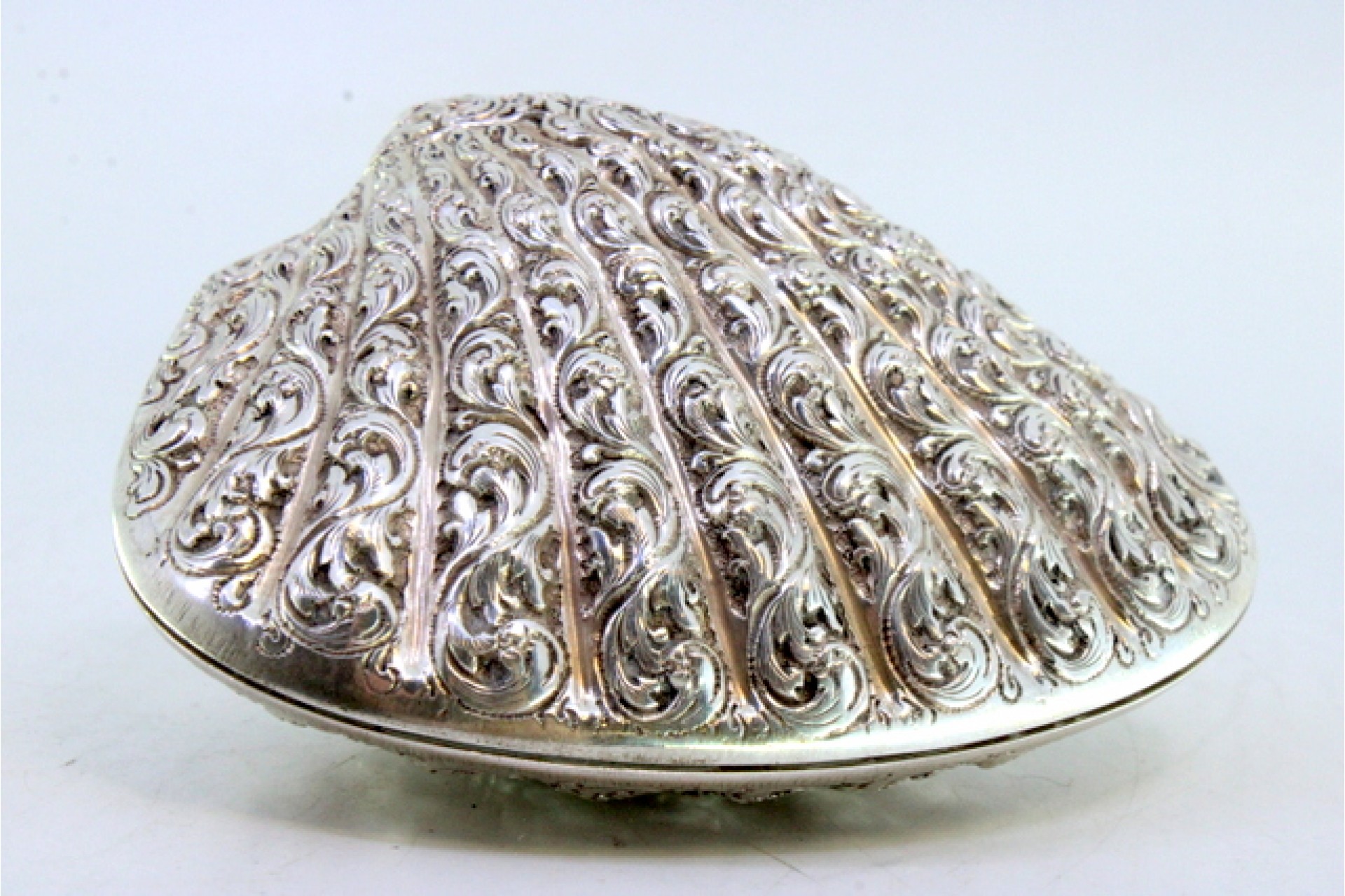 Concha em prata em forma de ameijoa com relevos e dupla tampa basculante.