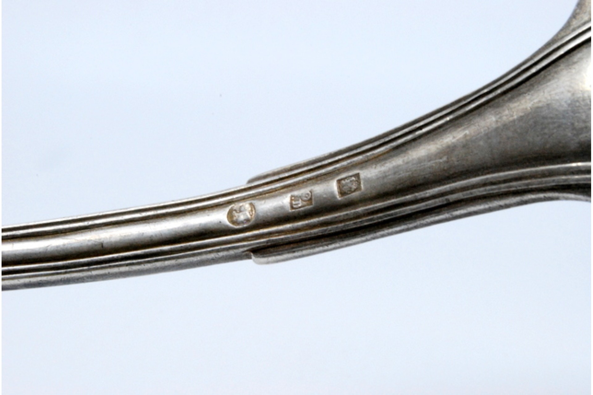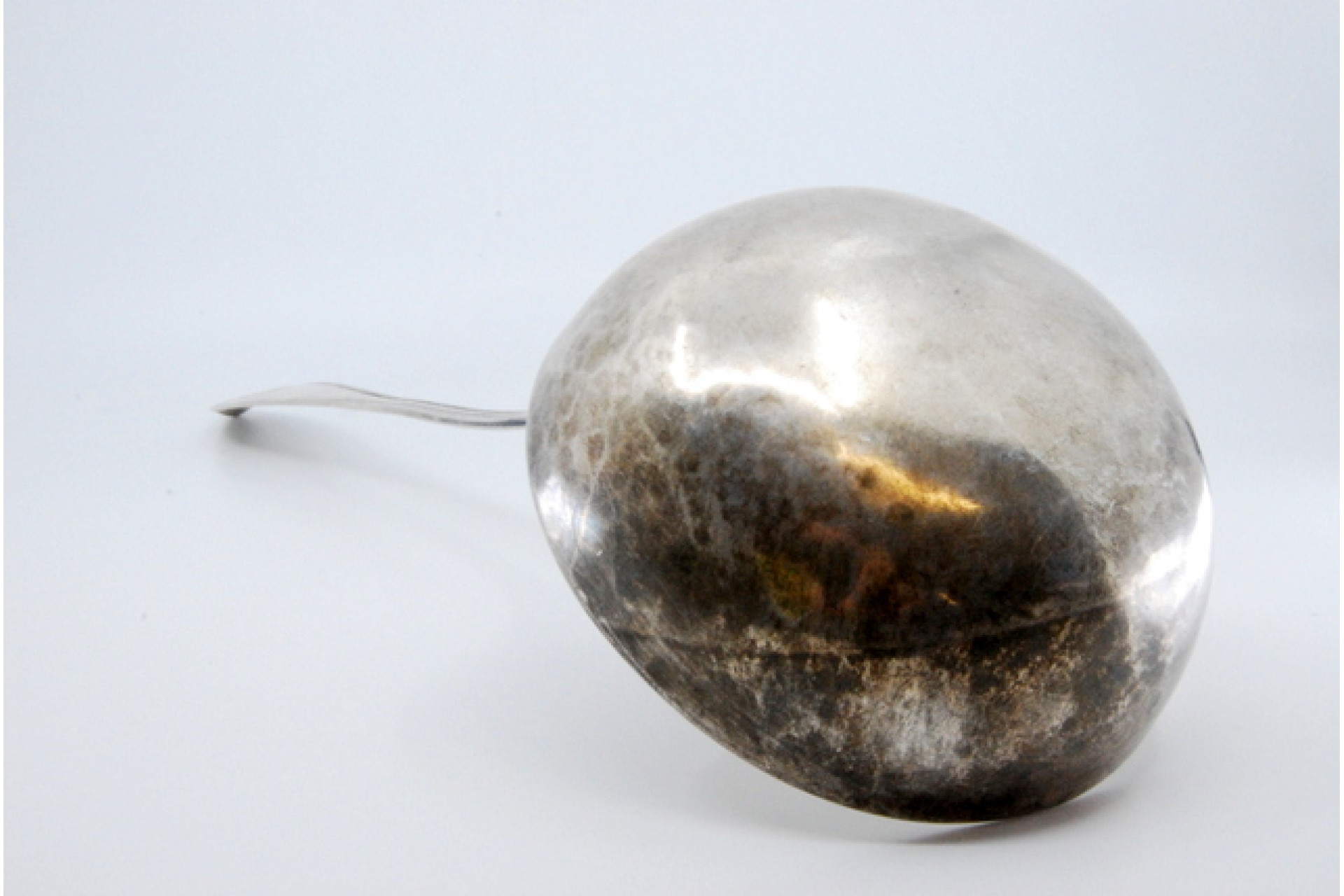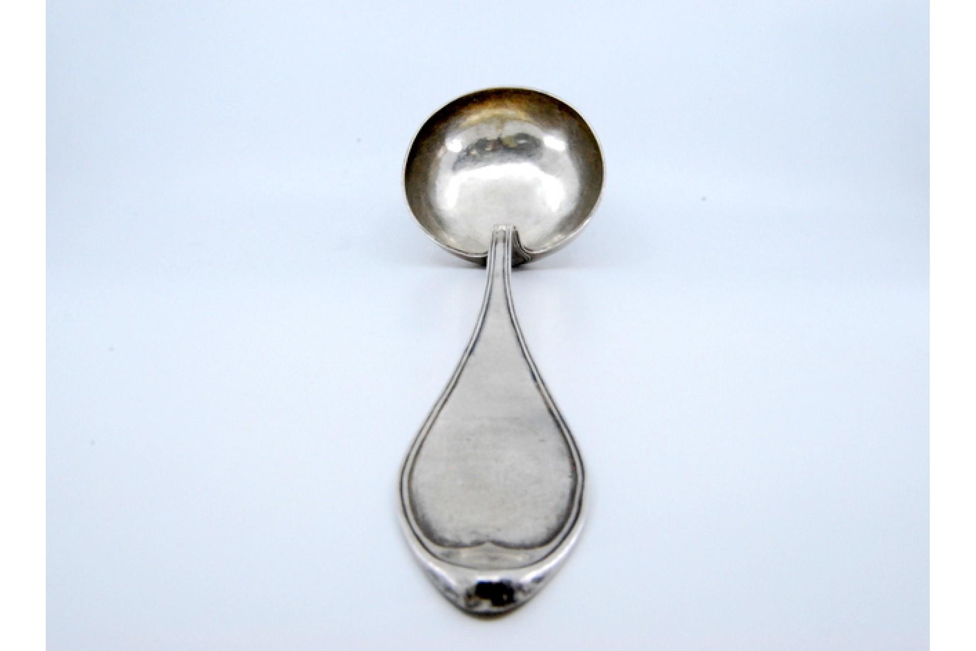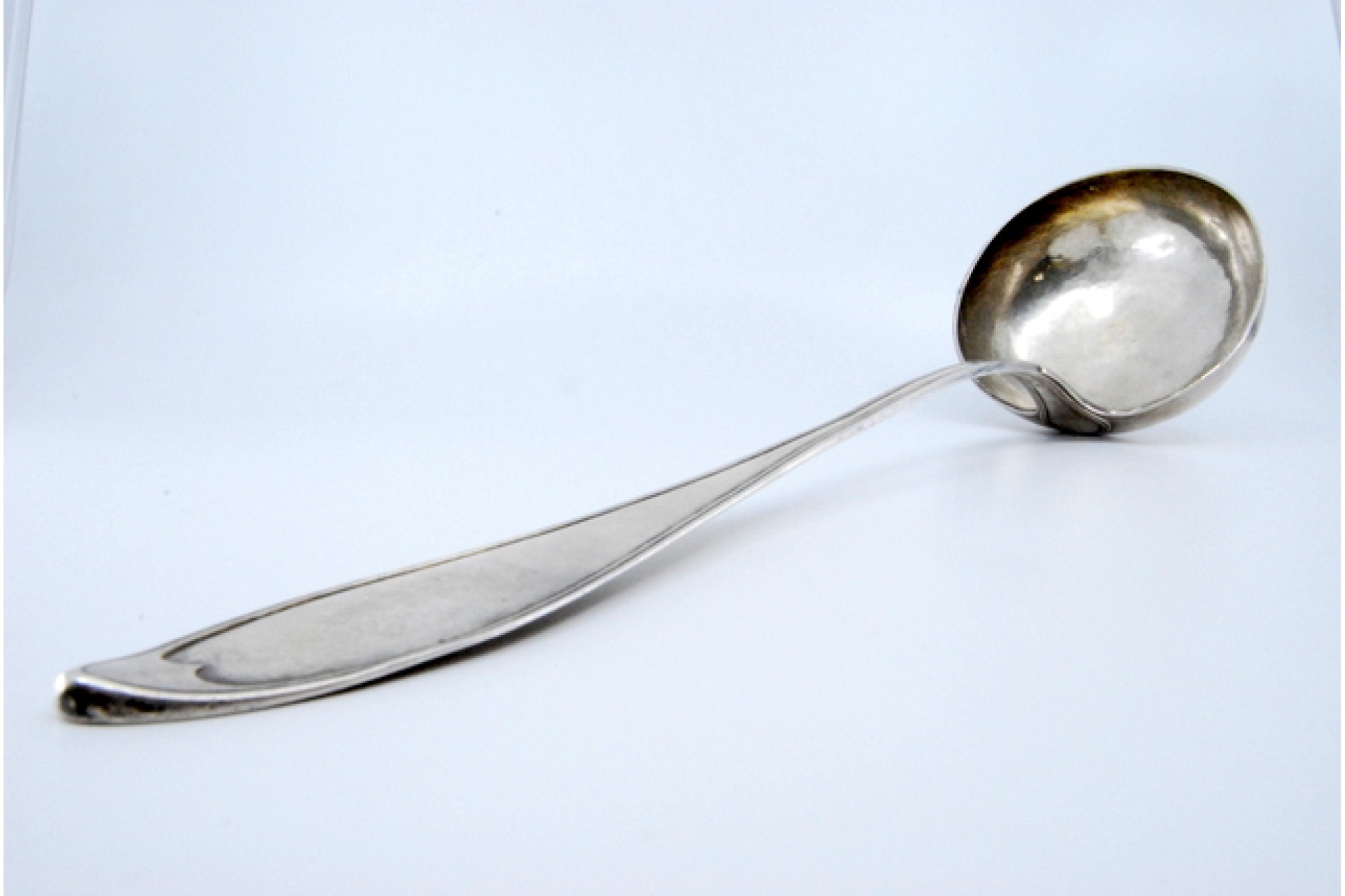 Concha de sopa em prata com frisos ao longo do cabo.