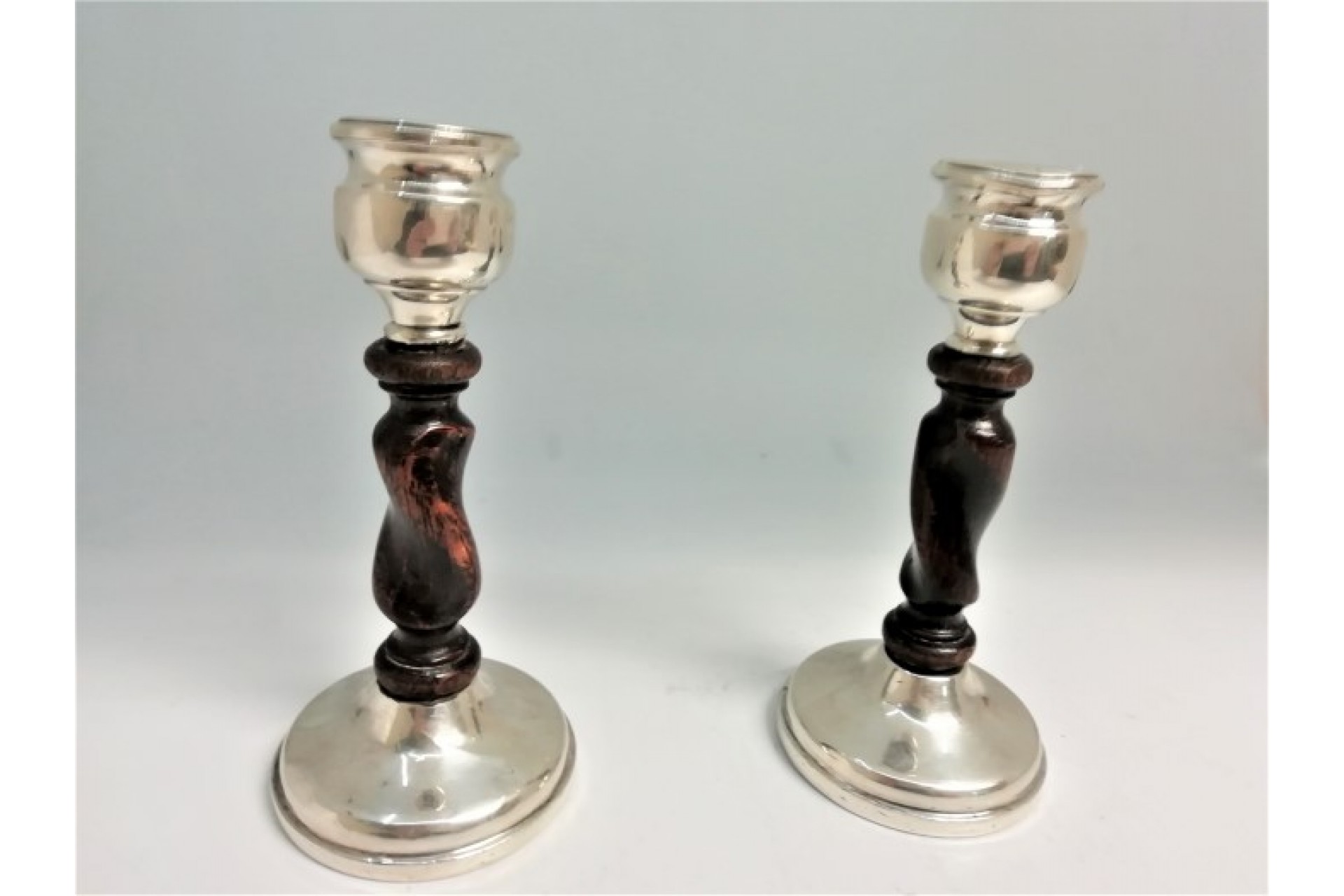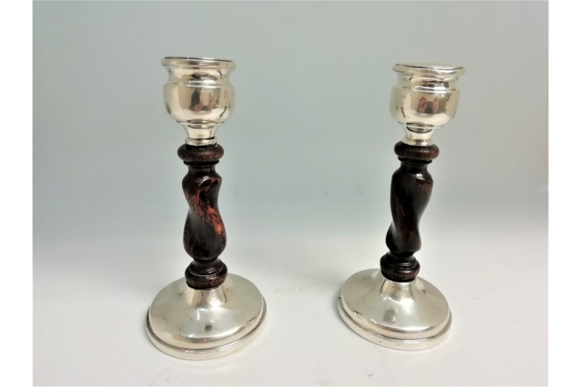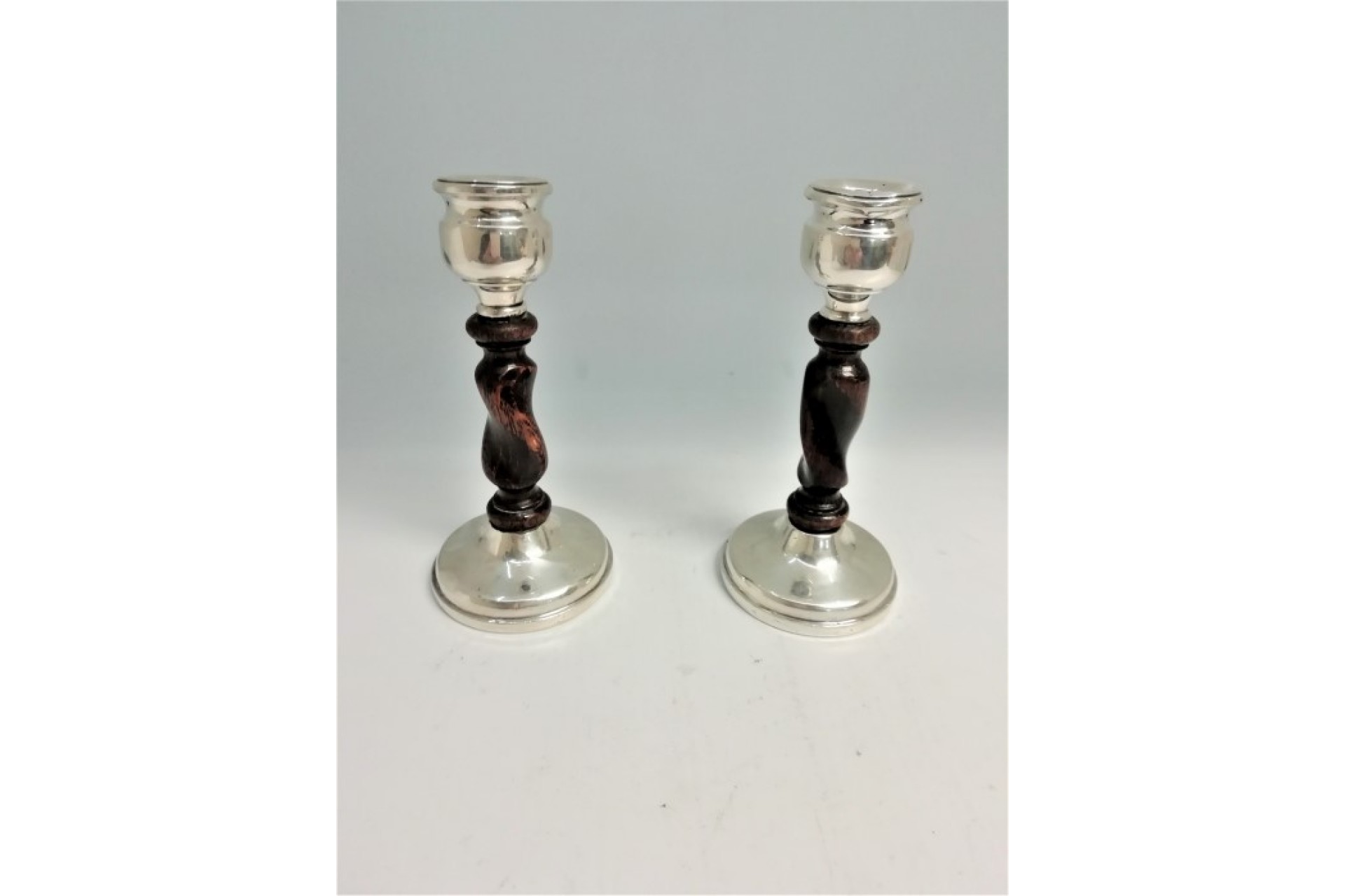 Castiçais em prata com fustes em madeira espiralada e assentes sobre bases circulares.