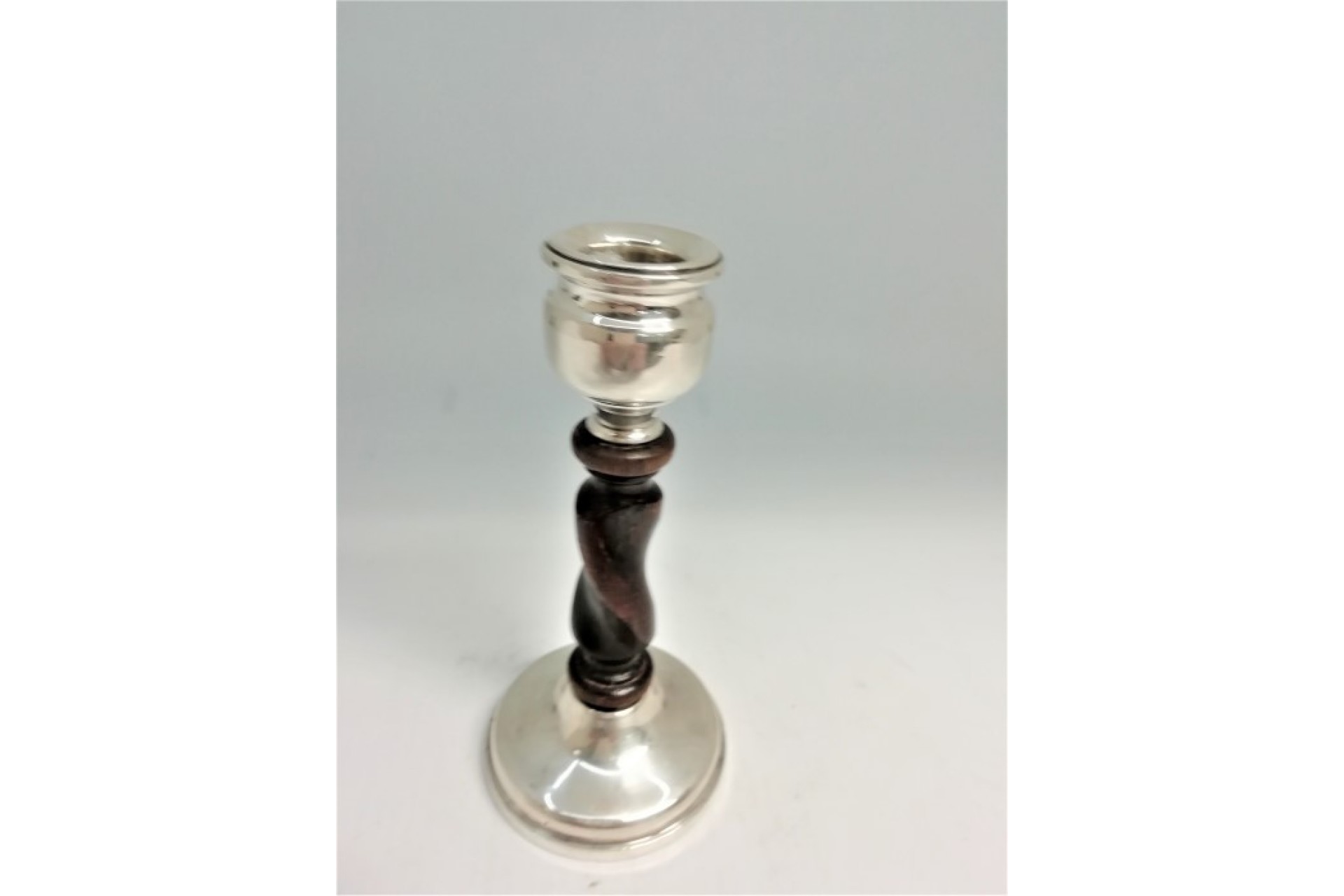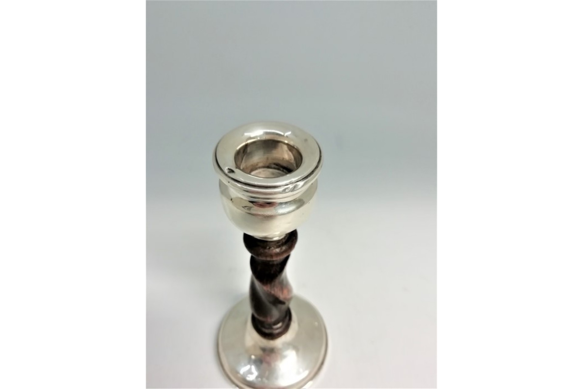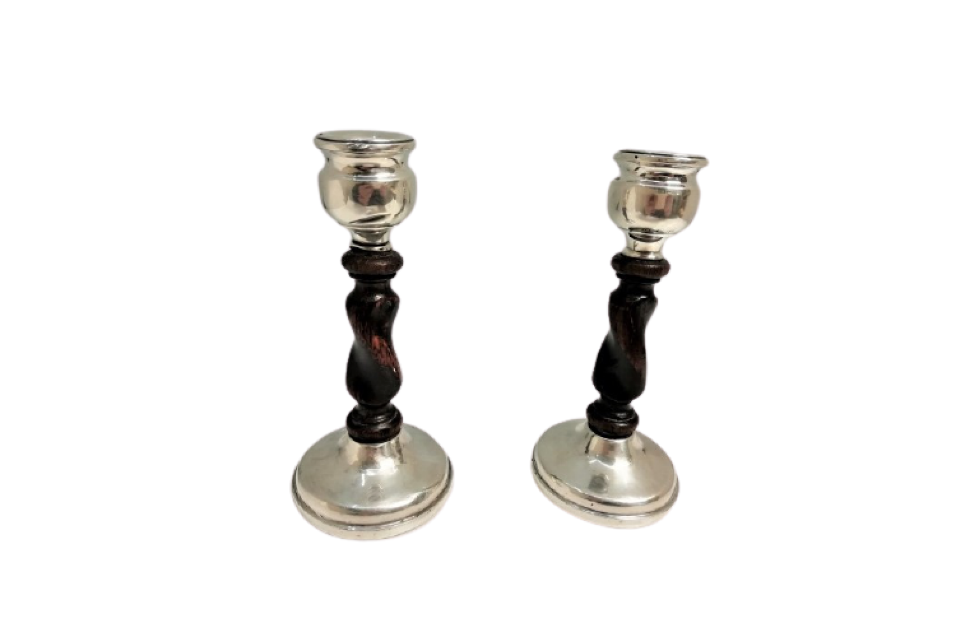 Castiçais em prata com fustes em madeira espiralada e assentes sobre bases circulares.