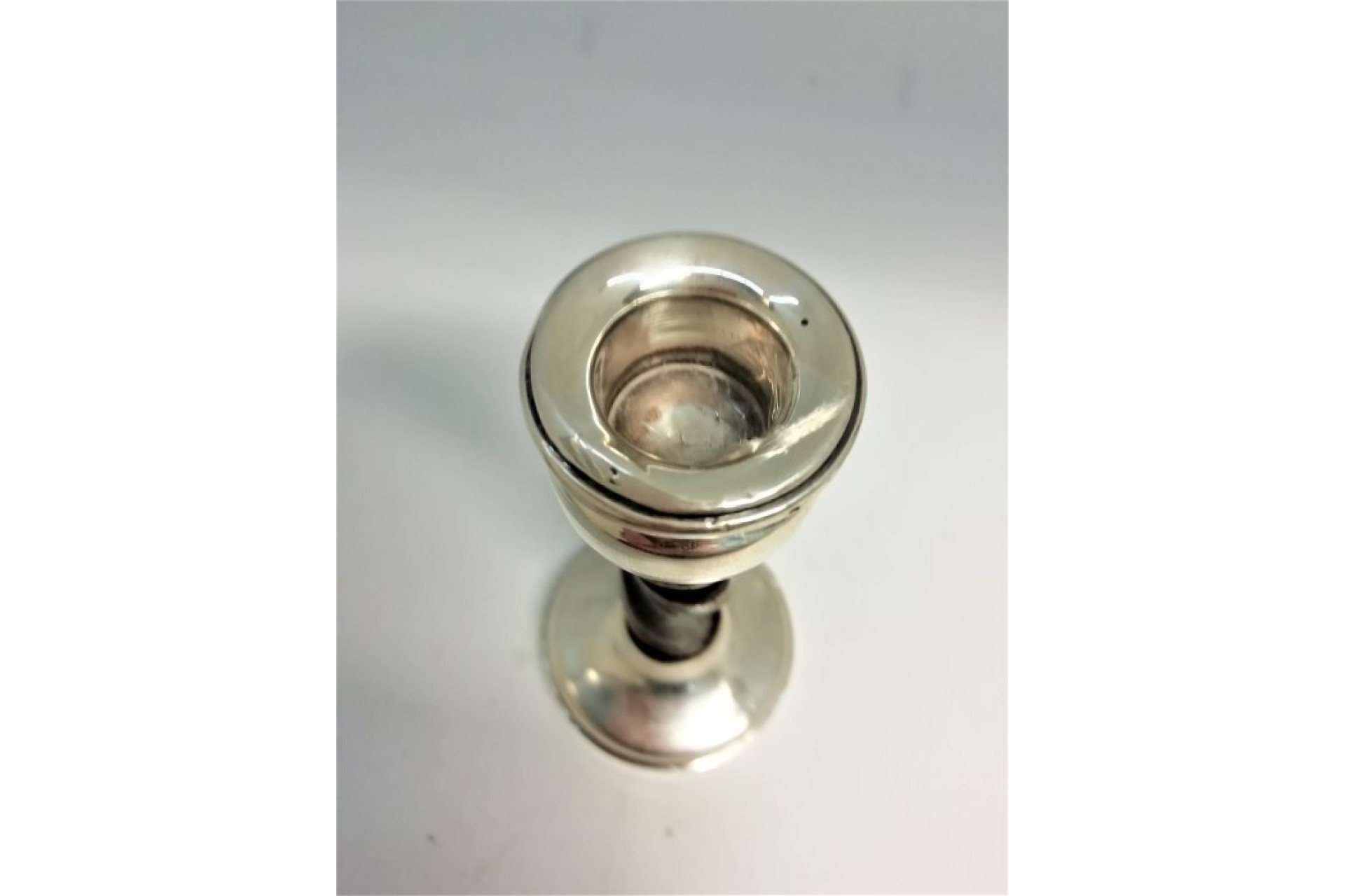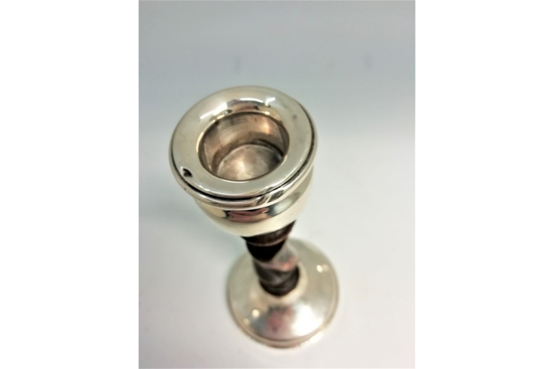 • Descrição: Castiçais em prata com fustes em madeira espiralada e assentes sobre bases circulares.