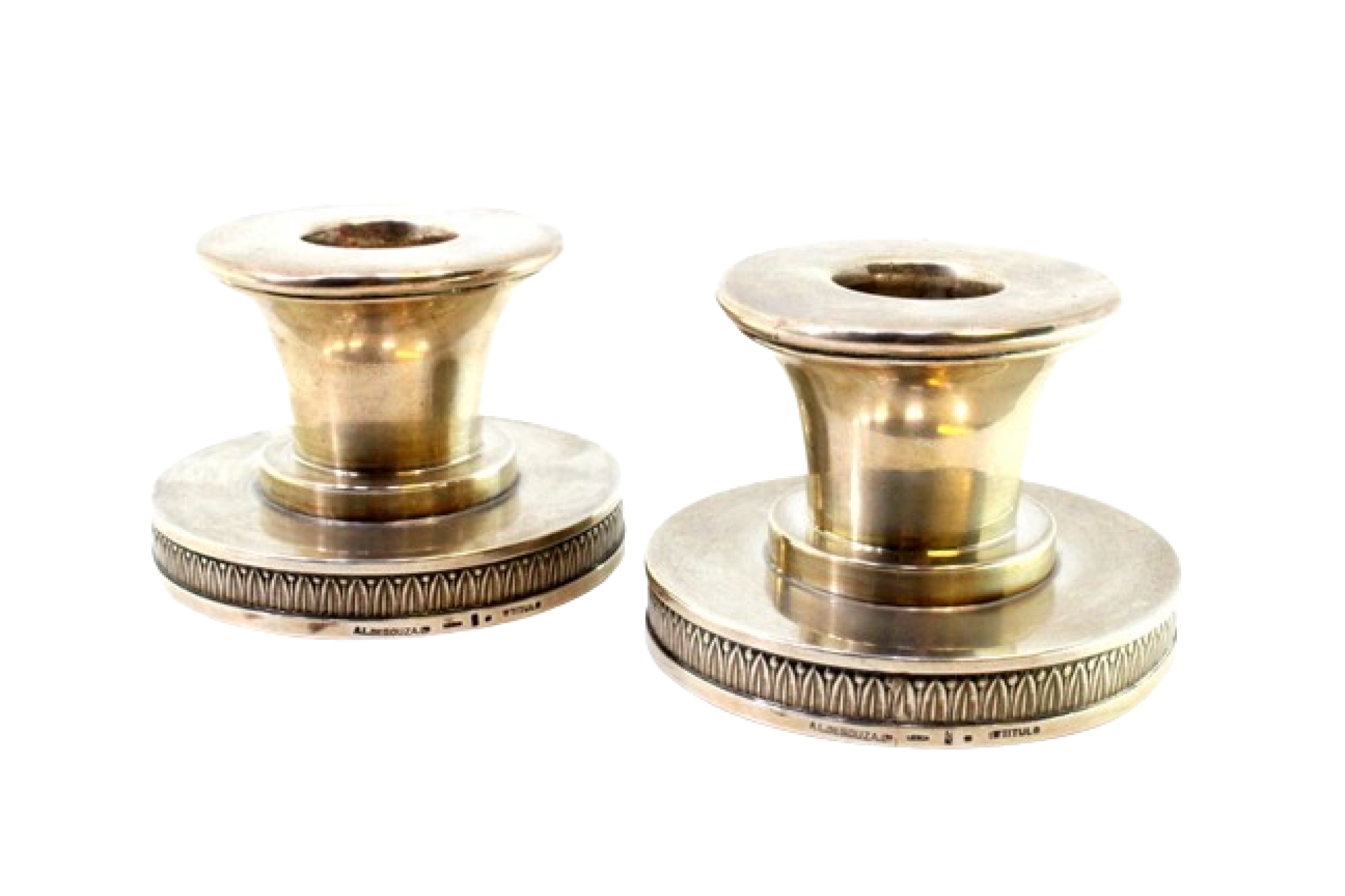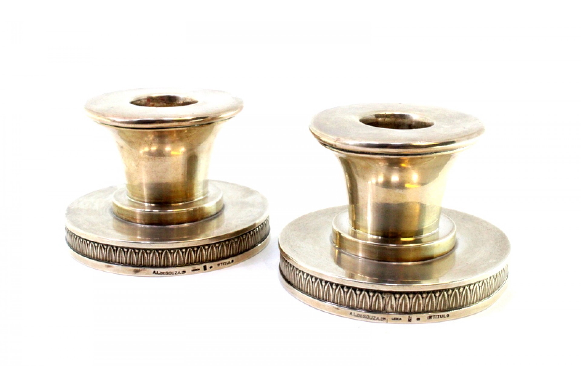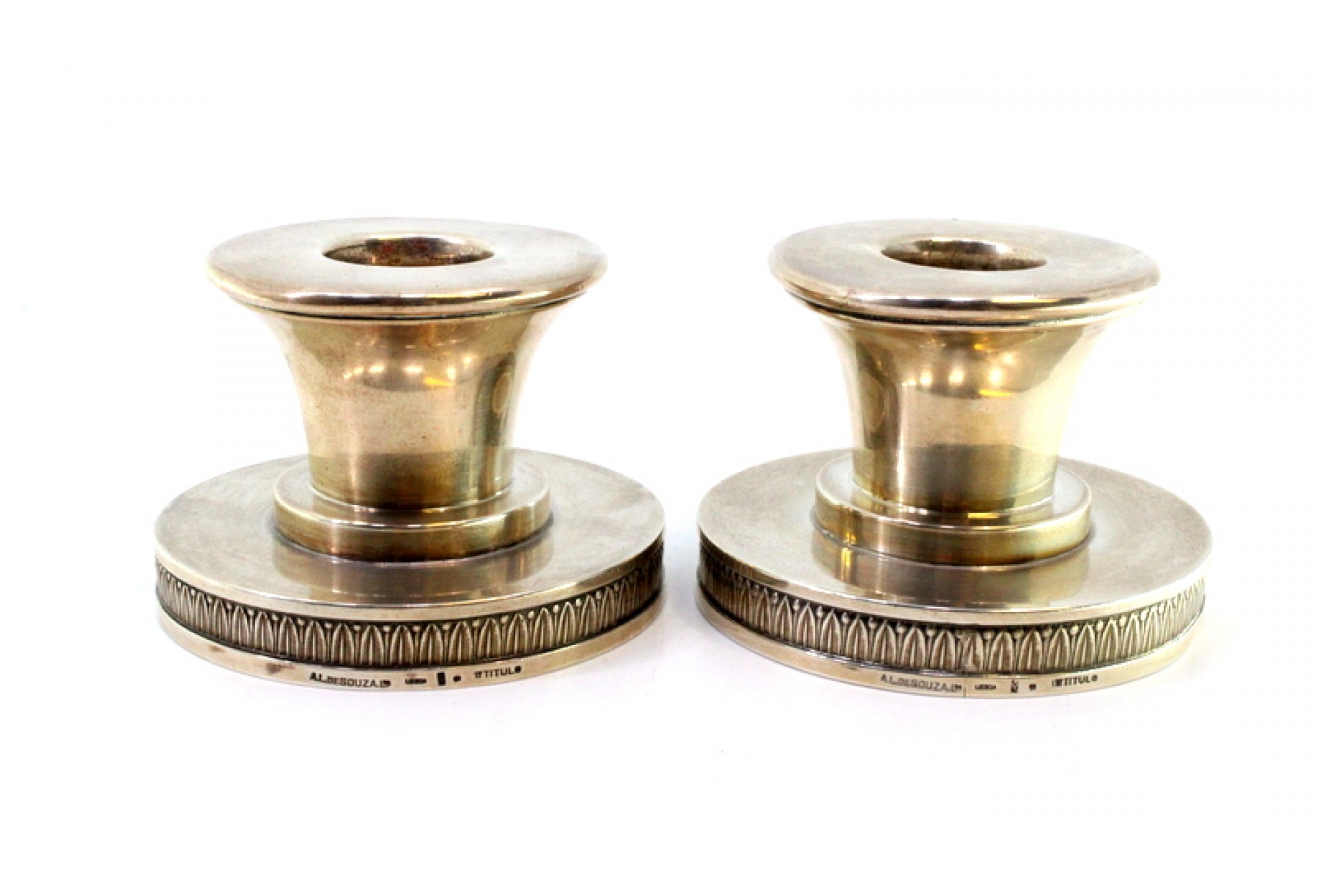 • Descrição: Conjunto castiçais baixos em prata e assentes em bases circulares com frisos relevados.