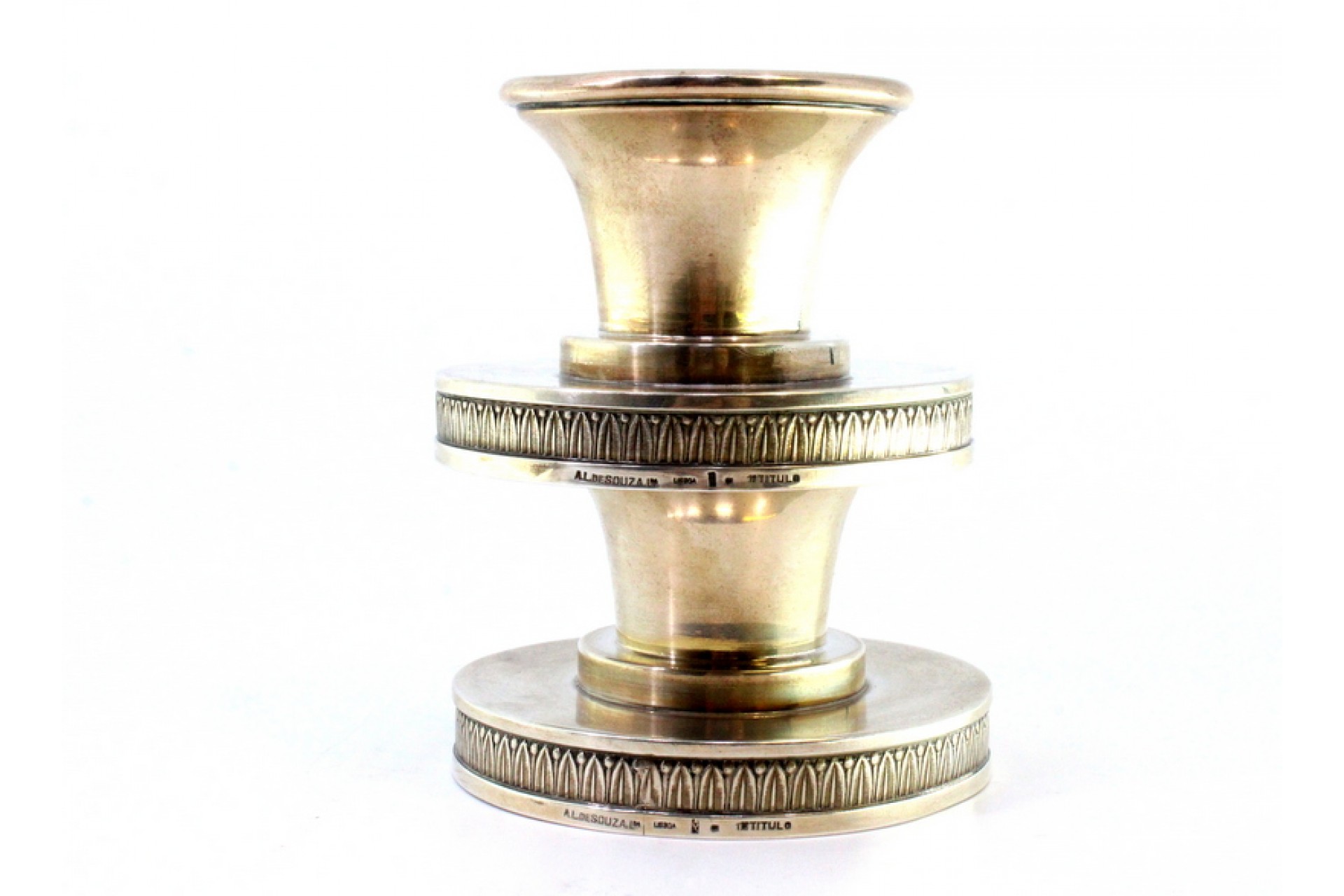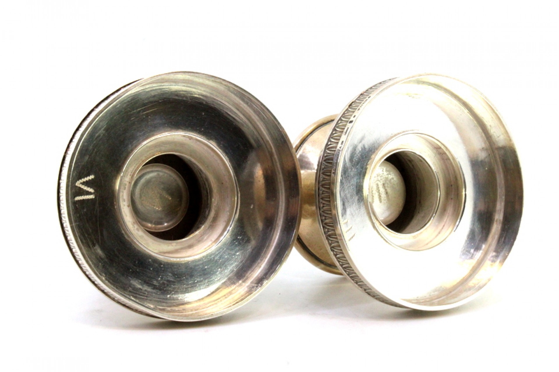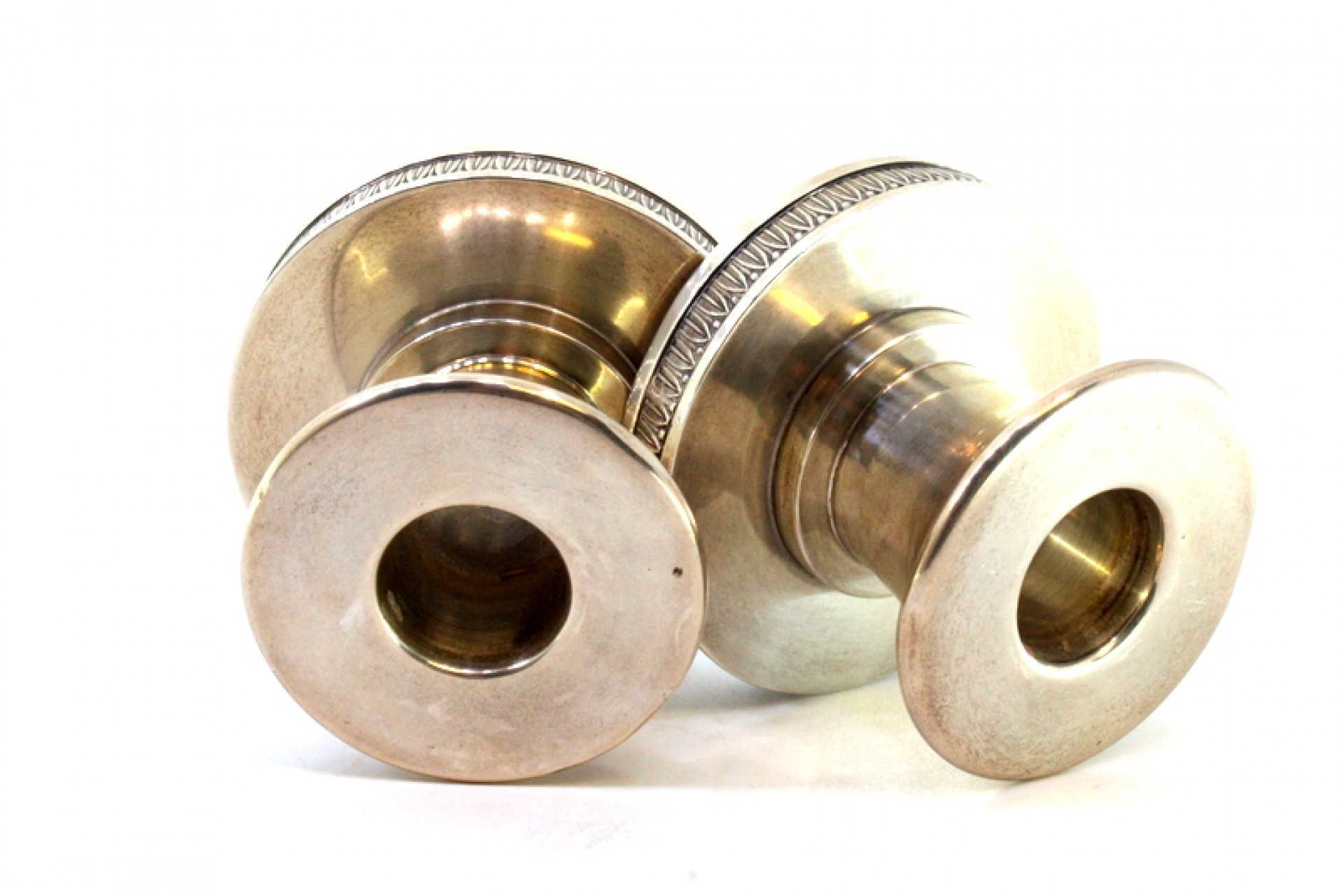 • Descrição: Conjunto castiçais baixos em prata e assentes em bases circulares com frisos relevados.
