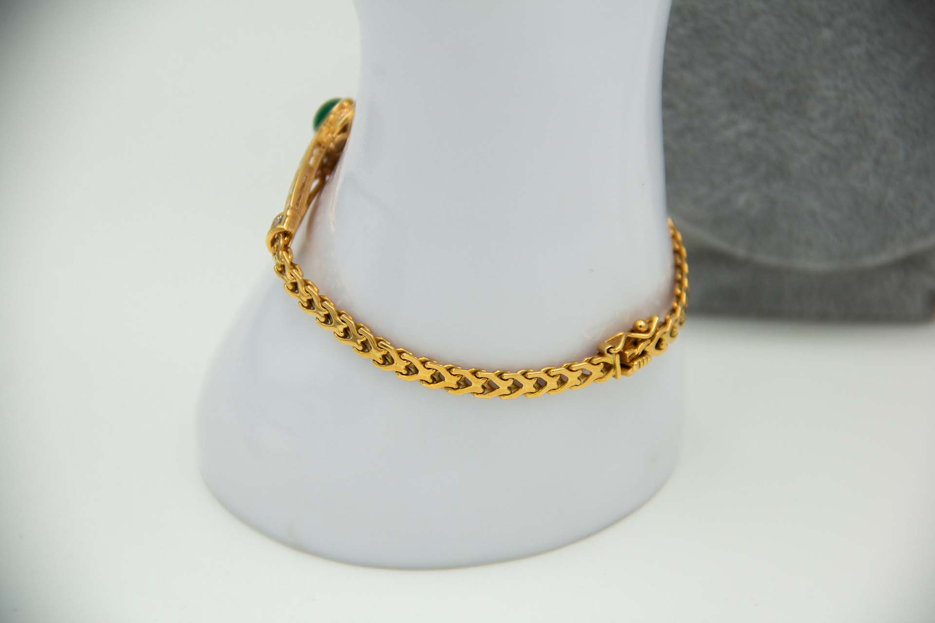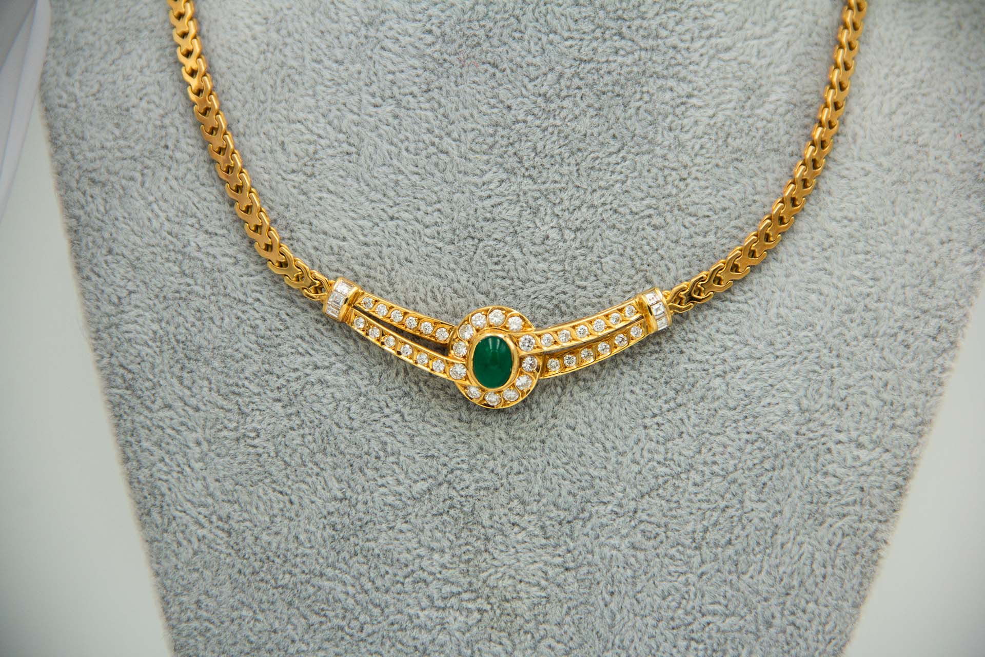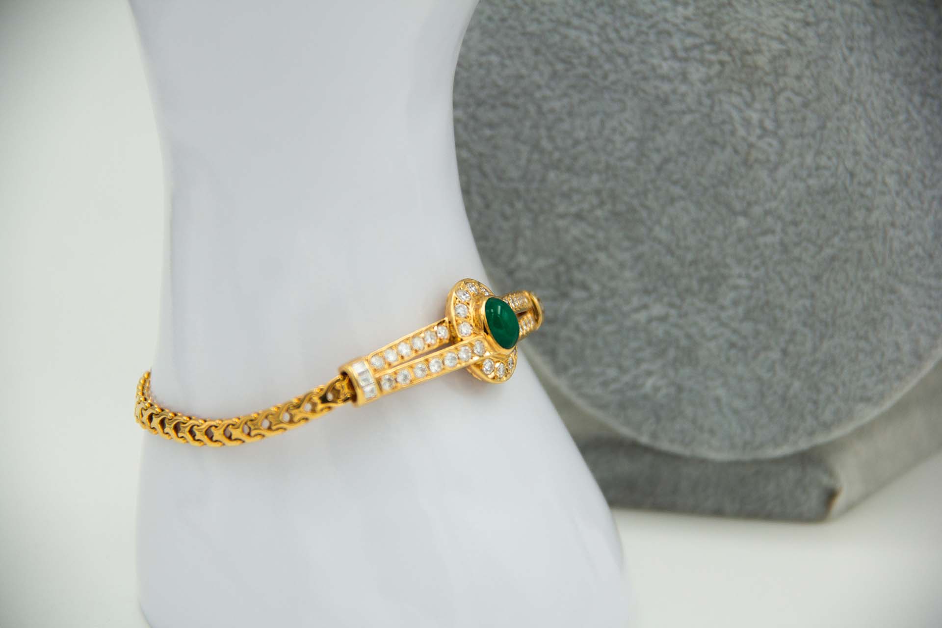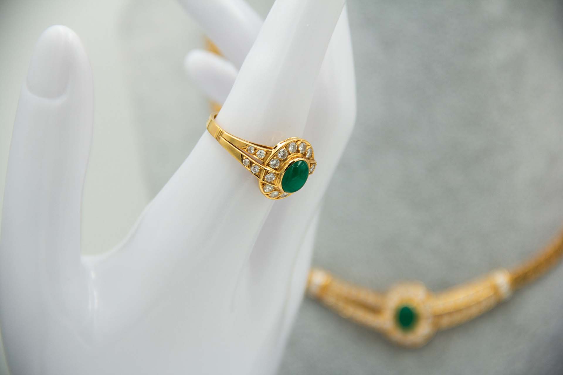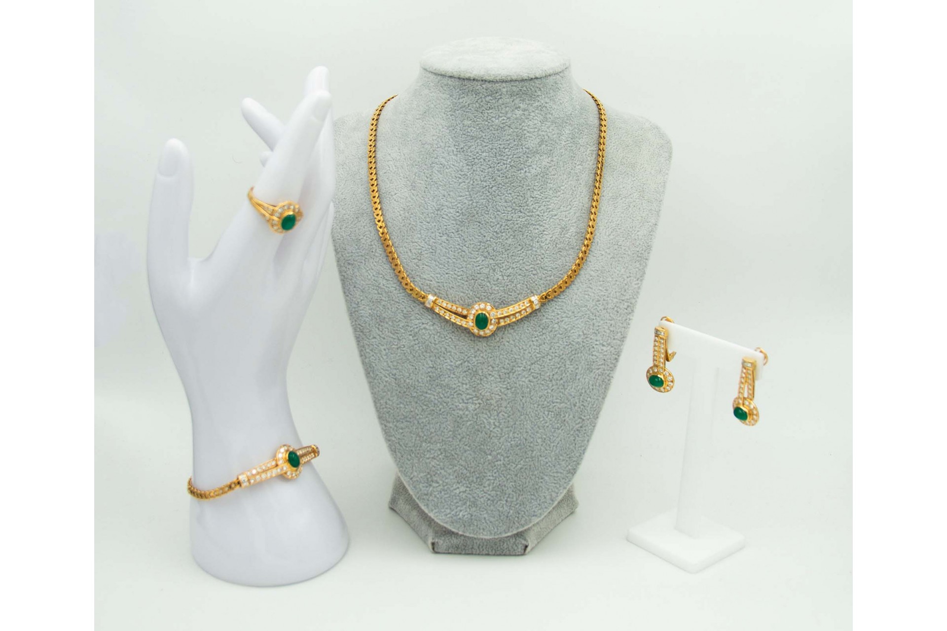 • Descrição: Conjunto composto por gargantilha, pulseira, brincos e anel em ouro com diamantes (66) em talhe brilhante e esmeraldas em talhe cabochão.