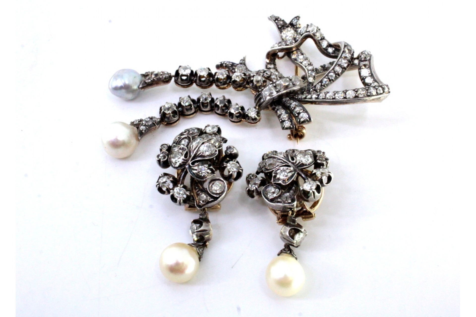 • Descrição: Conjunto de adereço em ouro e prata com diamantes em talhe rosa, composto por par de brincos e pregadeira em forma de laço com pérolas barrocas.