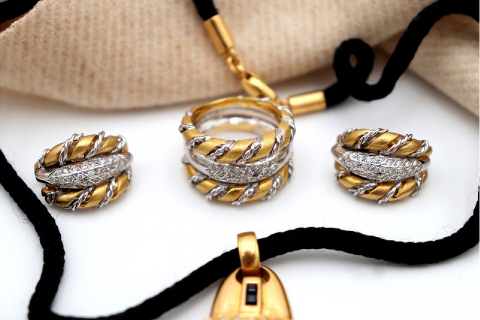 • Descrição: Conjunto de adereço em ouro bicolor composto por colar, brincos e anel com diamantes (86) em talhe brilhante.