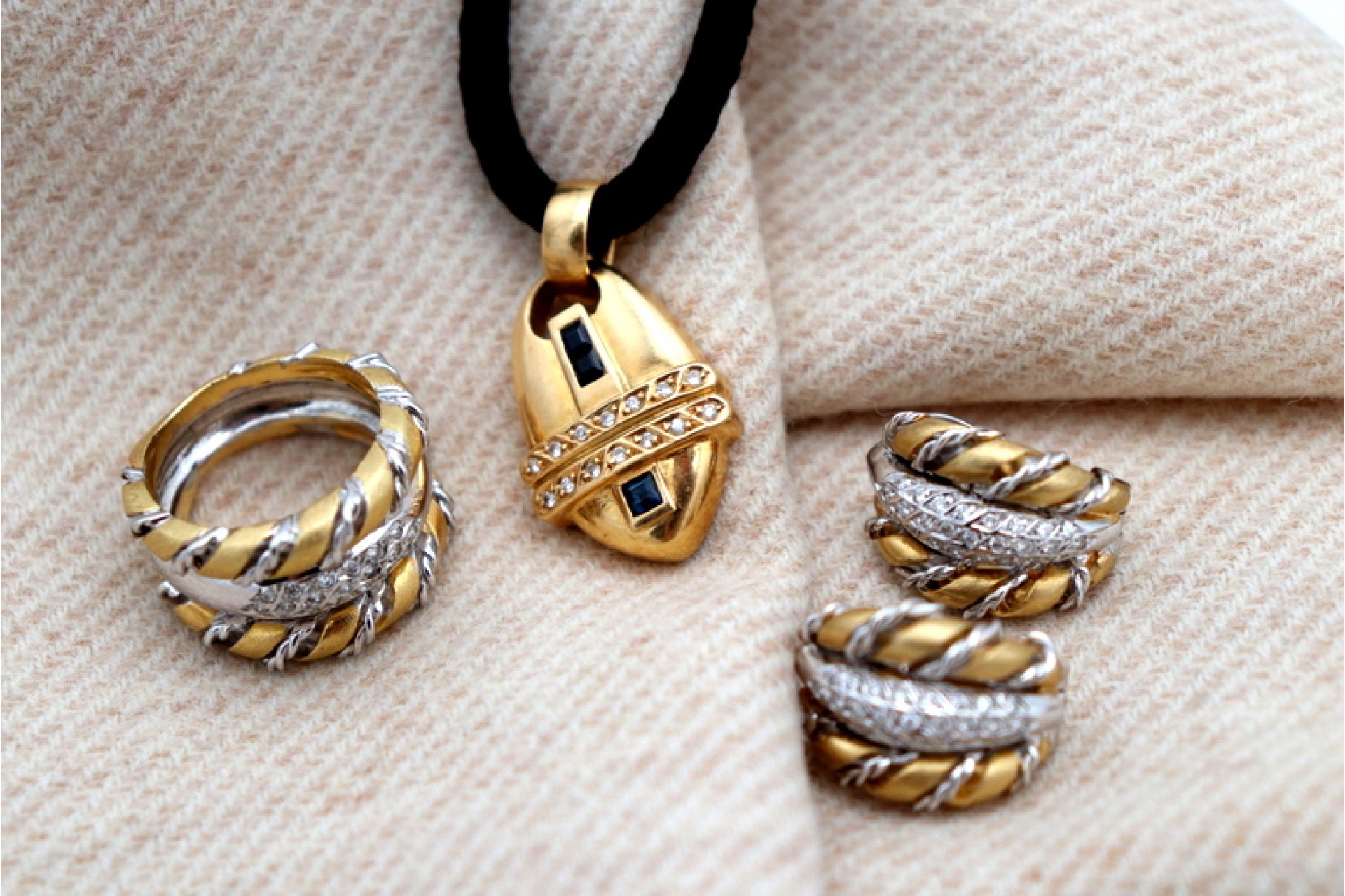 Conjunto de adereço em ouro bicolor composto por colar, brincos e anel